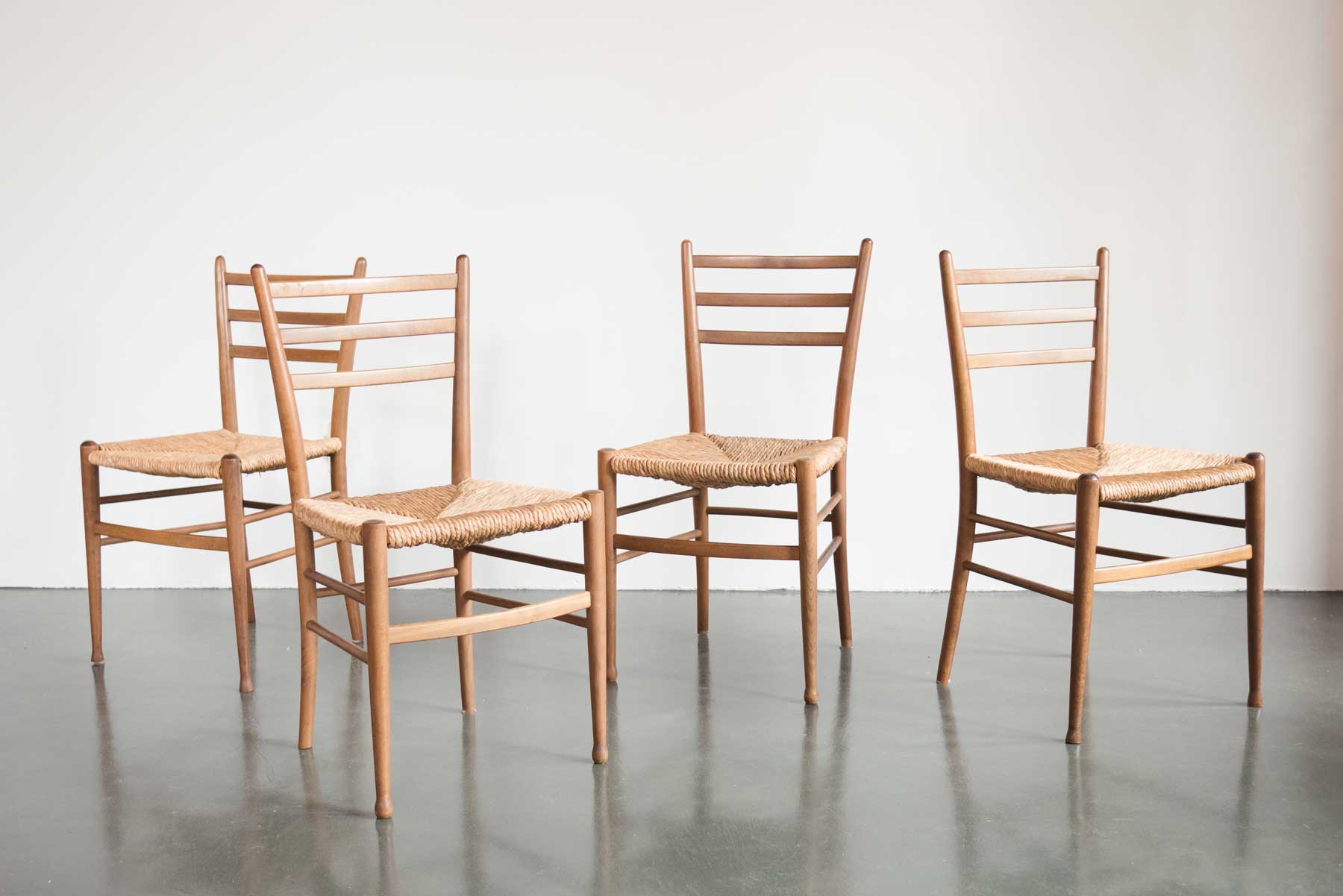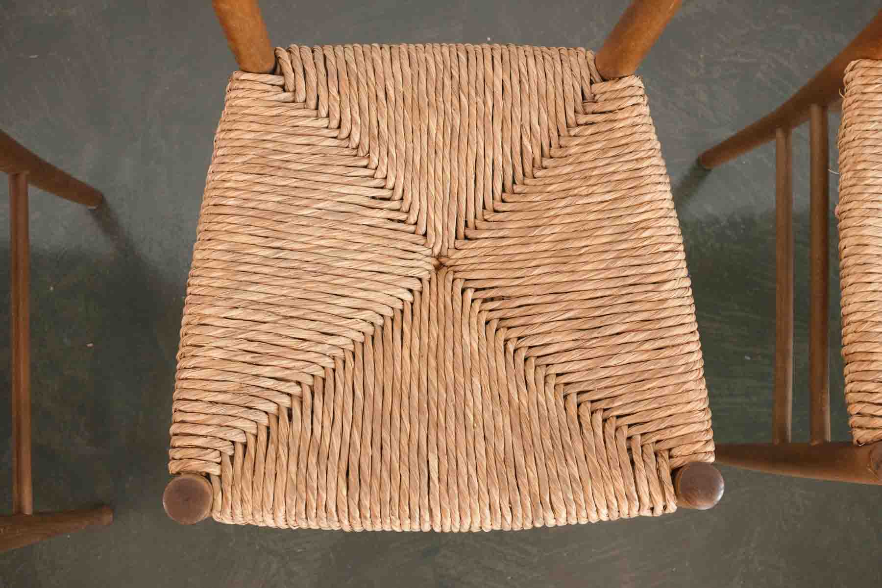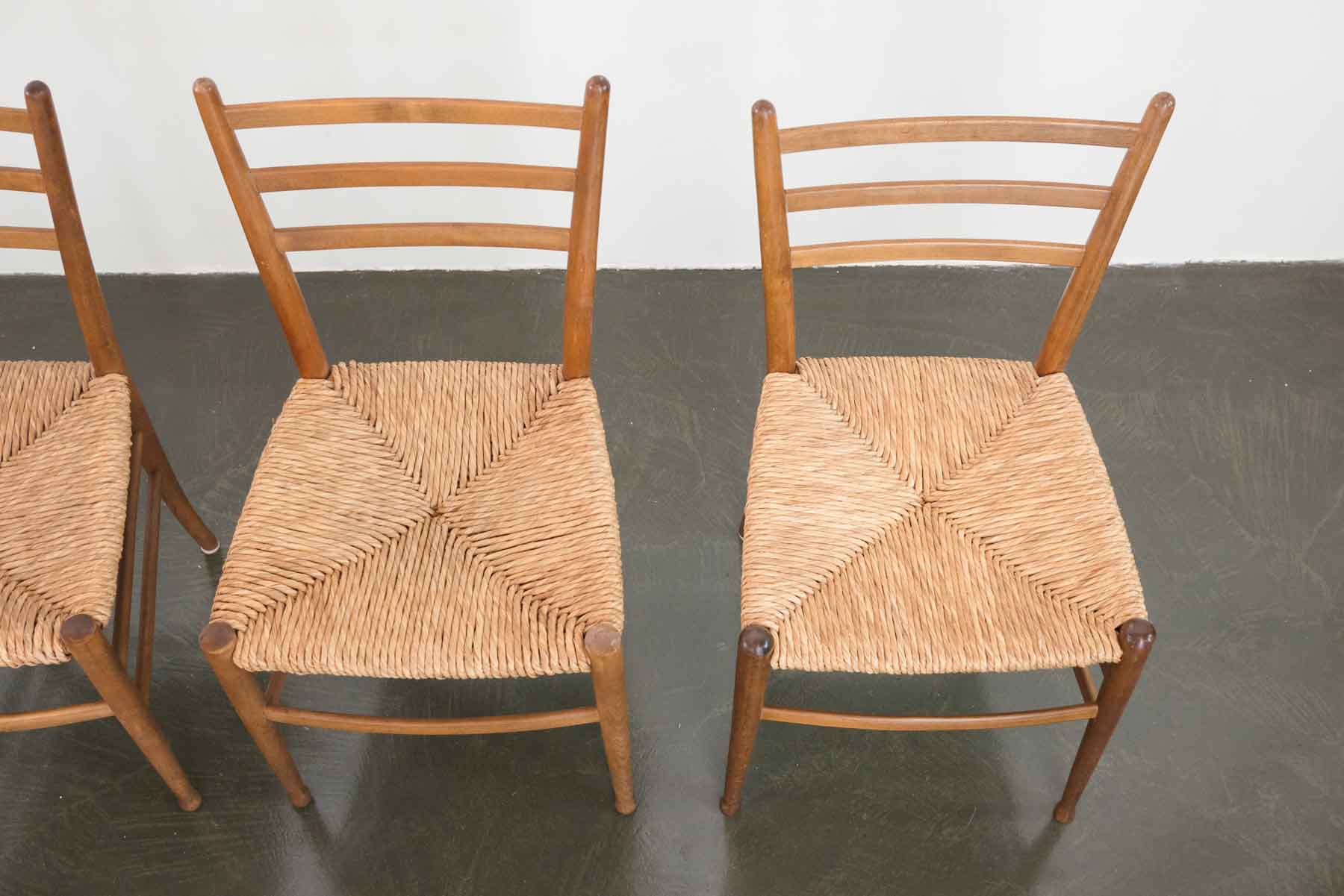 style: Mid Century, dining chairs, set of 4 material: wood (teak), woven rush seat age: vintage, 1960's origin: Made in Italy condition: good, age related wear - see pictures