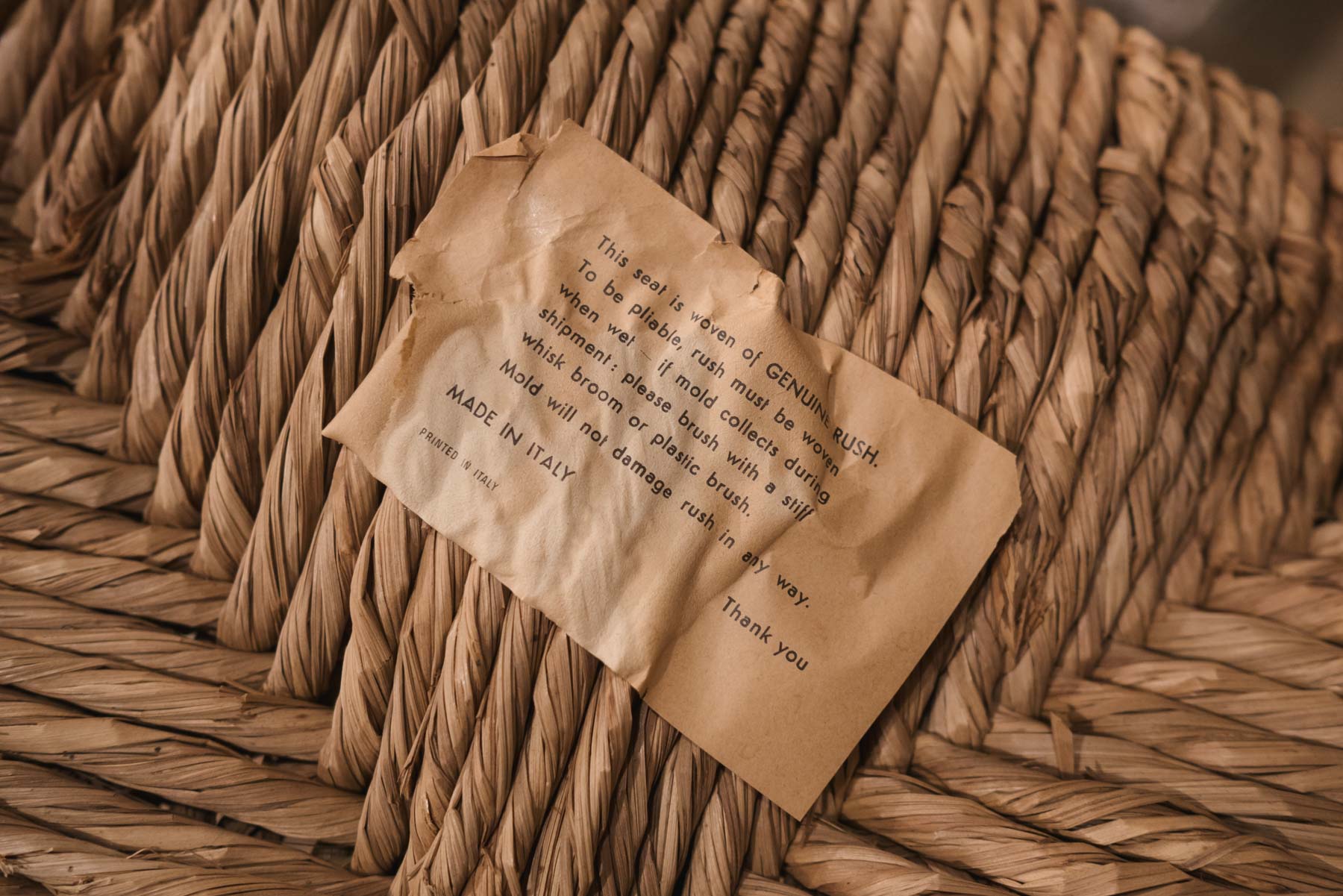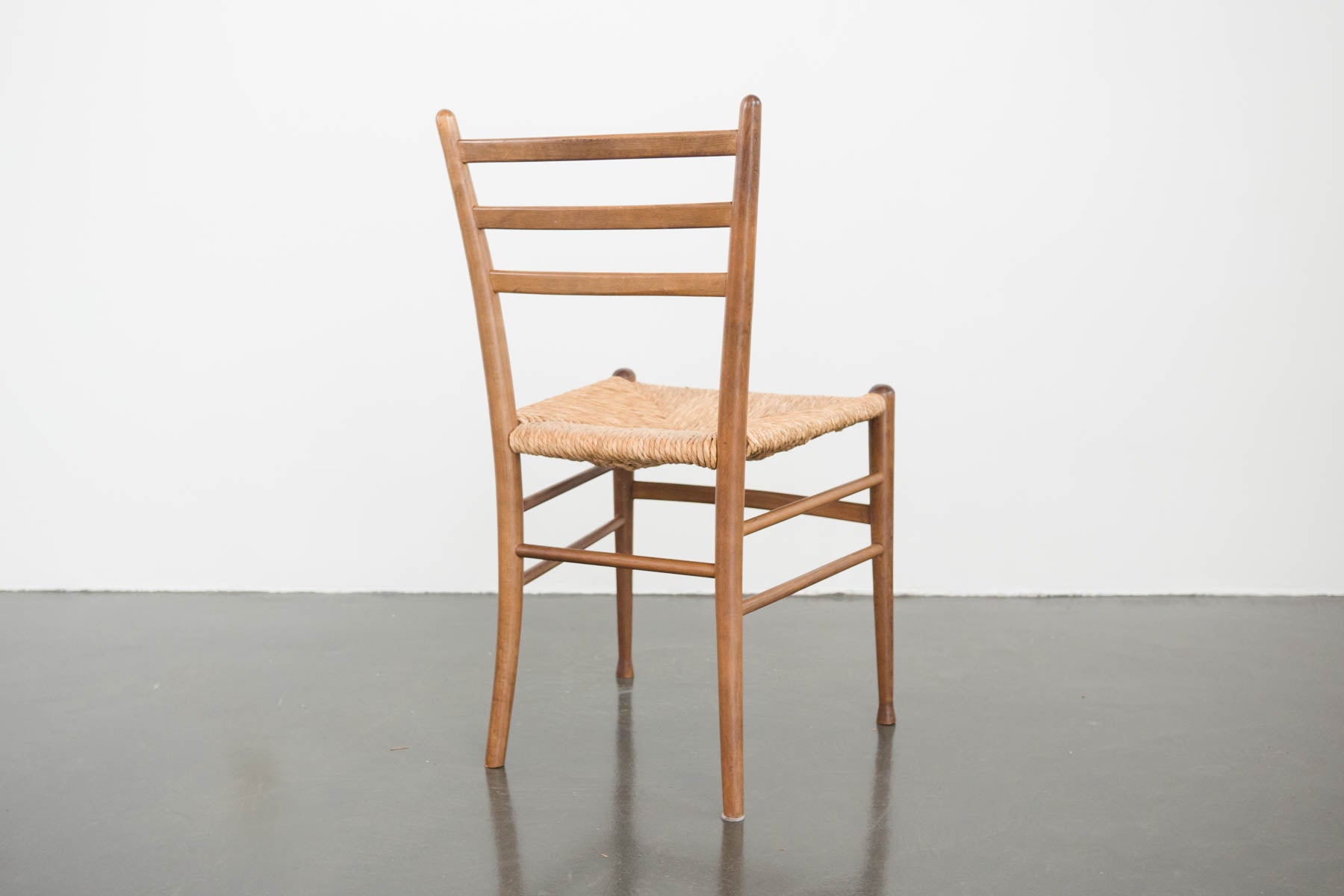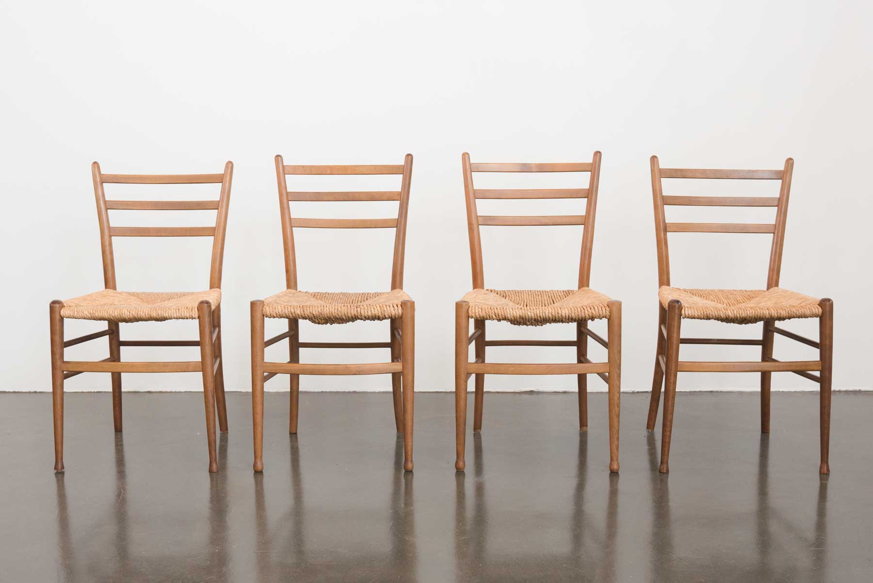 style: Mid Century, dining chairs, set of 4 material: wood (teak), woven rush seat age: vintage, 1960's origin: Made in Italy condition: good, age related wear - see pictures