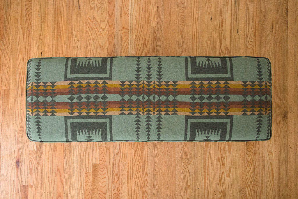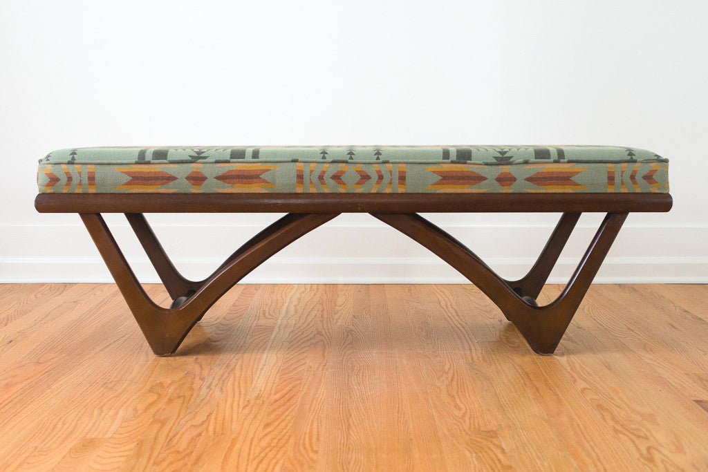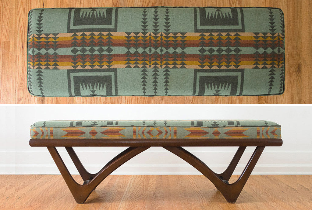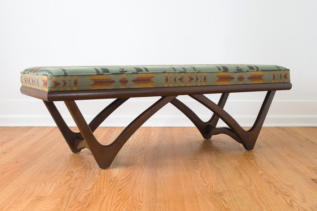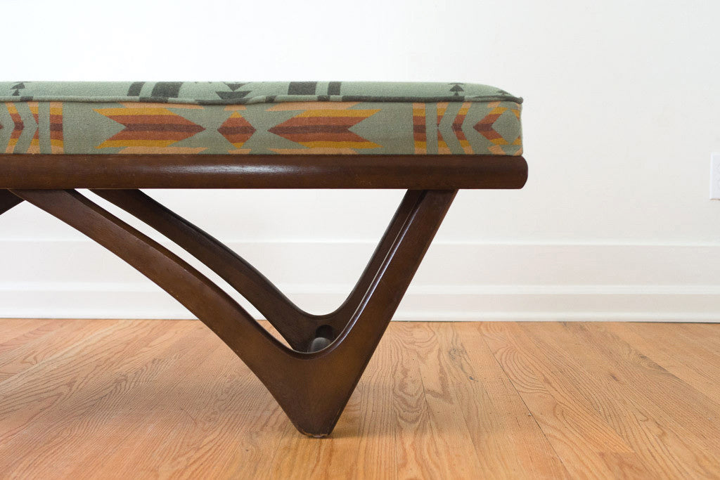 We had a dark wood Adrian Pearsall-esque coffee table upholstered in a Pendleton brand Native American camp blanket fabric. The Pendleton fabric was purchased direct from the mill in Oregon. It's a handsome piece, perfect for extra seating or as a coffee table. It's in excellent condition overall with almost no distressing on the wood and new upholstery.
