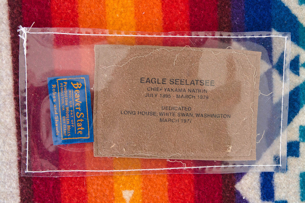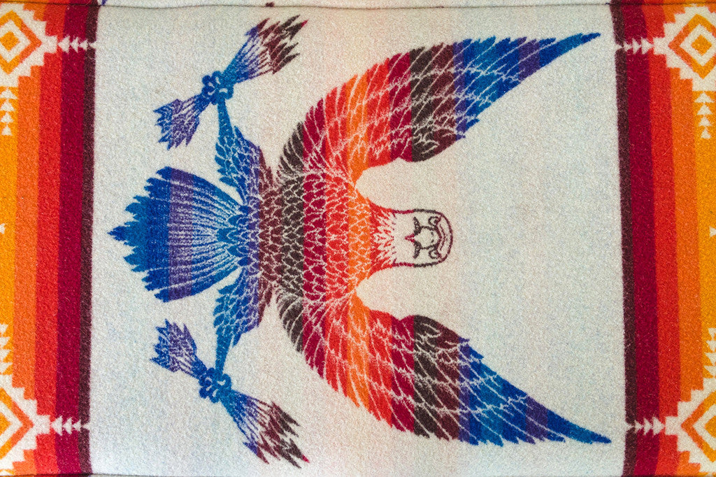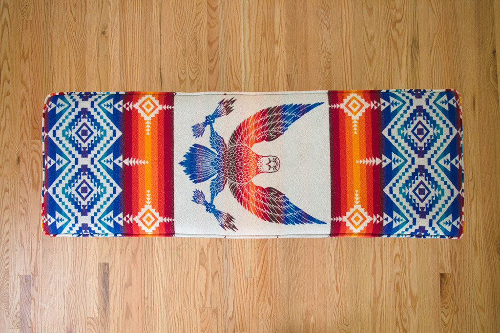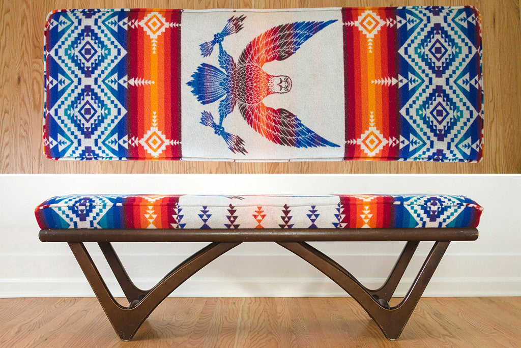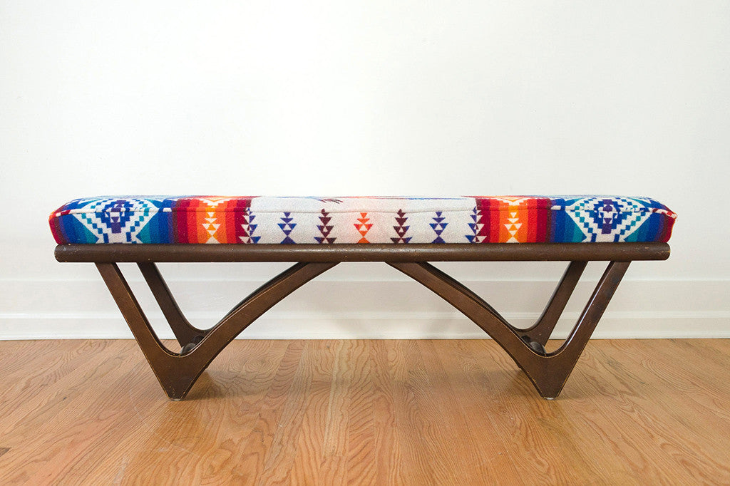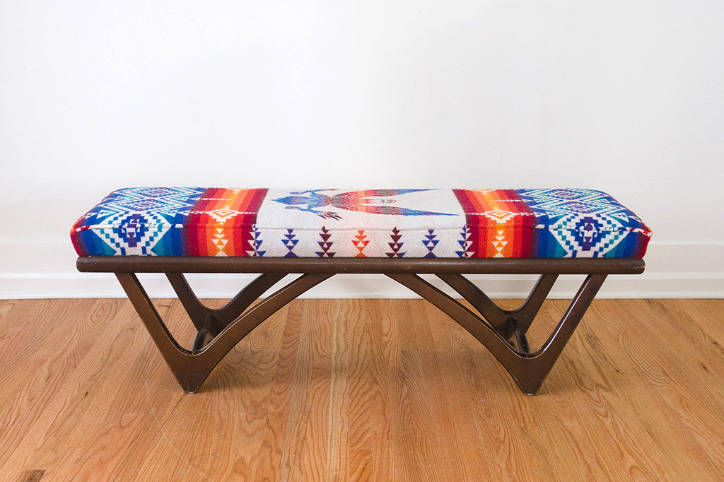We had a dark wood Adrian Pearsall-style coffee table upholstered in a vintage Pendleton brand Native American wool camp blanket. The Pendleton blanket is called Eagle Seelatsee or Chief Yakima, it was part of their Beaver State line. This handsome piece is perfect for extra seating or as a coffee table. It's in excellent condition overall with natural distressing on the wood and like-new upholstery. Please see pictures for detailed condition of this piece.