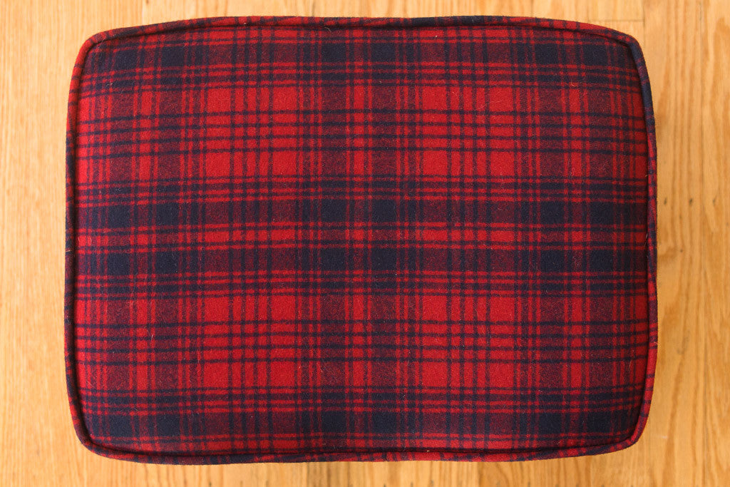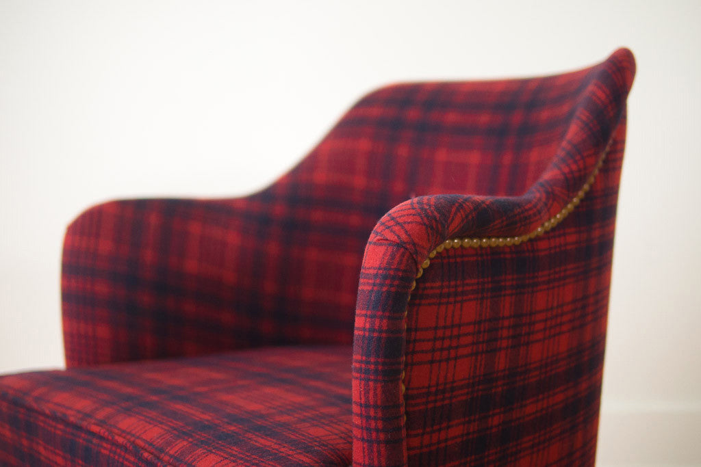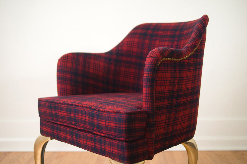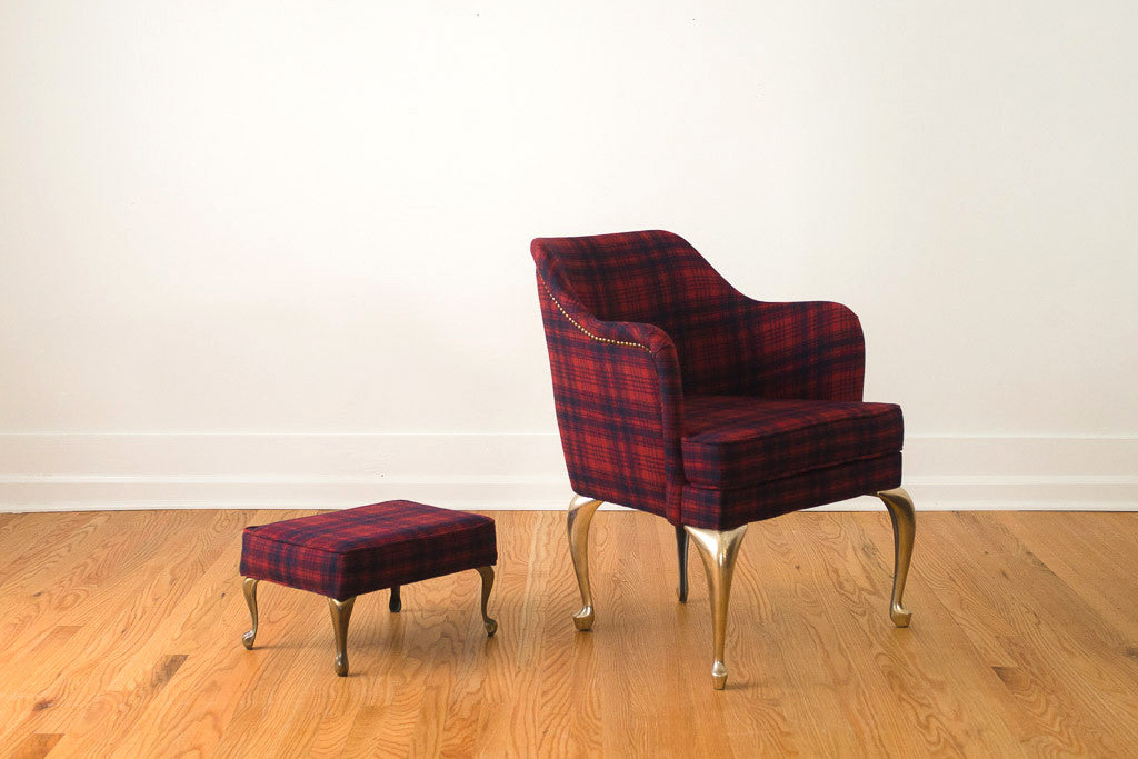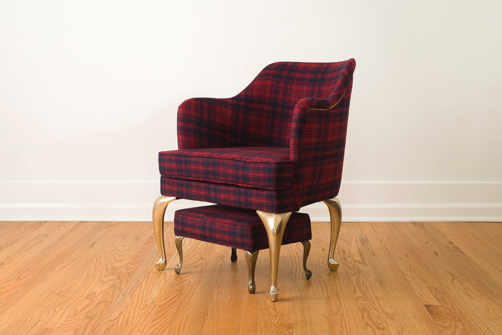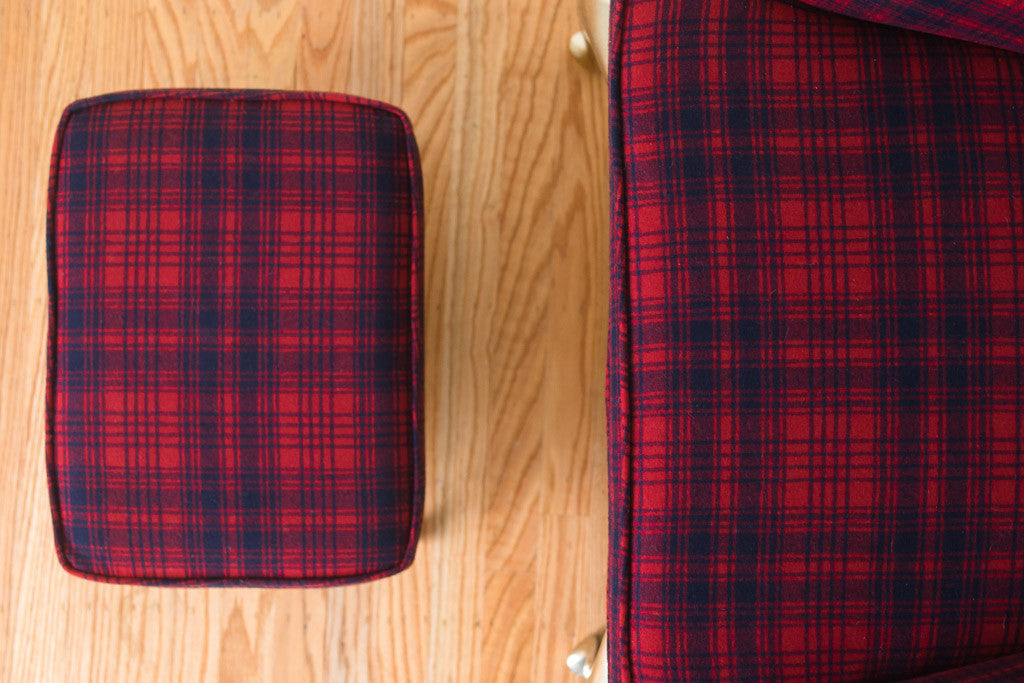 We had this handsome brass-legged chair and ottoman set upholstered in a red and navy Pendleton wool fabric that was purchased directly from the mill in Oregon. The chair has an attached seat cushion and brass nailhead trim around the arms and back. The footstool fits perfectly under the chair. This set is a great petite size and very comfortable.