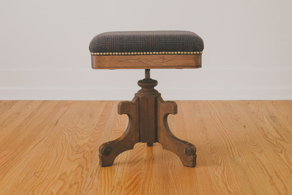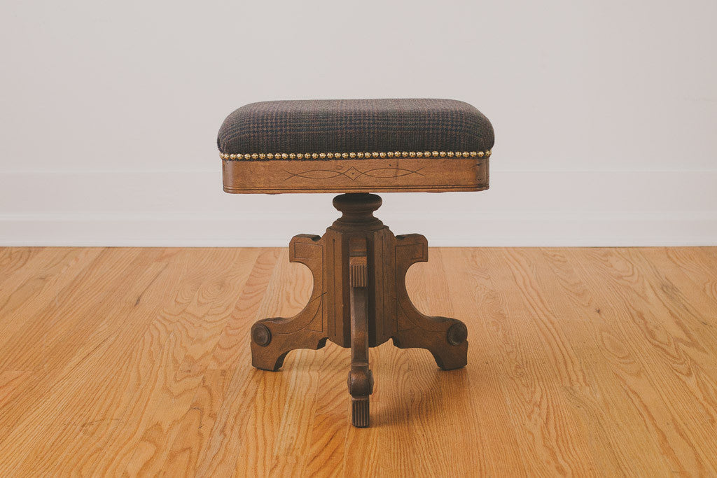 This vintage adjustable height piano stool is upholstered in a dark Pendleton wool fabric with a carved wood frame and hammered brass nailhead trim. It's in overall excellent shape with age related wear. Please see pictures for detailed condition.