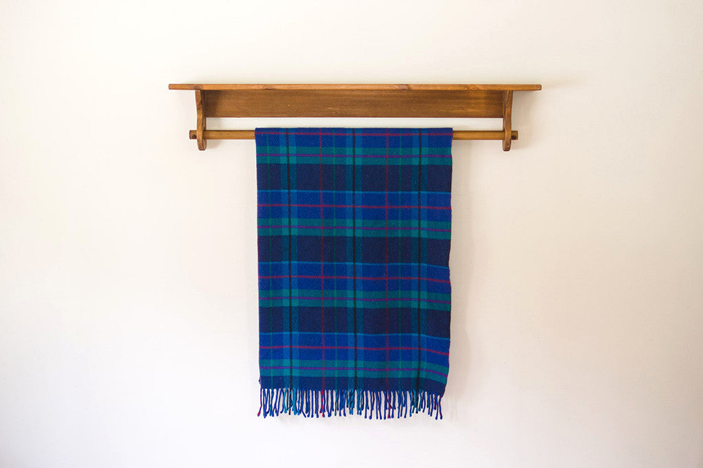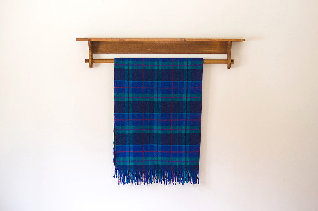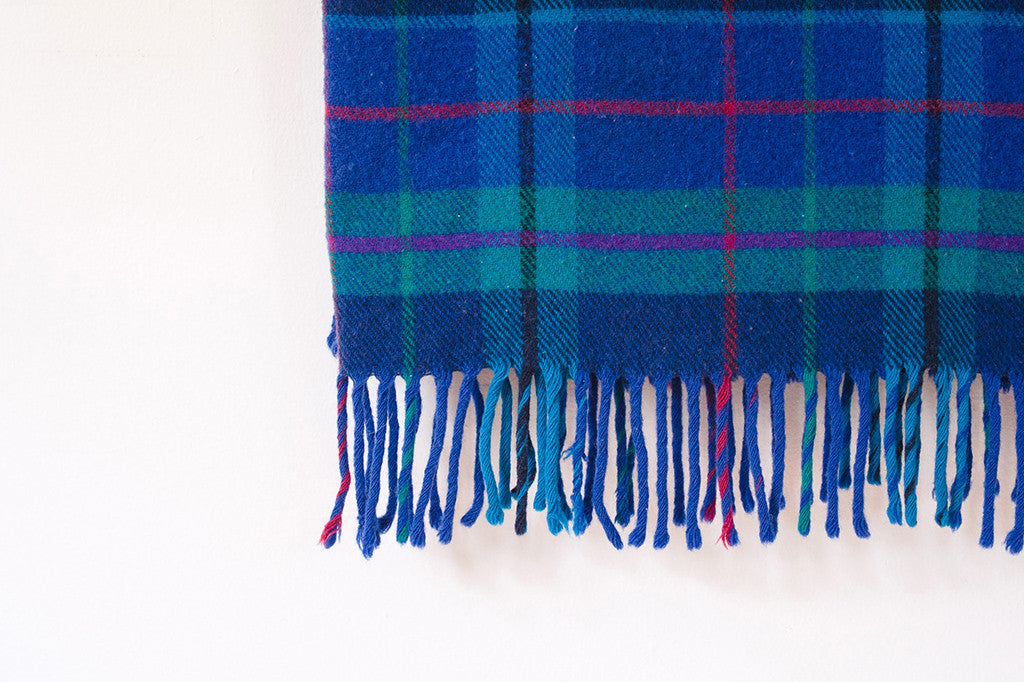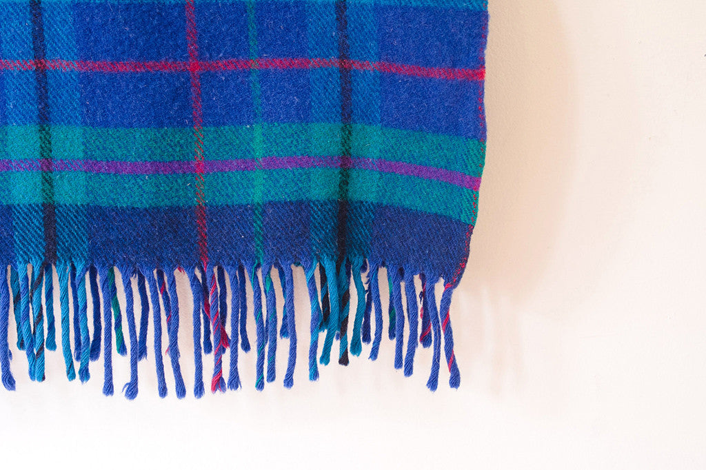 Oregon. It's a blue, teal, black, purple and pink tartan plaid wool in