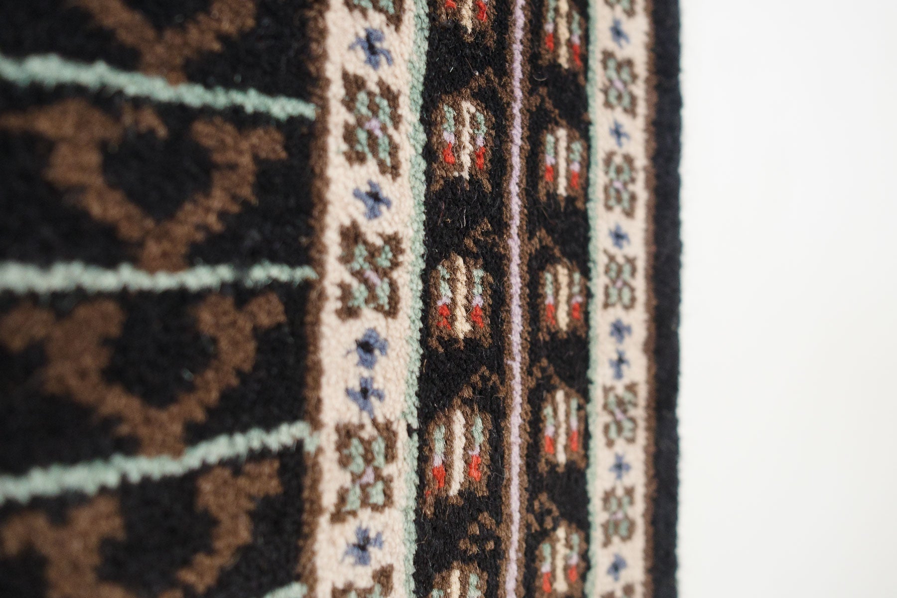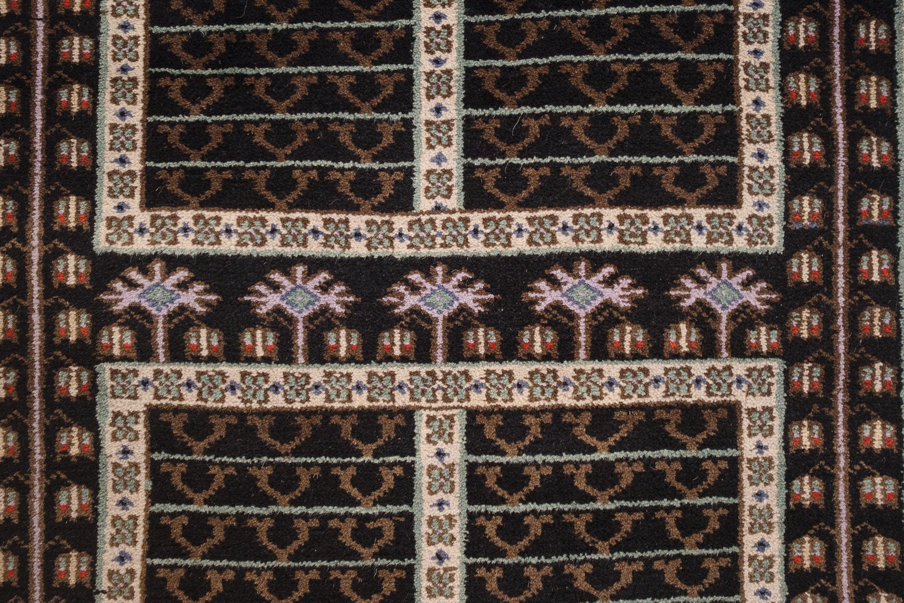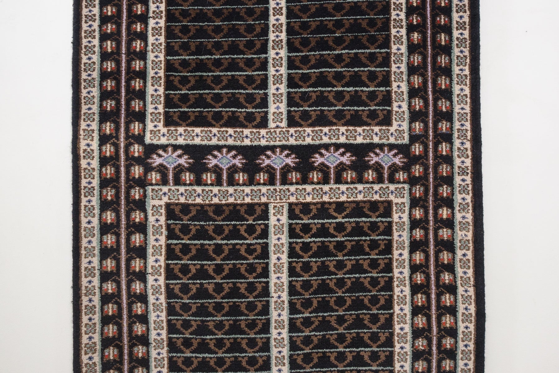 name: Jaaliborigin: Pakistan, Peshawar Bokharastyle: runner, rug, carpetmaterial: hand knotted woolcolors: black, ivory, camel, red, green, purplesage: vintagecondition: good, age related wear - see pictures