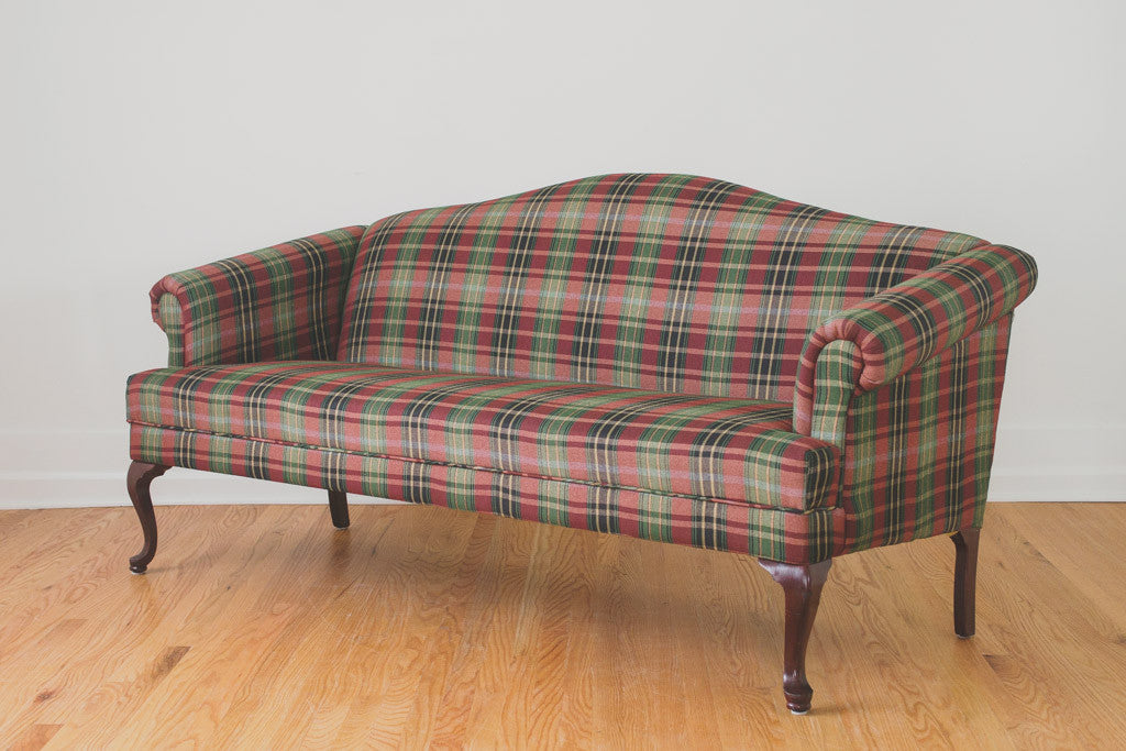 This plaid camelback sofa has cabriole legs and an attached bench seat. It's in outstanding condition and is a great napping sofa. It would look just as good with a traditional leather club chair as a Mid Century lounge chair. Please see pictures for detailed condition of this piece.