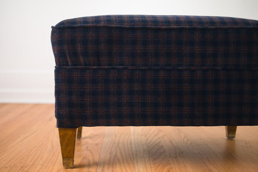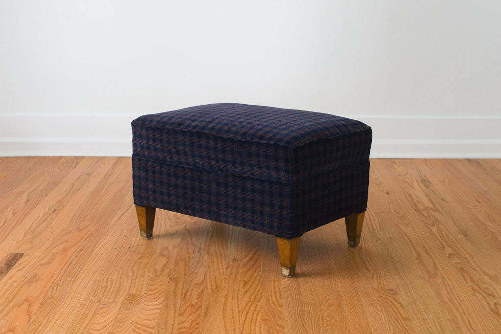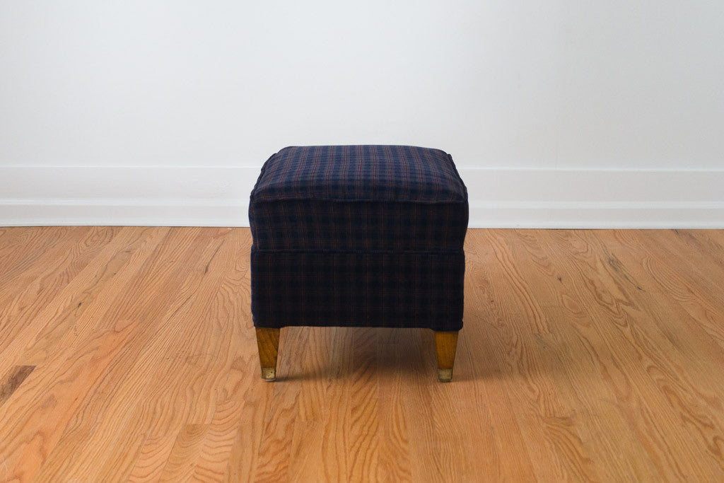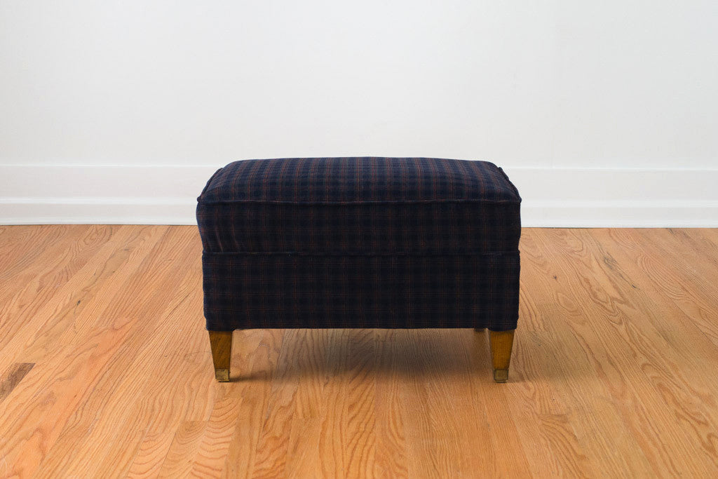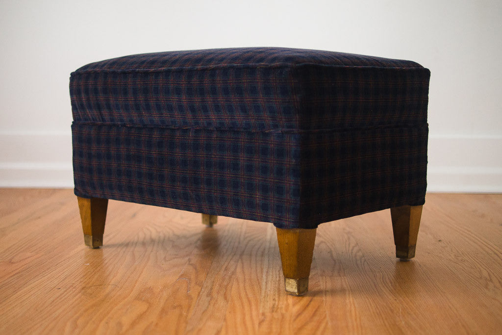 This vintage Mid Century ottoman was custom upholstered in a navy plaid corduroy fabric. It has dark legs with brass caps. It looks really nice paired with a leather chair. Add a tray and this would be a great side table that can be used for extra seating.