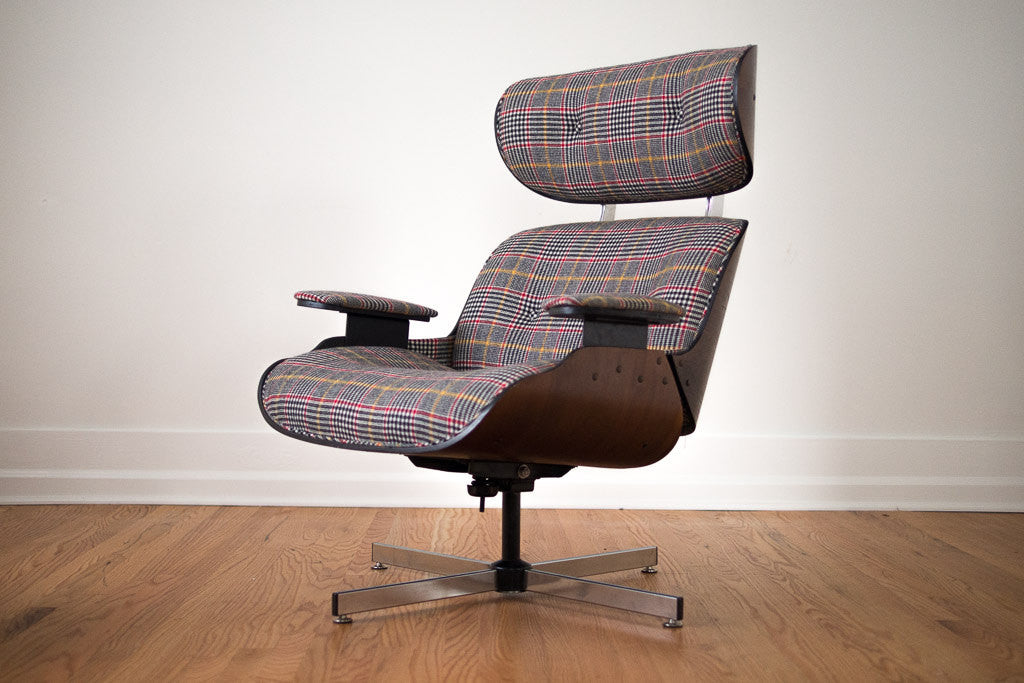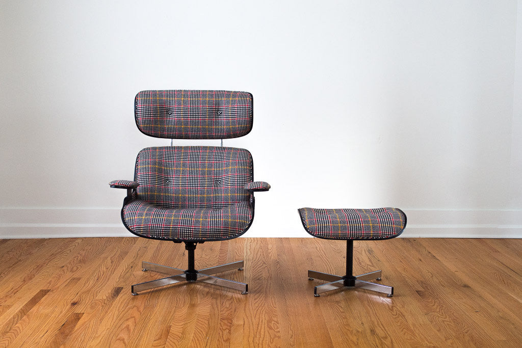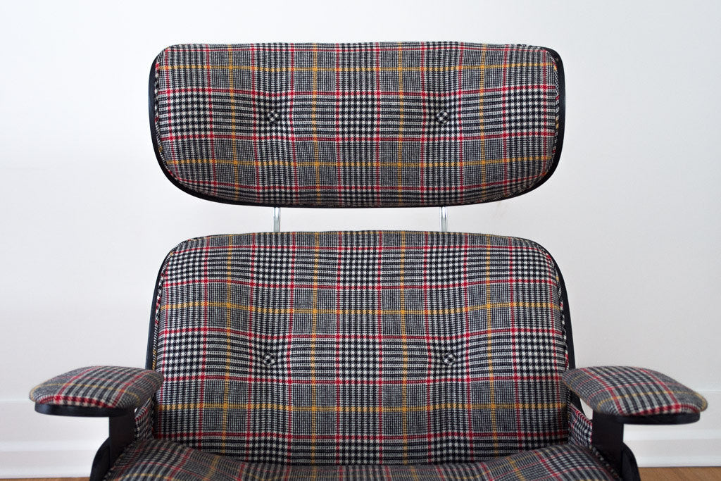 One of a kind plaid Mid Century replica Eames lounge chair. This chair was probably made by Plycraft in the 1960's and we had it reupholstered in a vintage plaid wool suit fabric. The plaid has a black and white base with red and yellow accents. The dark wood frame is in excellent condition and the chrome has been polished.