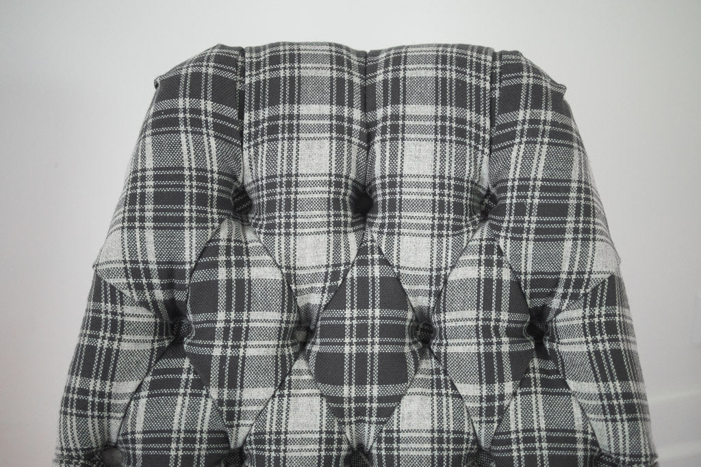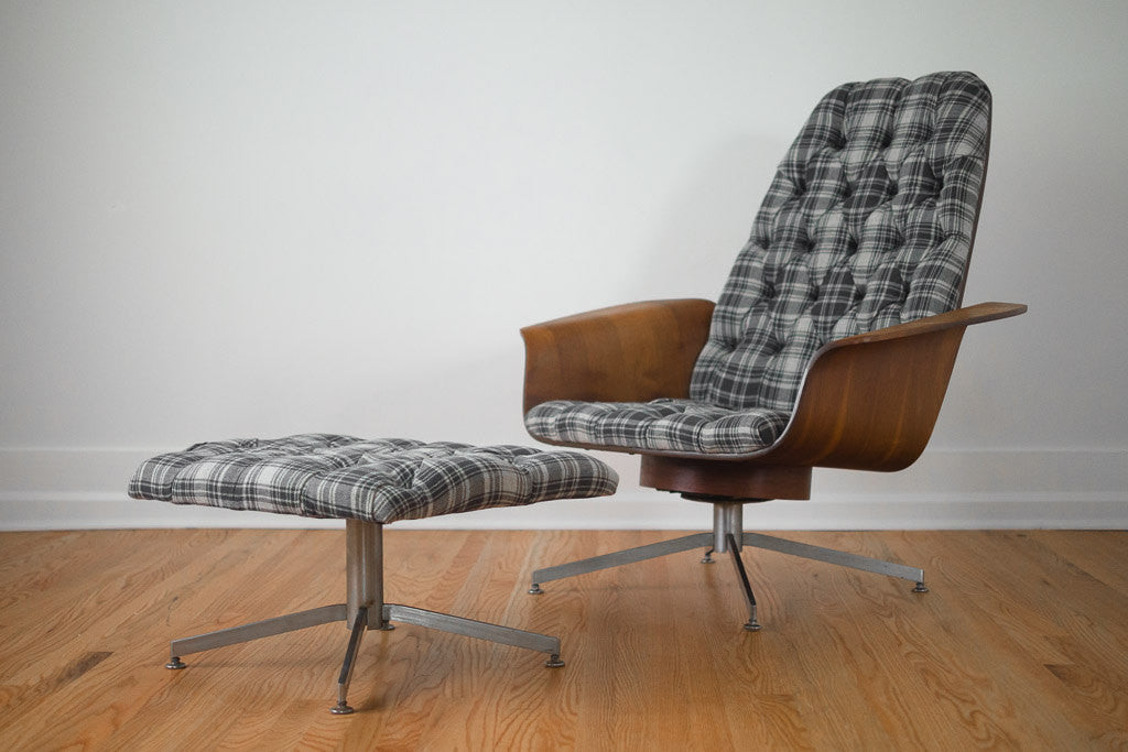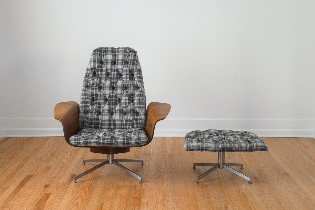 This is a one of a kind Mid Century replica Mr. Chair with matching ottoman. This chair was made in the 1960's possibly by Plycraft. We had it reupholstered in a vintage gray plaid tweed fabric which turned out AMAZING. The dark wood frame is in excellent condition and the chrome has been polished.