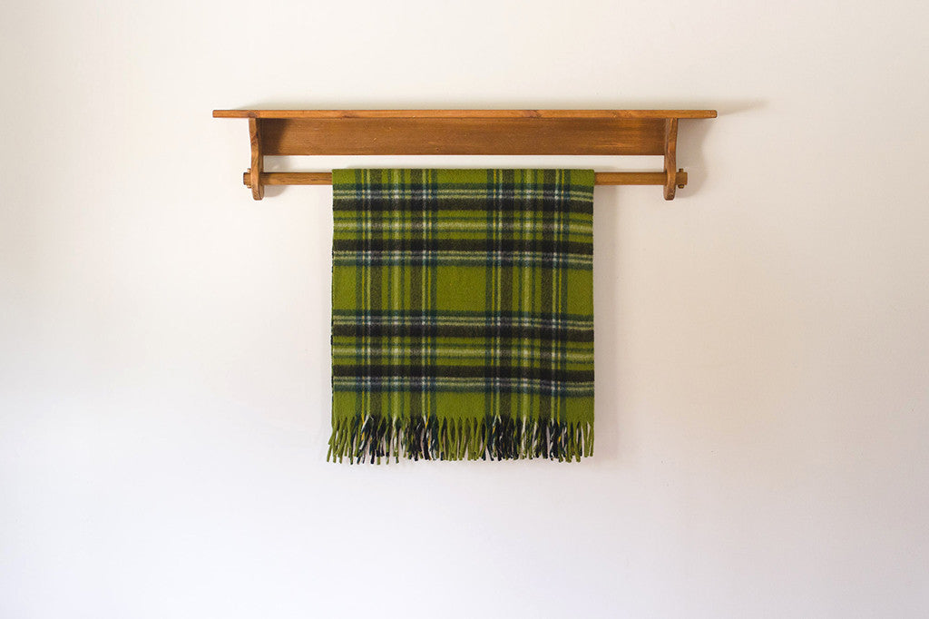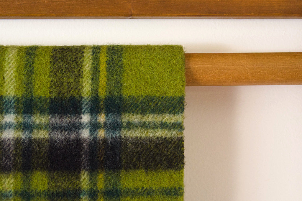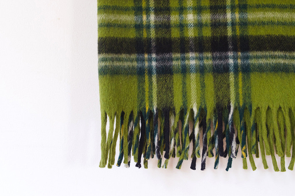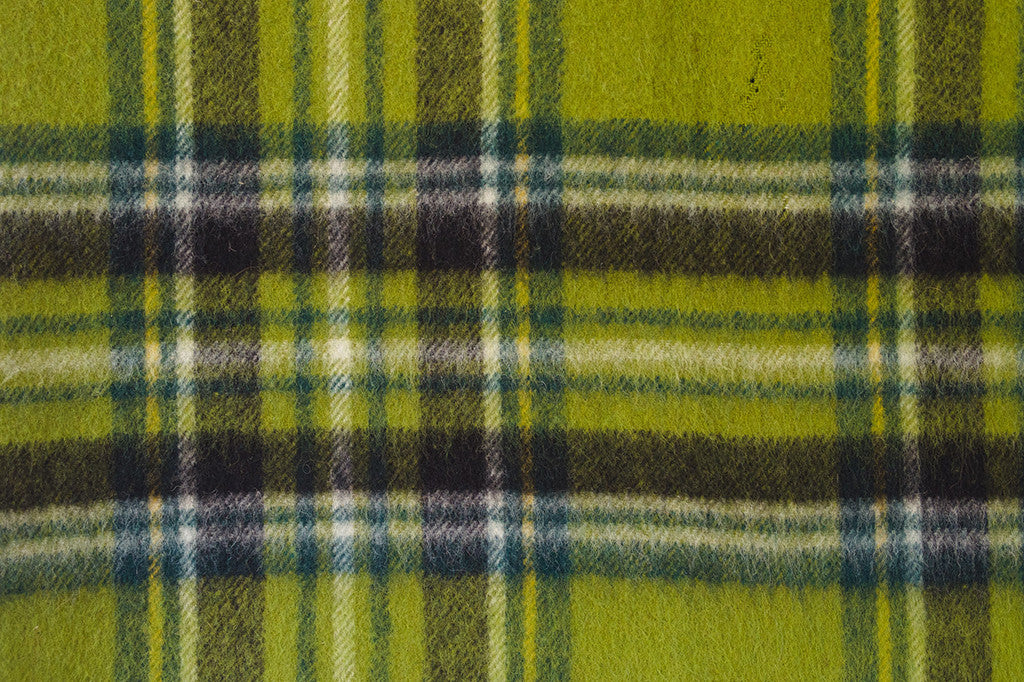 This vintage stadium blanket is unmarked. It's wool with two shades of green, yellow and off-white tartan plaid in great overall shape with two tiny moth bites. Perfect for picnics and camping. Please see pictures for detailed condition of this piece.