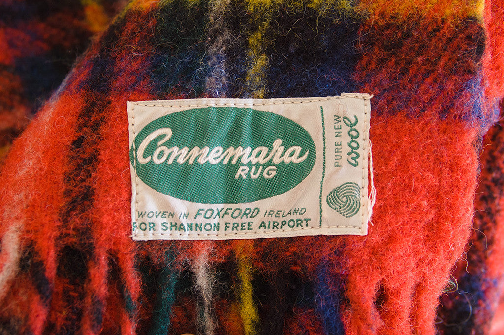 blanket is labeled Connemara Rug, manufactured in Foxford, Ireland. It's