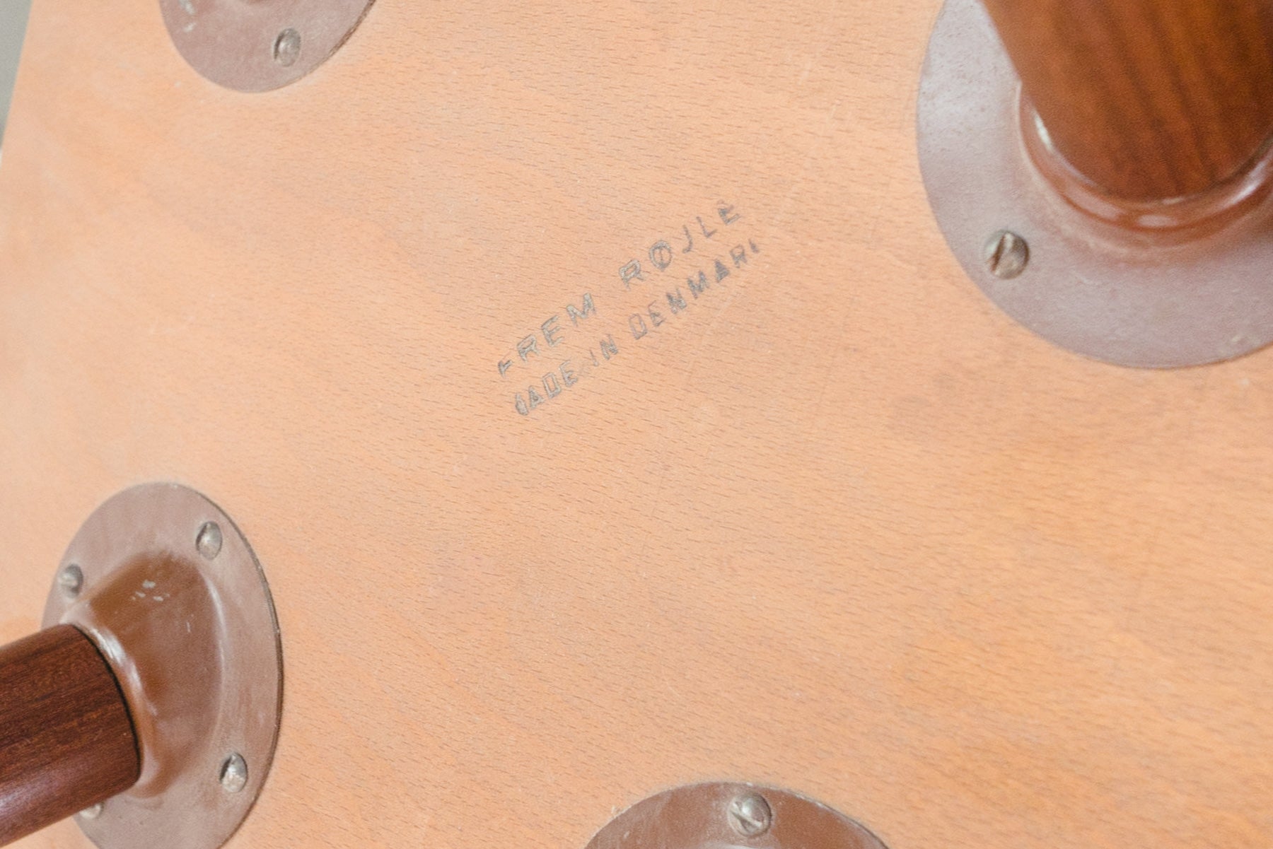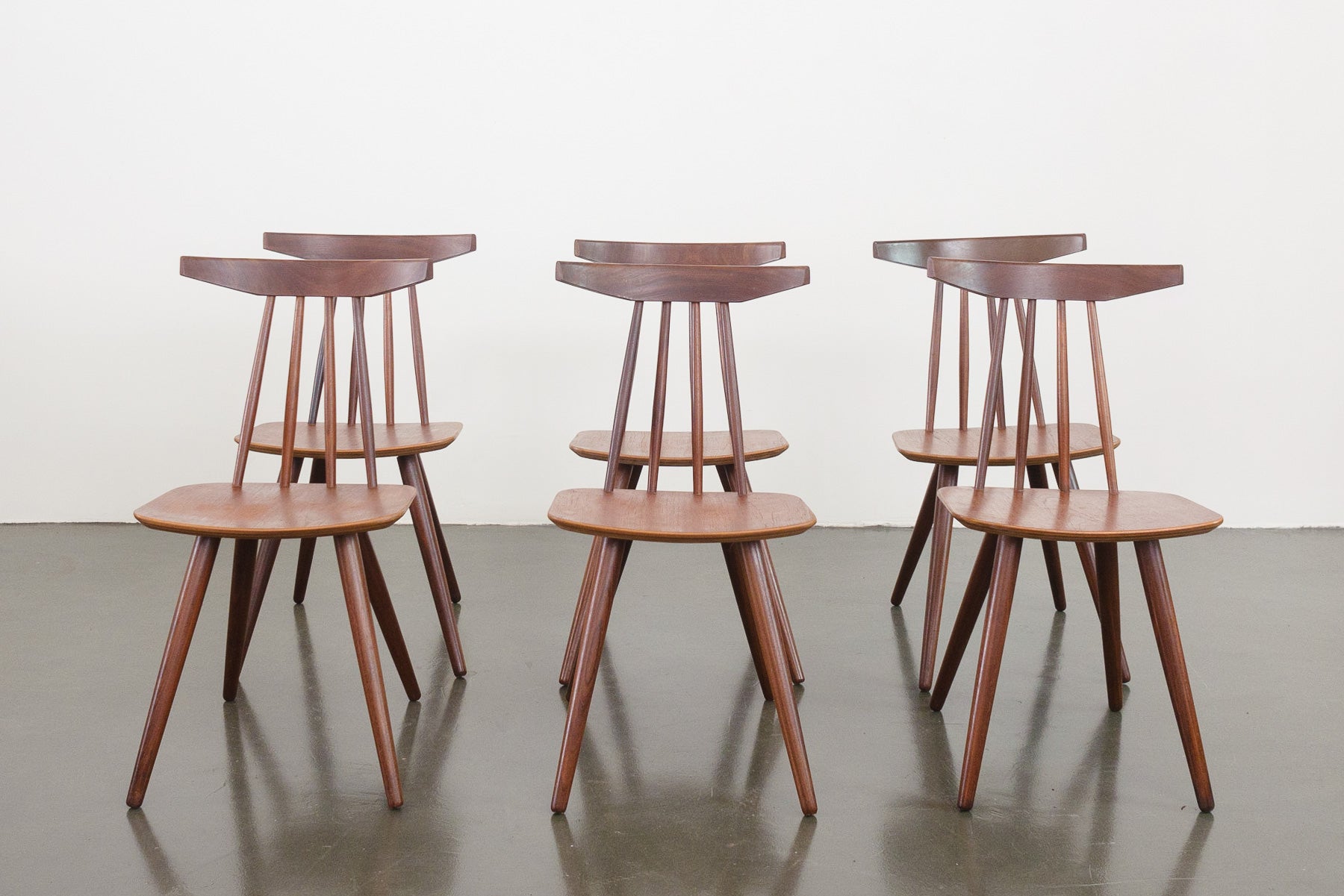 style: set of 6, modern, dining chairs material: wood (walnut) designer: Poul Volther brand: Frem Rojle origin: Denmark age: vintage, Mid Century condition: as is / some leg hardware replacements required
