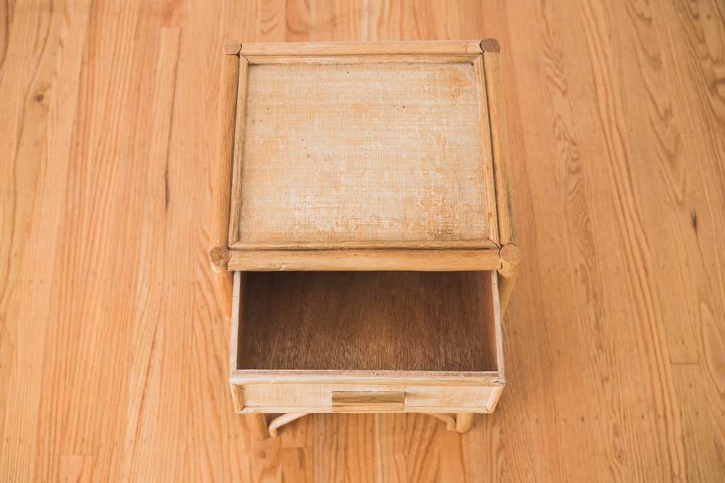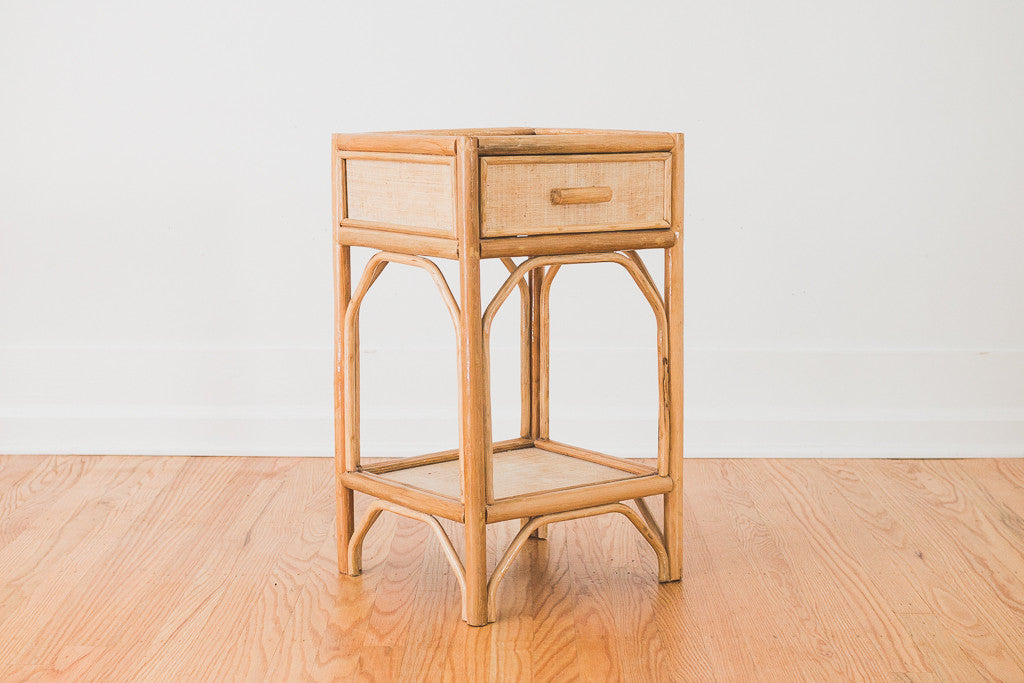 This vintage bamboo and rattan table has a single drawer with open shelving below. It's in good shape with age related wear. It could be used as a plant stand, side table or nightstand. See pictures for detailed condition.