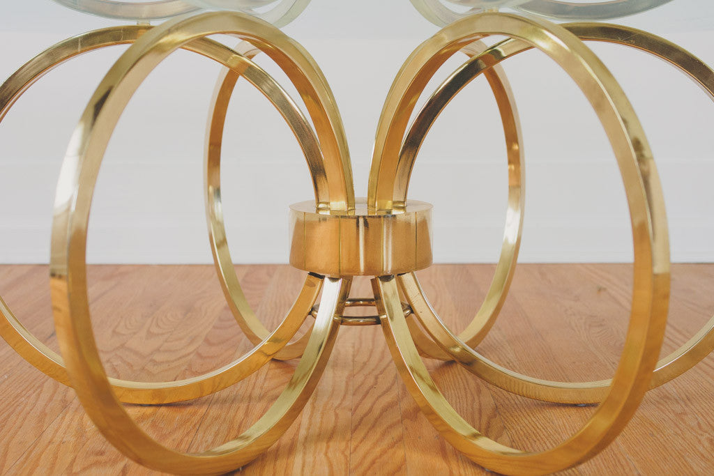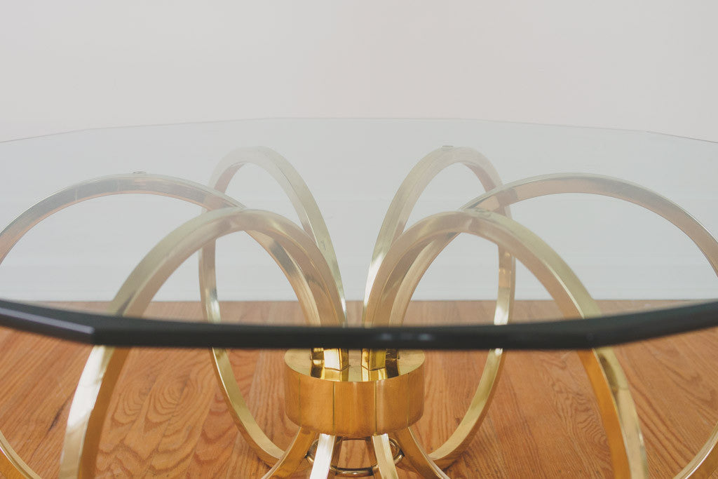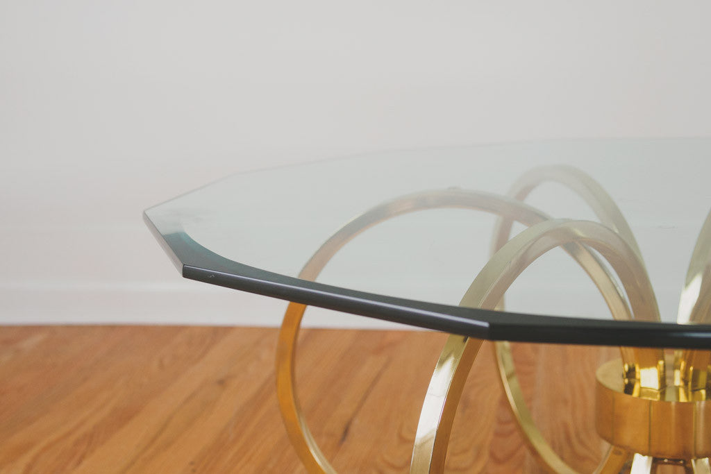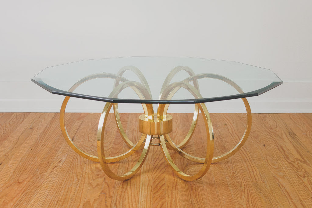 This vintage Hollywood Regency style coffee table has a gold metal frame and thick glass top. It's in great shape with some light age related wear. Please see pictures for detailed condition.