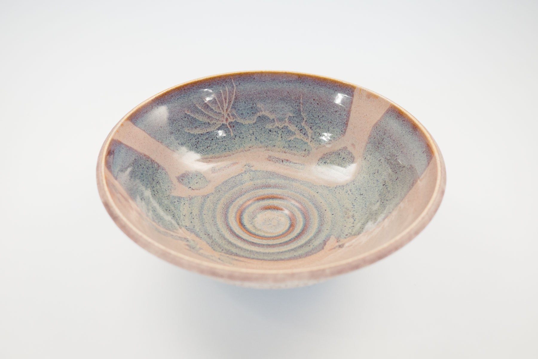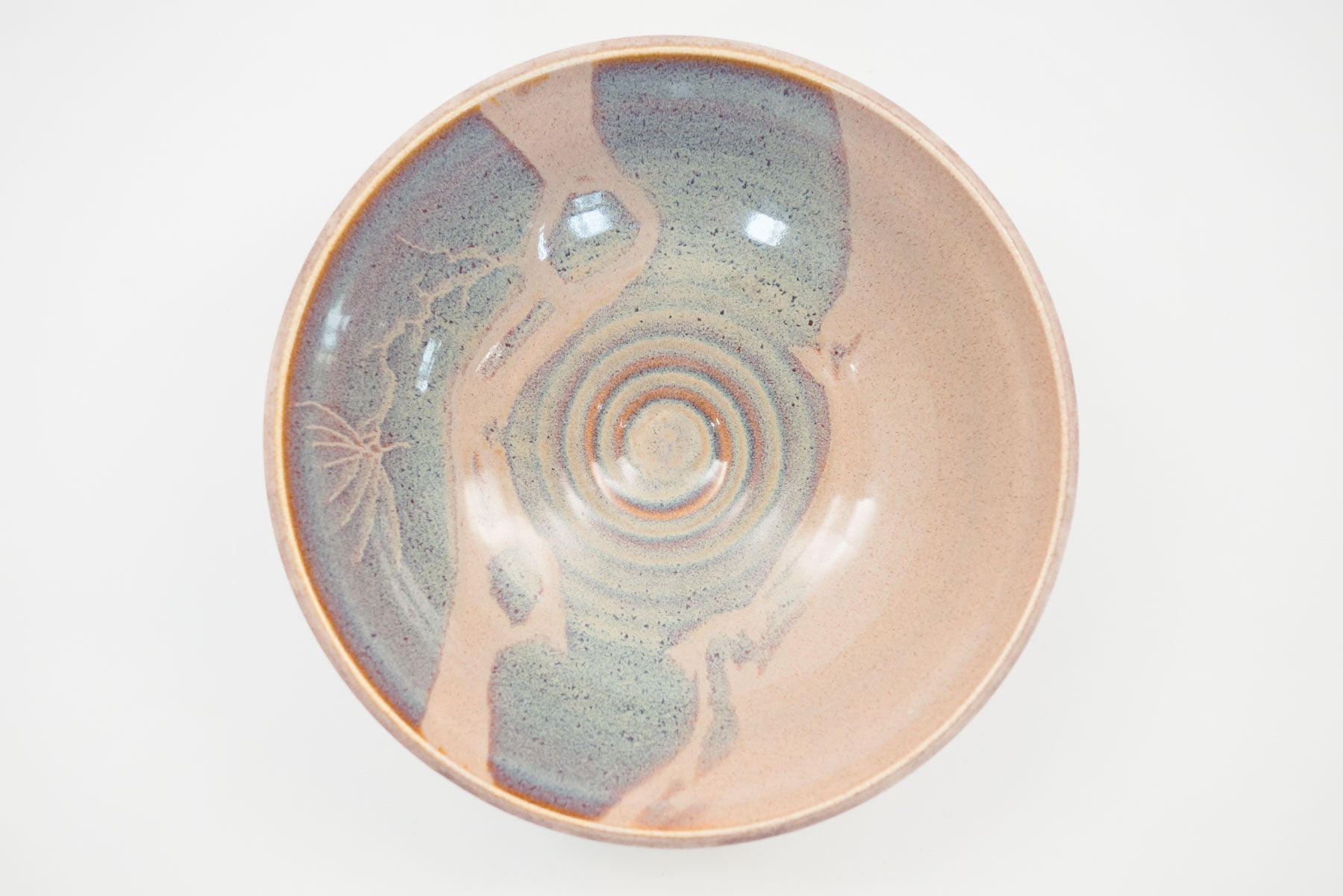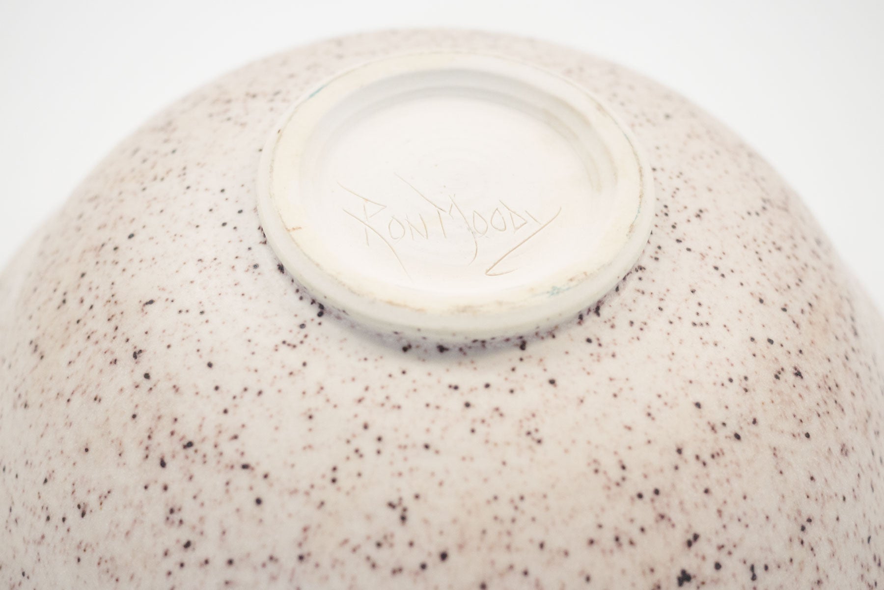 style: hand thrown, ceramic, studio pottery, serving, bowl material: clay, glaze - lavender, mauve, pink, cream, blues signed: Ron Moody age: vintage, Mid Century condition: good, age related wear - see pictures