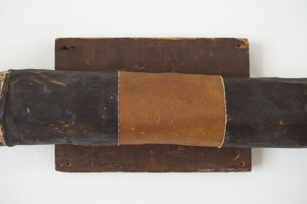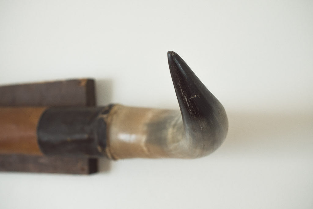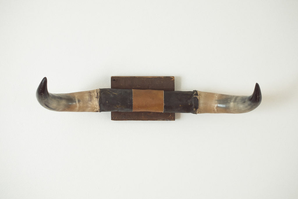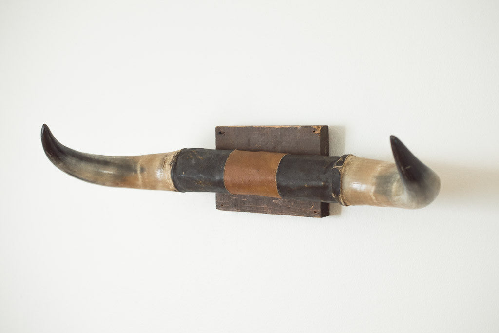 These antique bullhorns are wrapped in black and tan leather on a wood mount. They're in good shape with age related distressing and wear. See pictures for detailed condition.