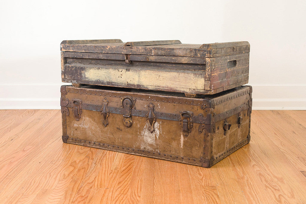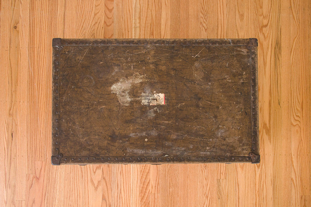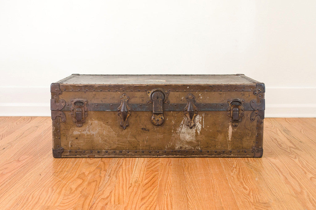 This antique trunk is from an antique shop in Charleston, South Carolina. It has a nicely distressed patina and partial original label. It's in good functioning shape and would make a great coffee table or end of the bed storage piece. It also works well as a set with the other vintage trunk we have in the shop. Please see pictures for detailed condition of this piece.