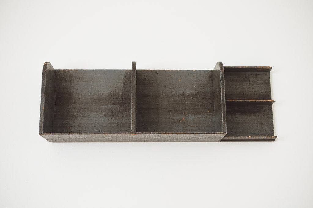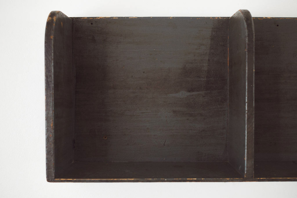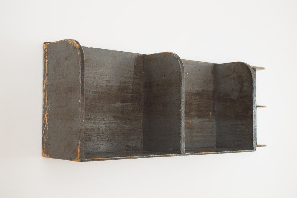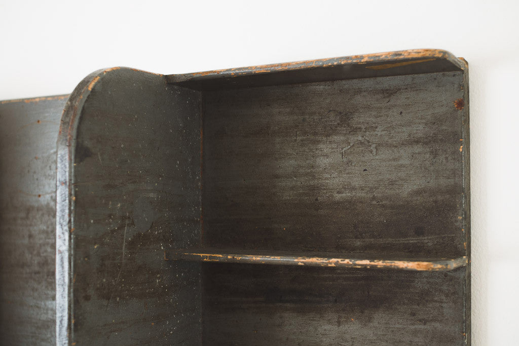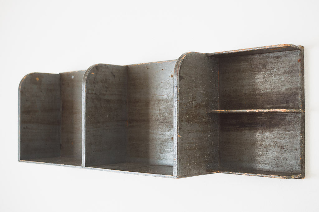 This vintage rustic wood wall shelf has five shelves. It's in good shape with age related distressing and wear. See pictures for detailed condition.