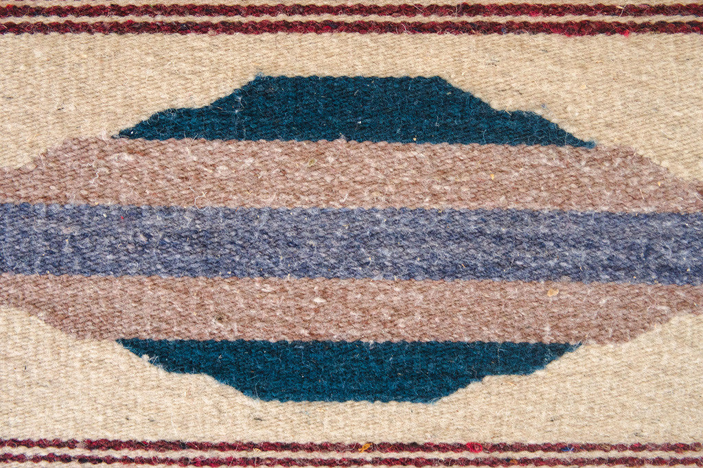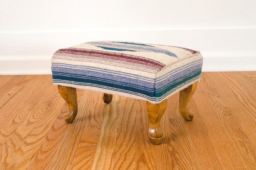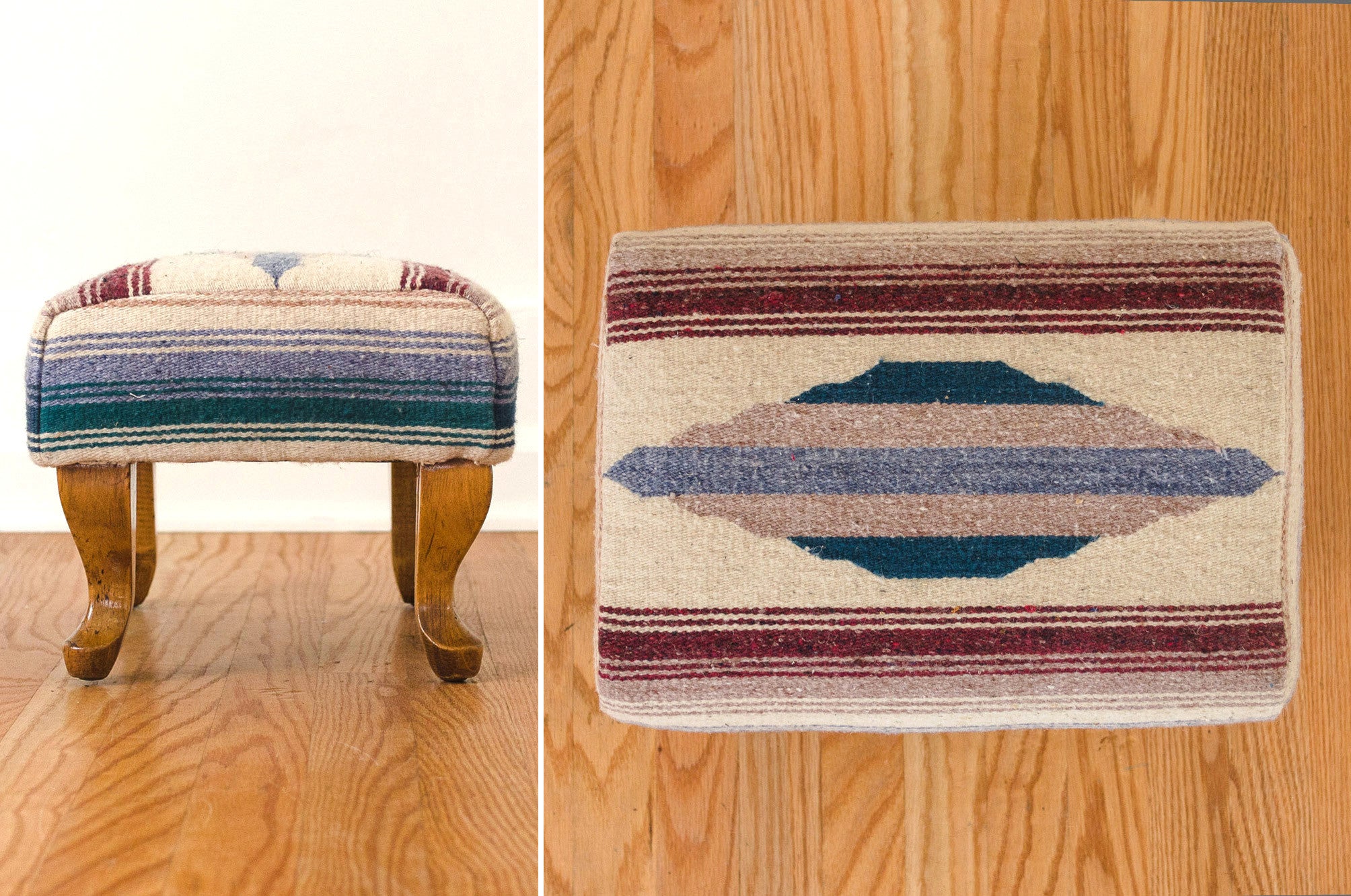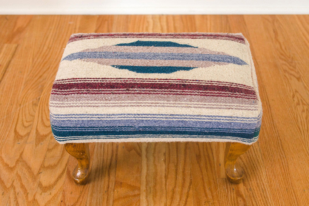 This vintage footstool was reupholstered in an old saddle blanket. It has a cream base with teal, blue, maroon and coral accents. This stool is in overall excellent shape with some age related wear to the legs. Please see pictures for detailed condition of this piece.