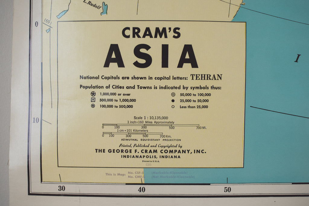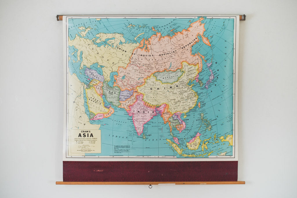 This large vintage Cram's pull-down map of Asia was printed in the USA. It's in good shape with age related distressing and wear. See pictures for detailed condition.