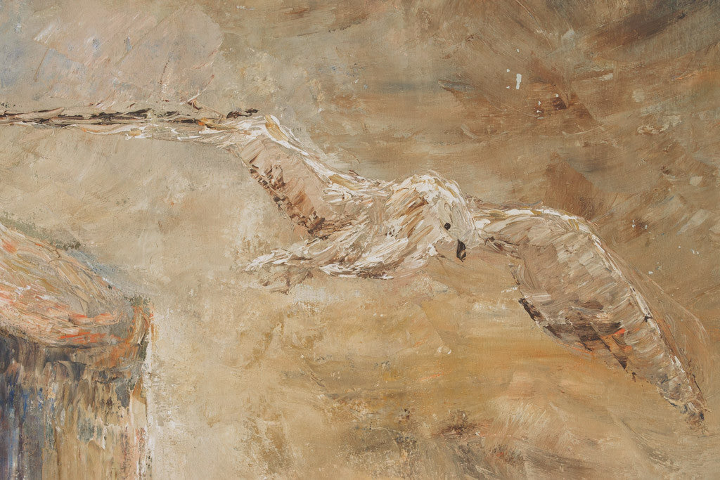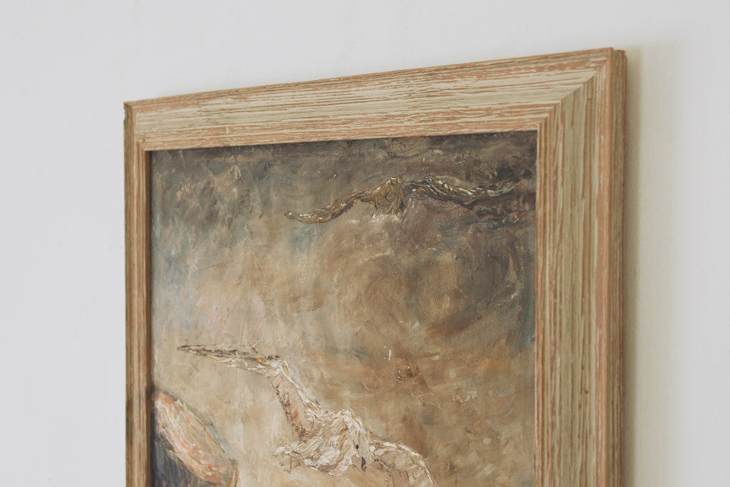 This original impasto style oil painting is framed and signed. It has a neutral color palette with seagulls above waves splashing against timber posts. It's in good shape with age related wear. See pictures for detailed condition.