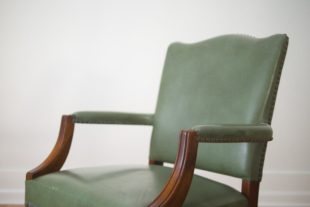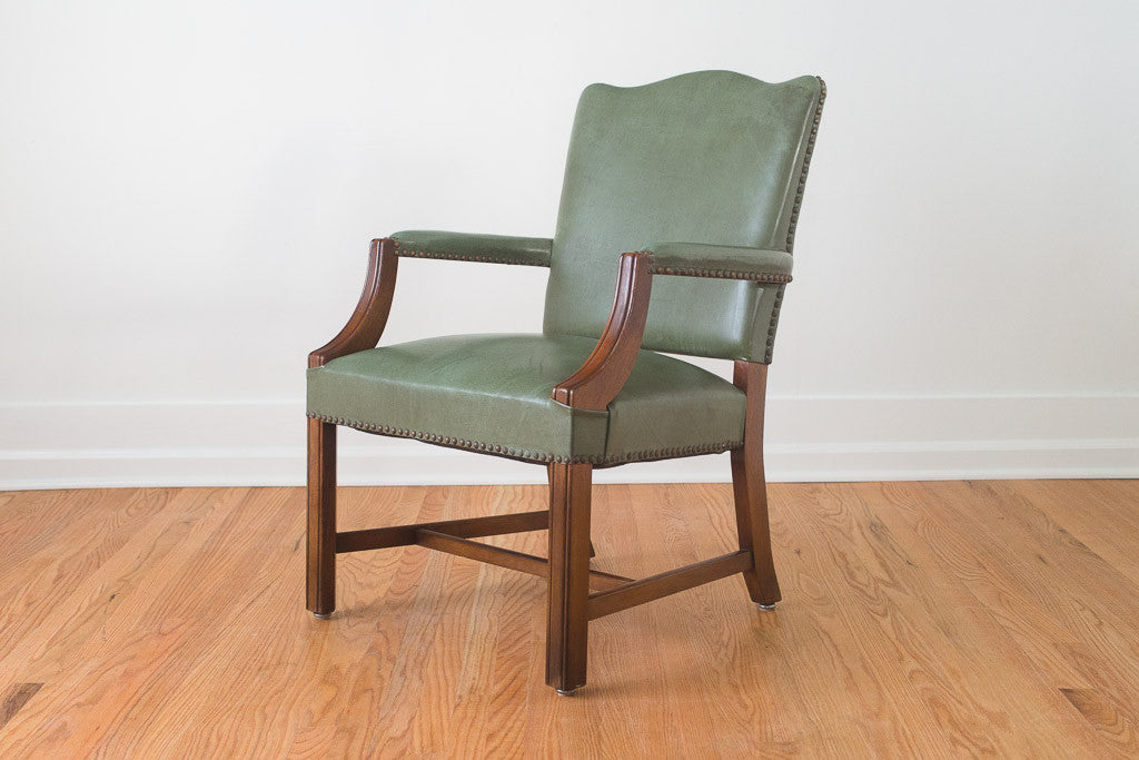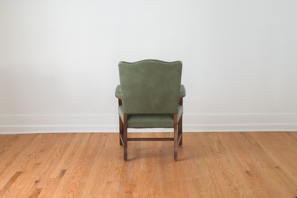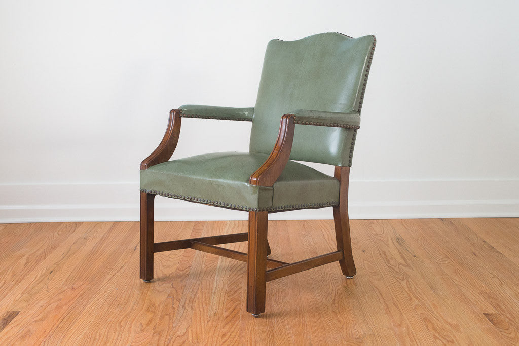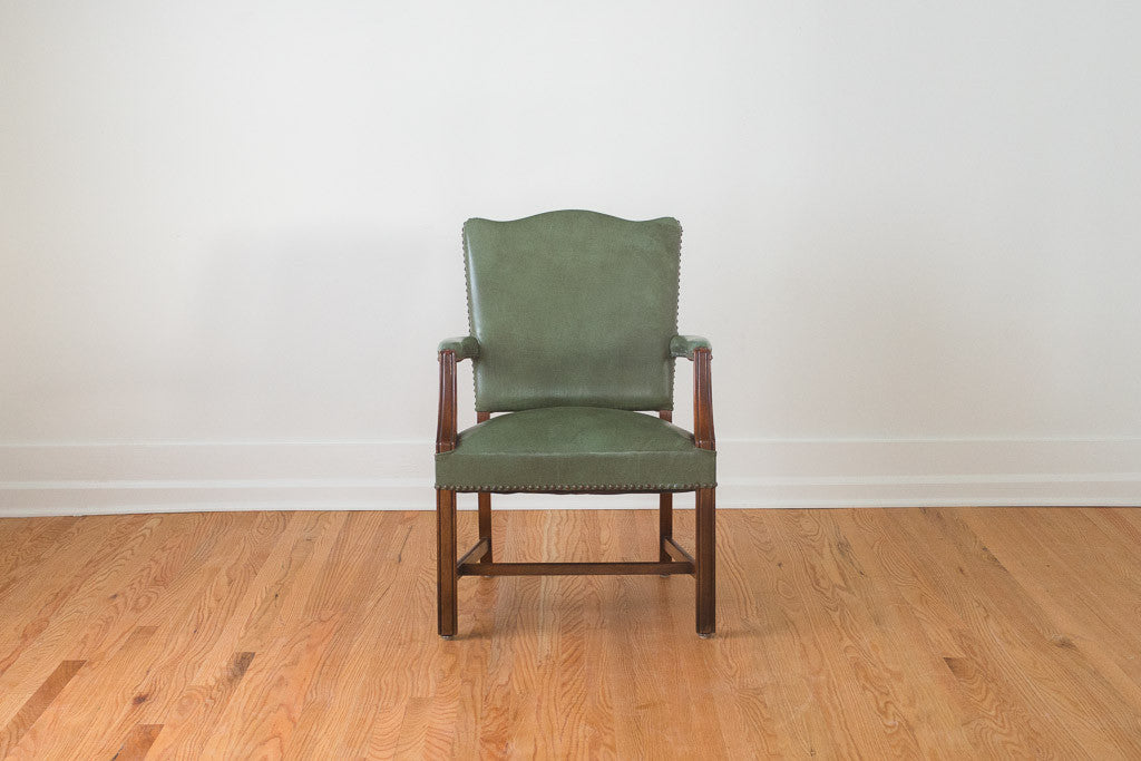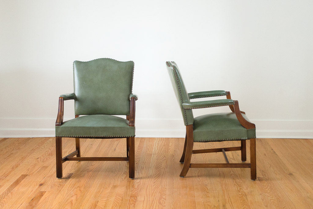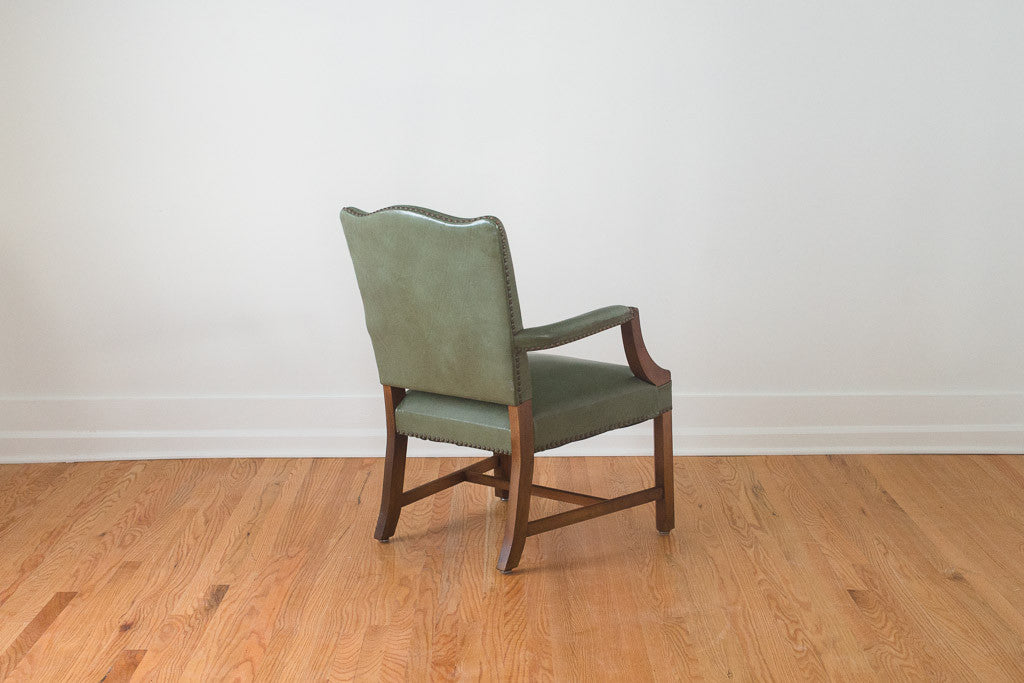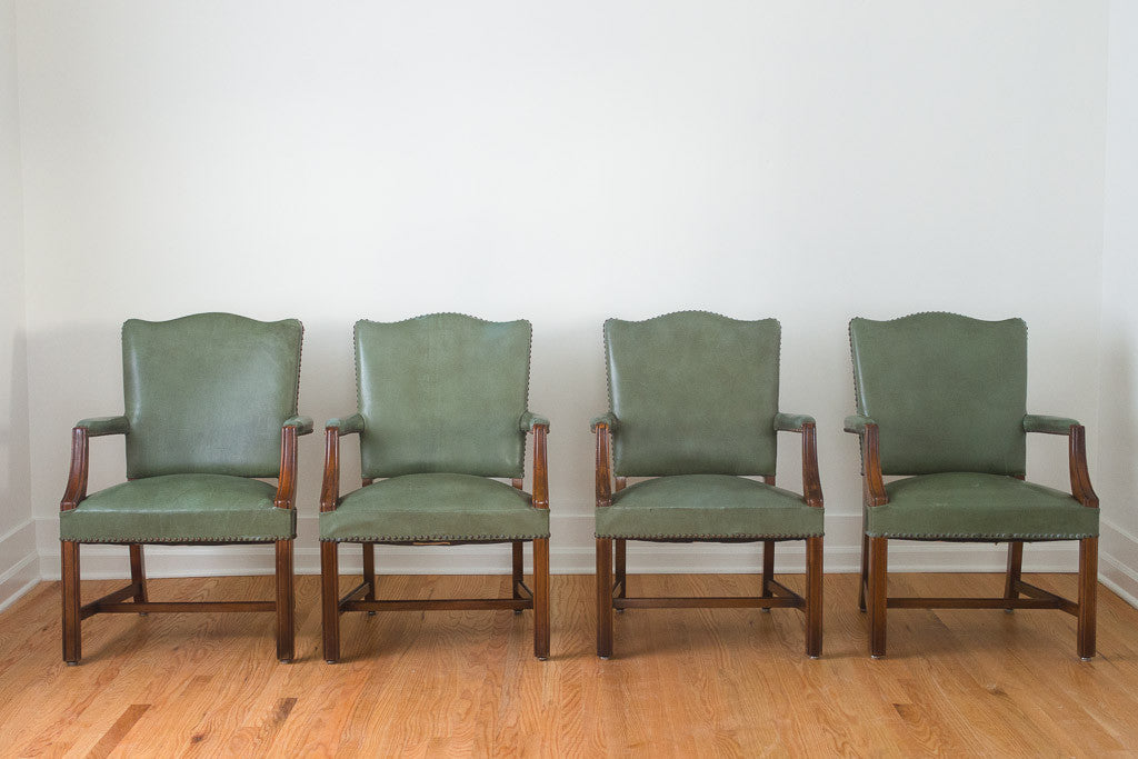 This is a handsome set of four vintage leather Stow Davis dining chairs. This set is covered in a supple lightly distressed green leather. The springs in the seats have all been professionally restored so they are durable and comfortable. They have a camel back design and are completely trimmed in brass nailheads. (Sold as a set)