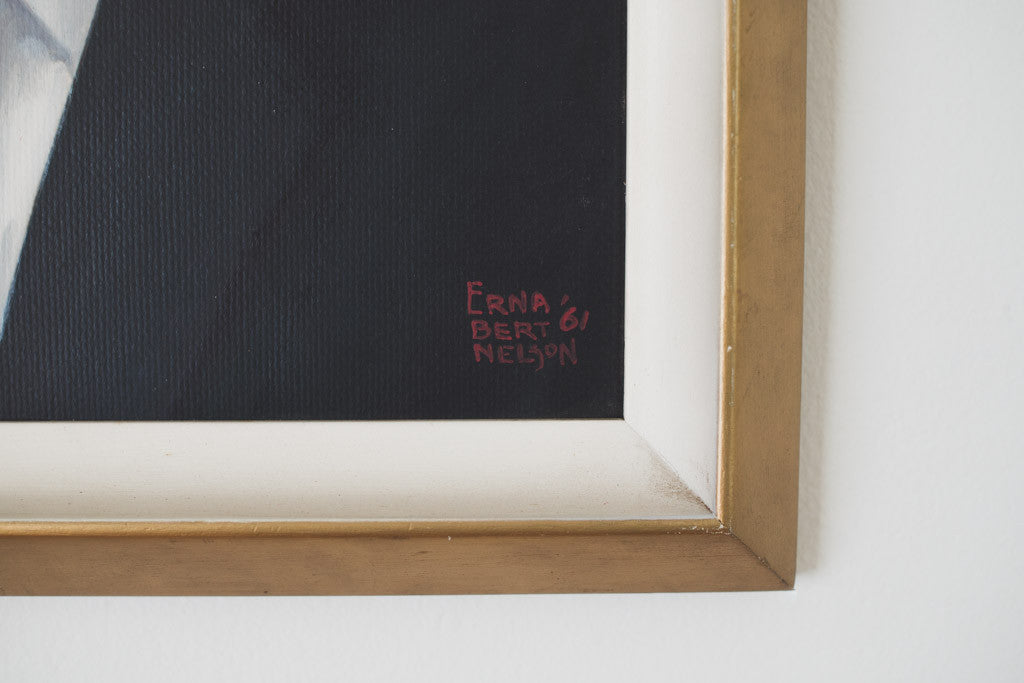 This framed original oil painting is a portrait of a man signed "Erna Bert Nelson 61". It's in good shape with age related wear. See pictures for detailed condition.