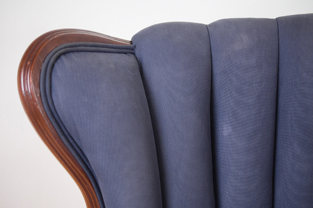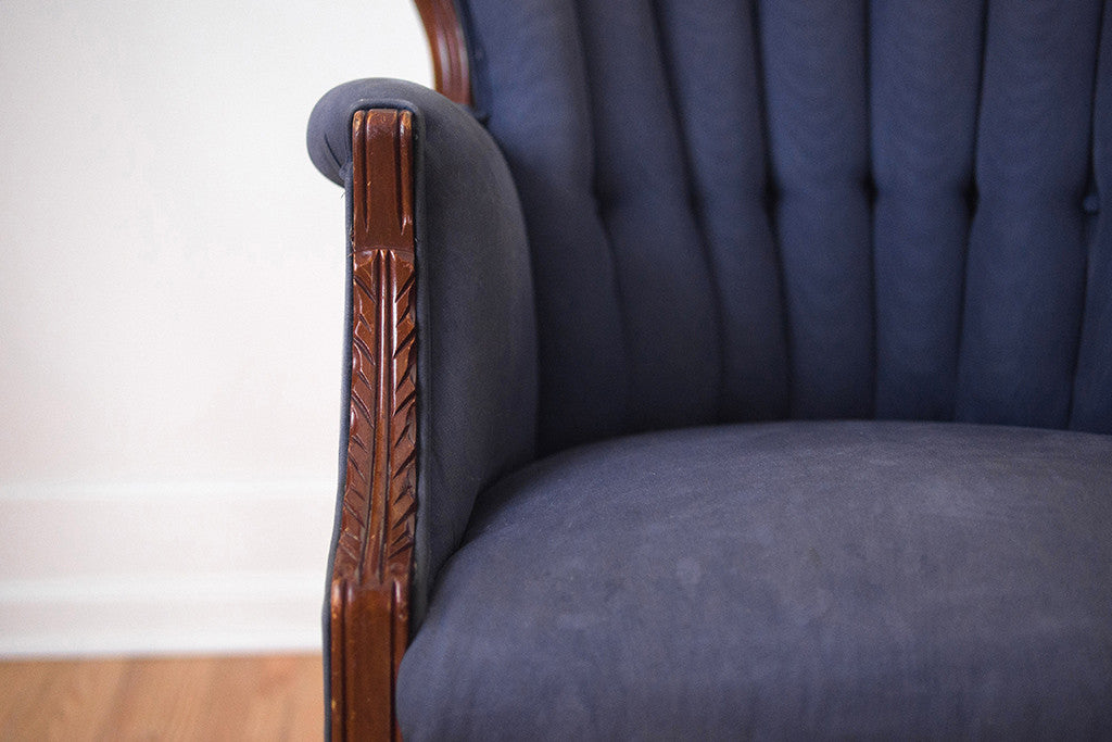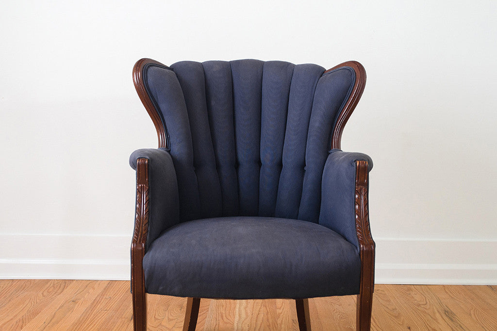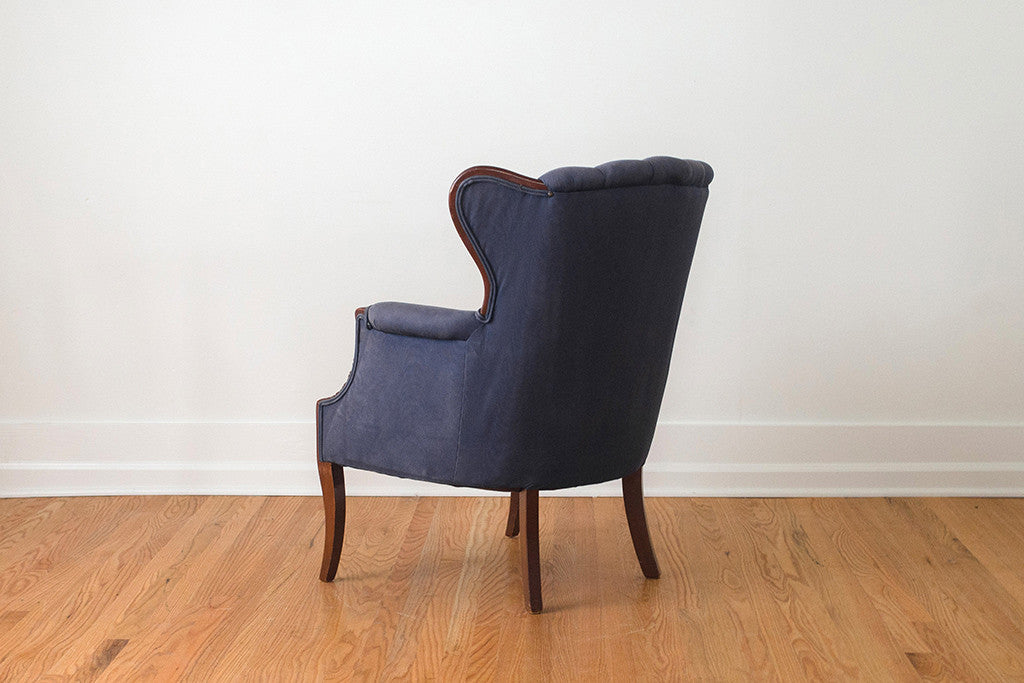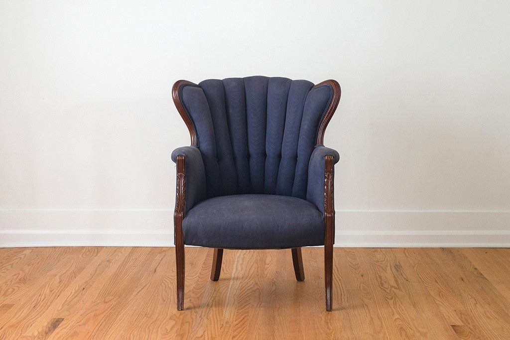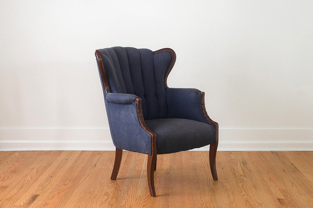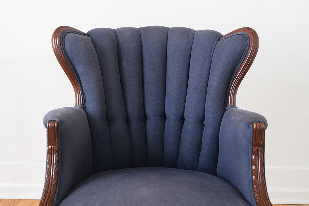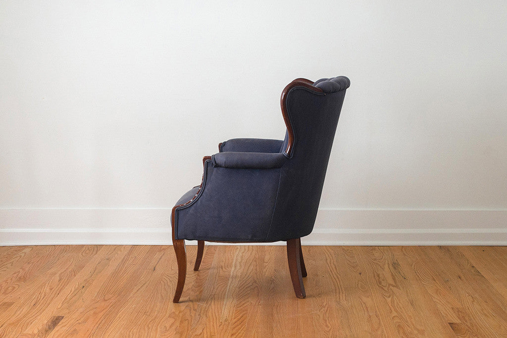 This vintage channel back wing chair is upholstered in a navy silk fabric. It has dark carved wood accents and a row of tufts along the back rest. It's in great shape overall with some light wear and fading to the upholstery.