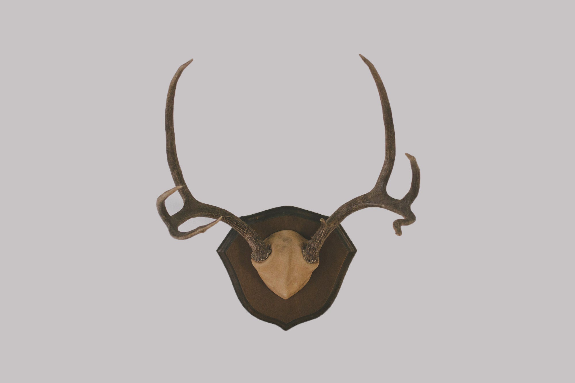 These vintage deer antlers are larger six-point size. They're mounted on a dark wood plaque with tan suede leather upholstery. They are in great shape with some age related wear. Besides being displayed, they would make a nice coat, hat or towel rack. Please see pictures for detailed condition.