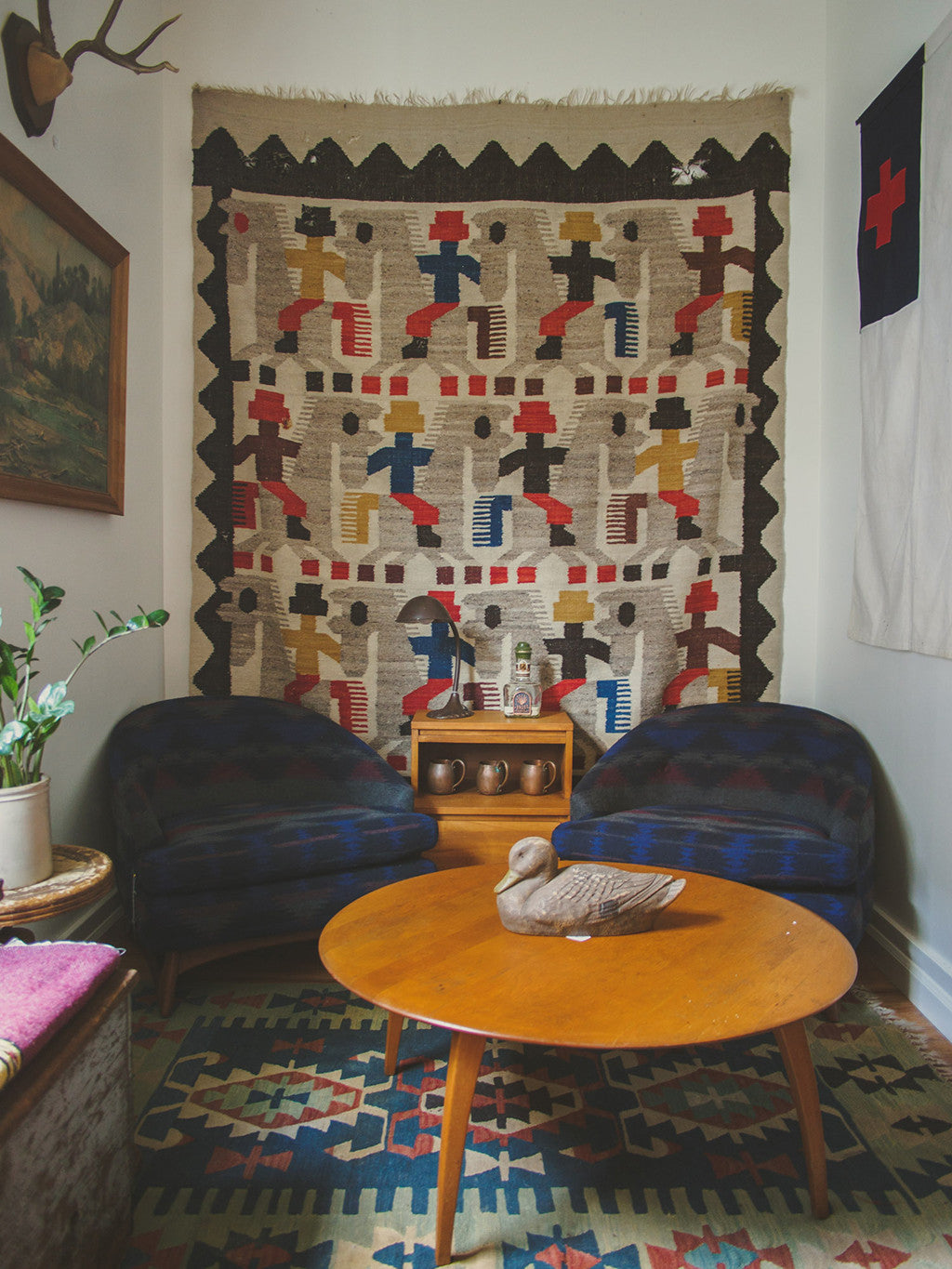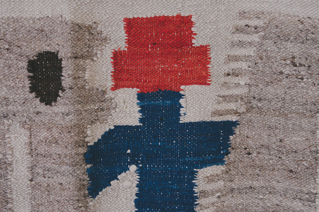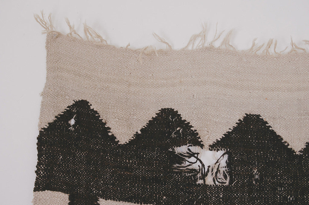 This vintage handwoven area rug has a kilim design with an off-white base, blue, red, green, yellow and black accents. It has overall age related wear including a few holes. This rug could also be displayed on a wall or used as a blanket. Please see pictures for detailed condition.