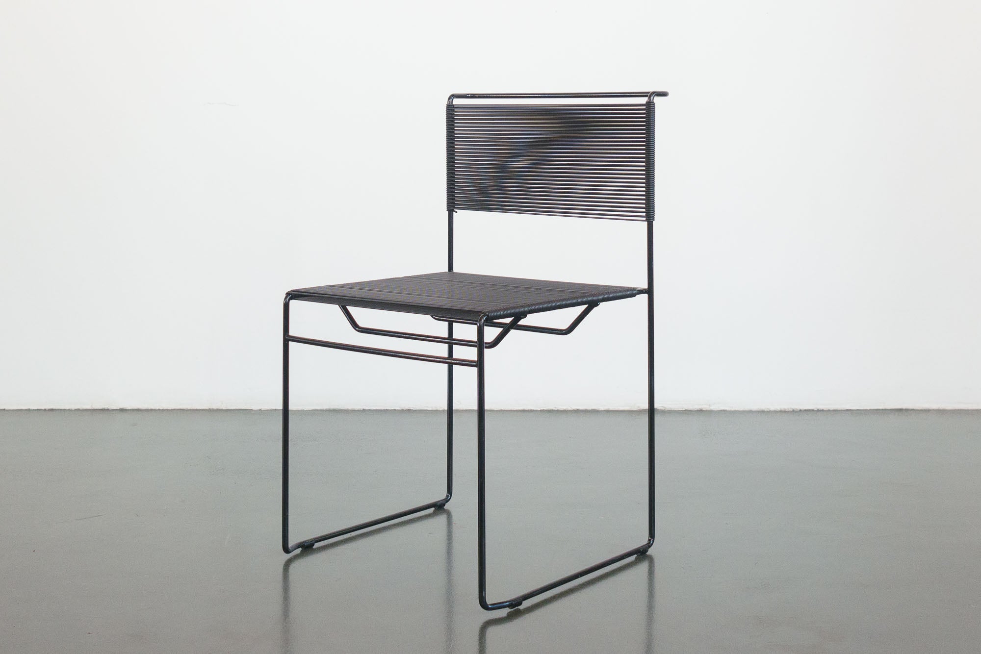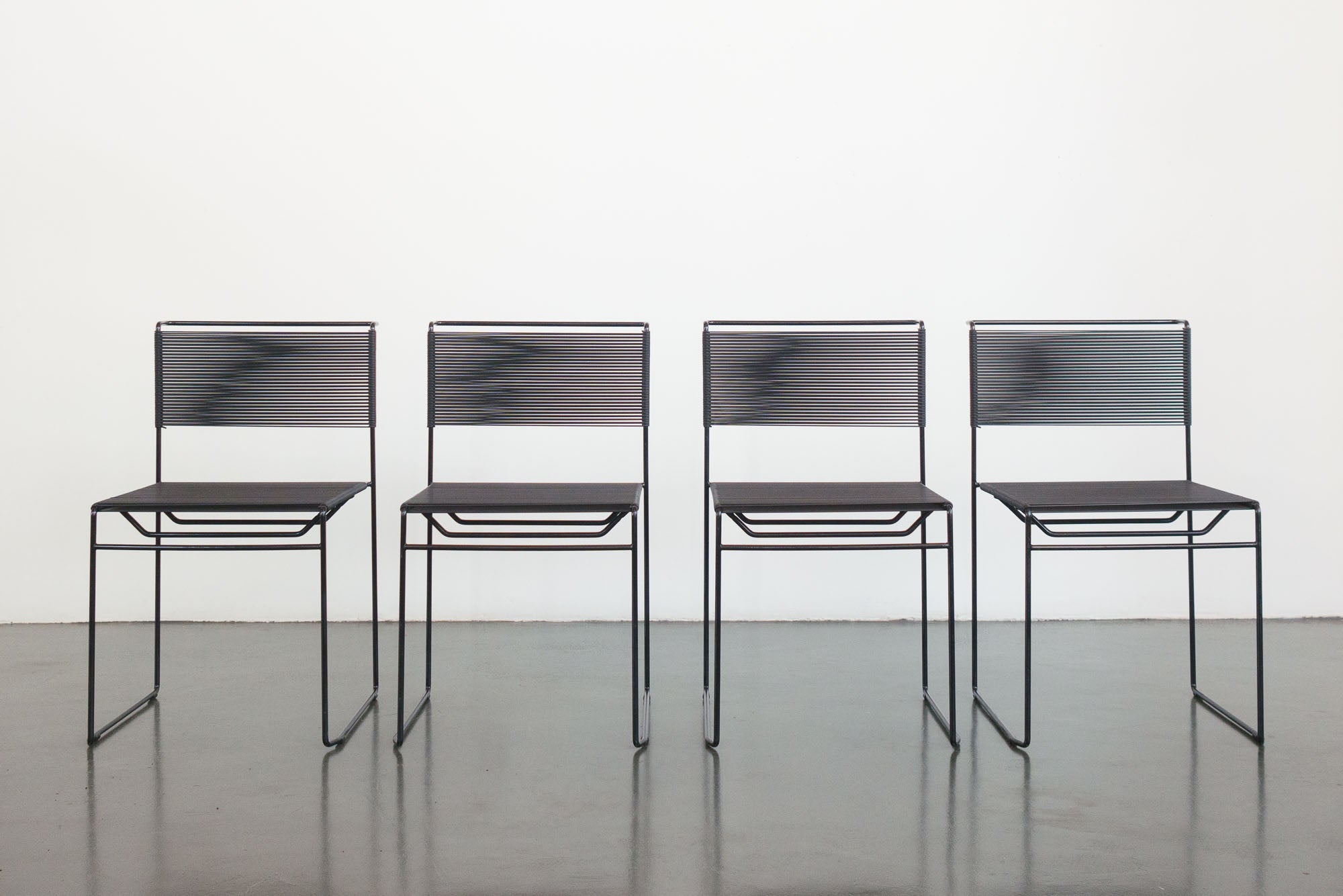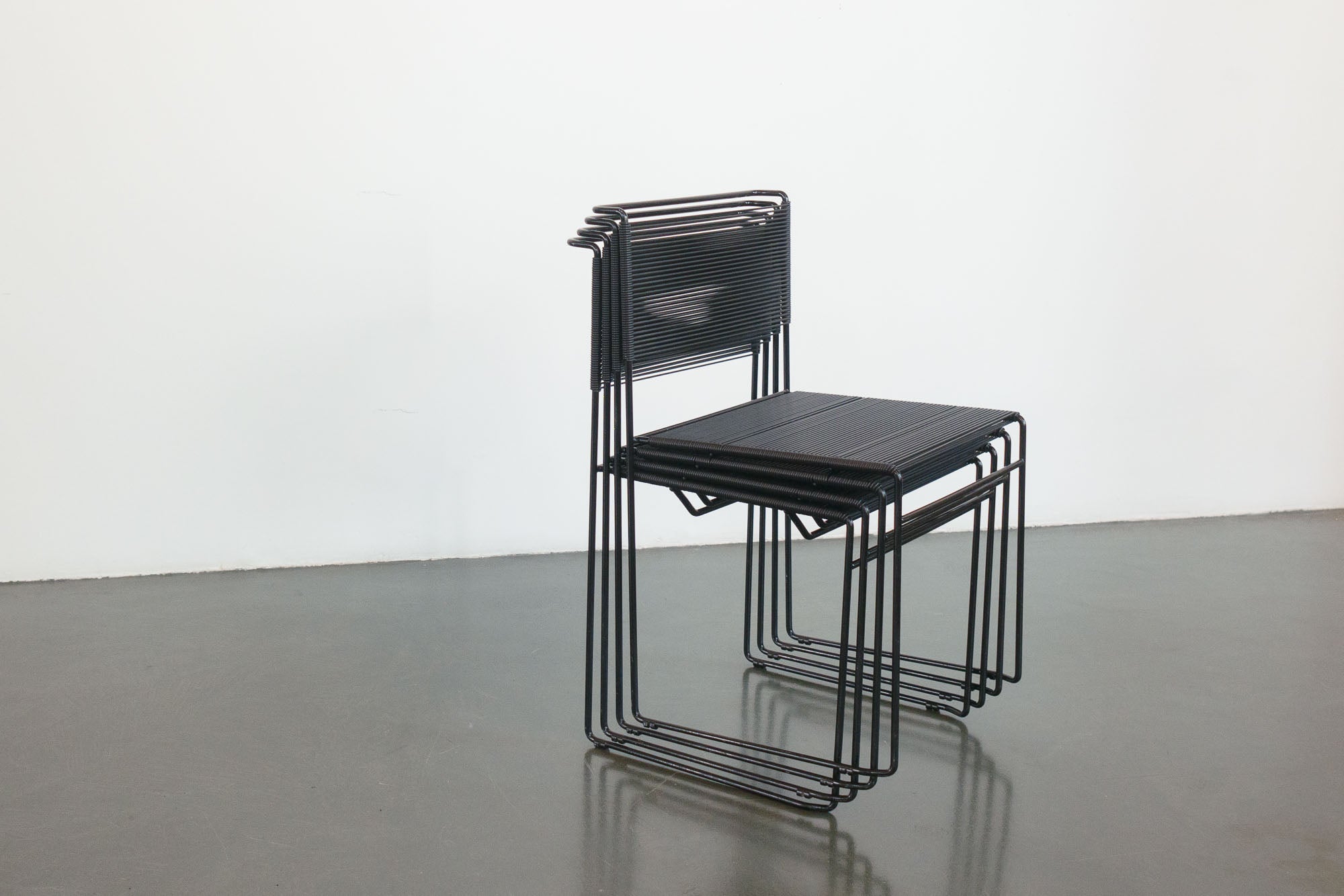 style: stacking, metal, modern, chairs material: painted steel, memory plastic cord origin: Fly Line - Giandomenico Belotti for Alias age: vintage, 1970s condition: good, age related wear - see pictures sku: hs-445 note: set of 4, Made in Italy
