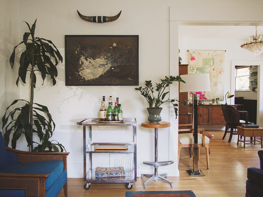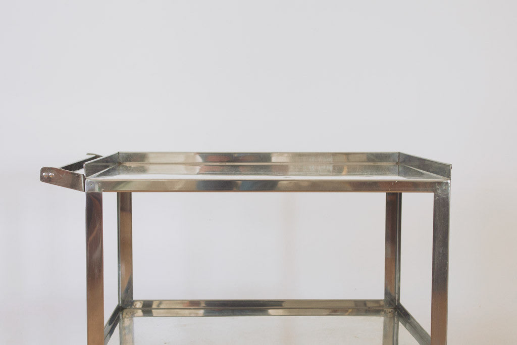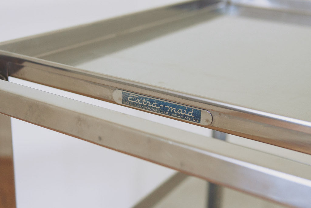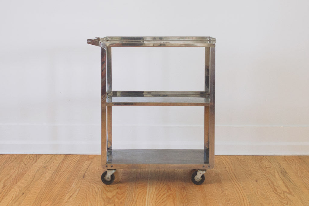 This industrial bar cart has a stainless steel frame with three shelves and rubber wheels that roll smoothly. It's in great shape with age related wear. See pictures for detailed condition.