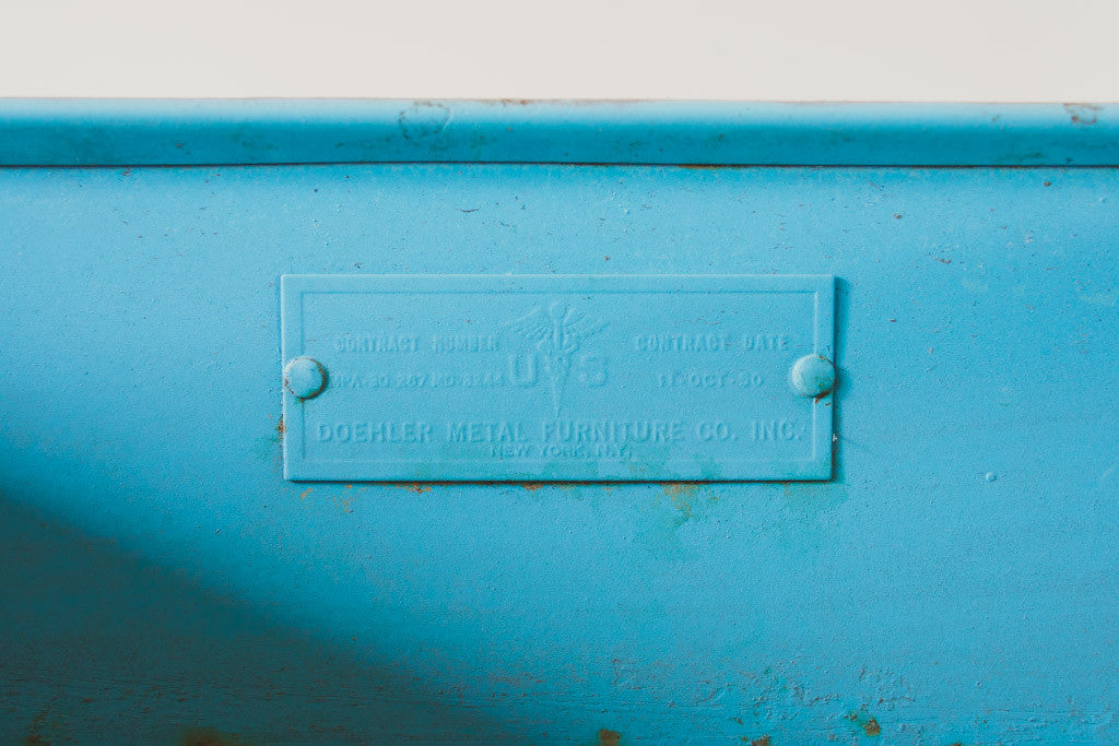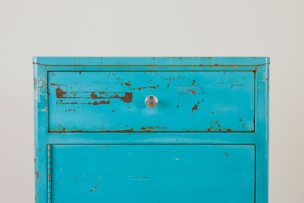 This Mid Century industrial steel cabinet has a heavy steel frame with distressed turquoise paint. It's a nice size for a bar, shop cabinet, kitchen or bathroom storage piece. Please see pictures for detailed condition.