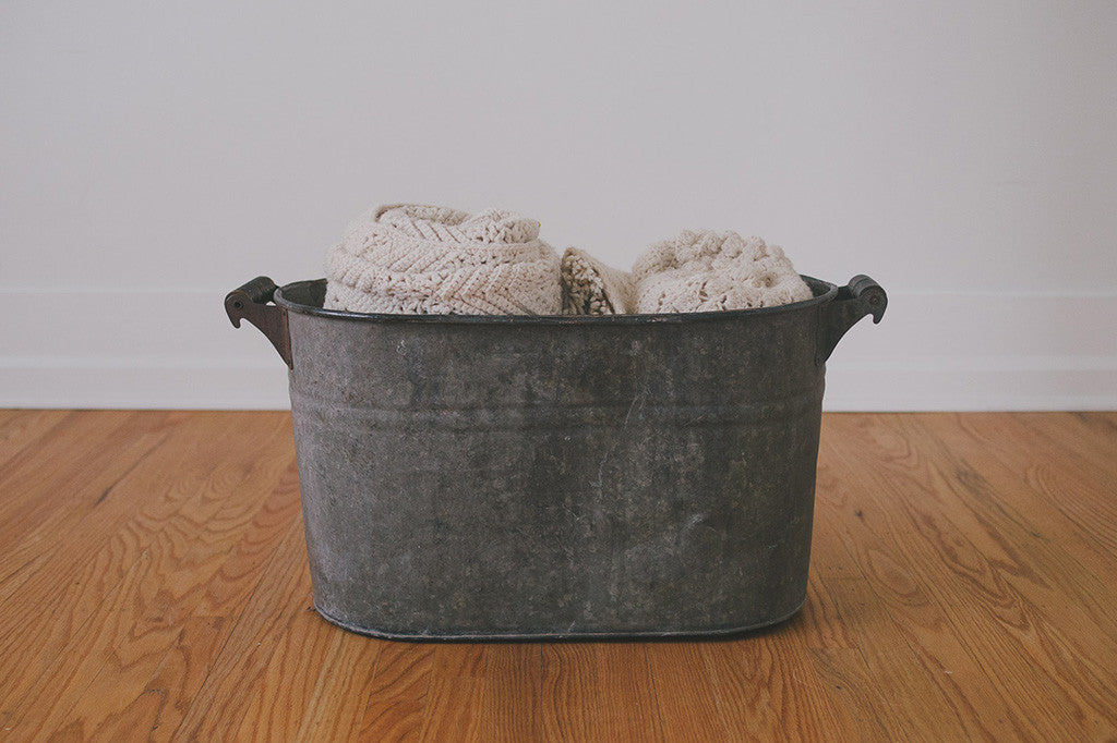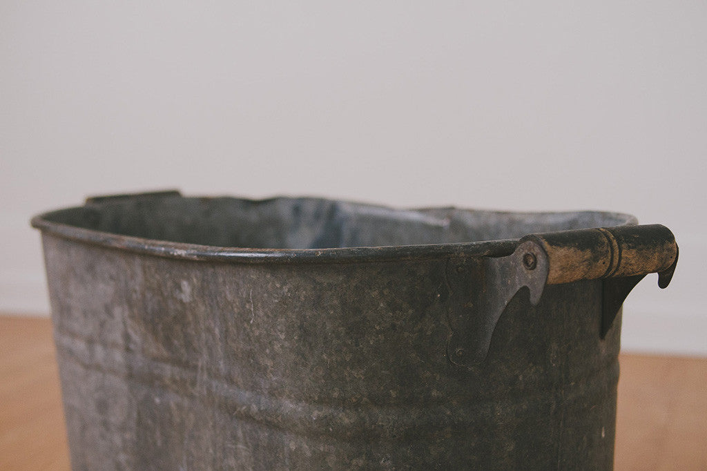 This vintage industrial bin is made from galvanized steel with carved wooden handles. It would be great for storing blankets, magazines or firewood. Please see pictures for detailed condition.