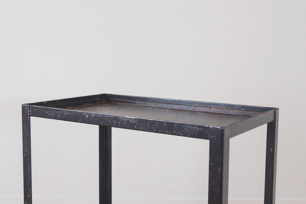This industrial bar cart has a steel frame with two shelves, distressed black paint and rubber wheels. It's in good shape with age related wear. See pictures for detailed condition.