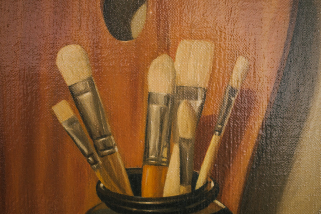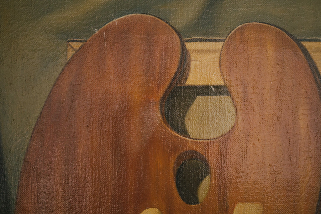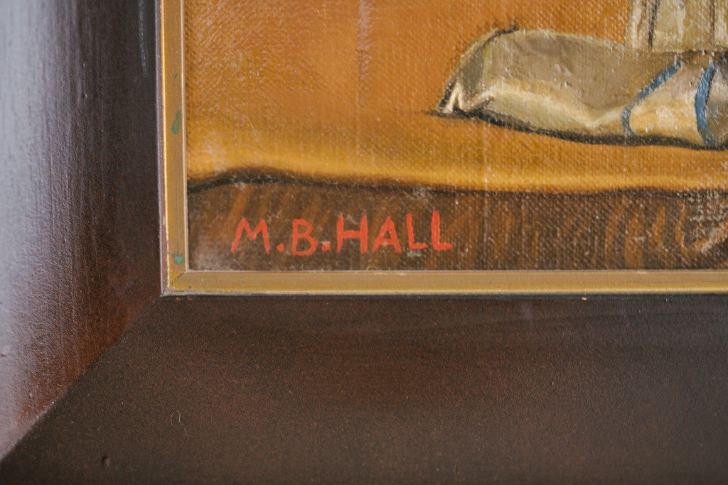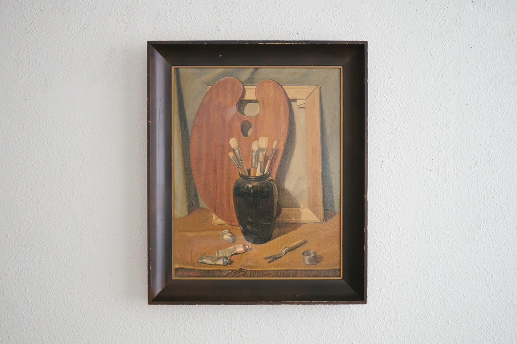style: original, framed, painting supplies, still life, painting material: wood, canvas text: MB HALL age: vintage condition: good, age related wear - see pictures