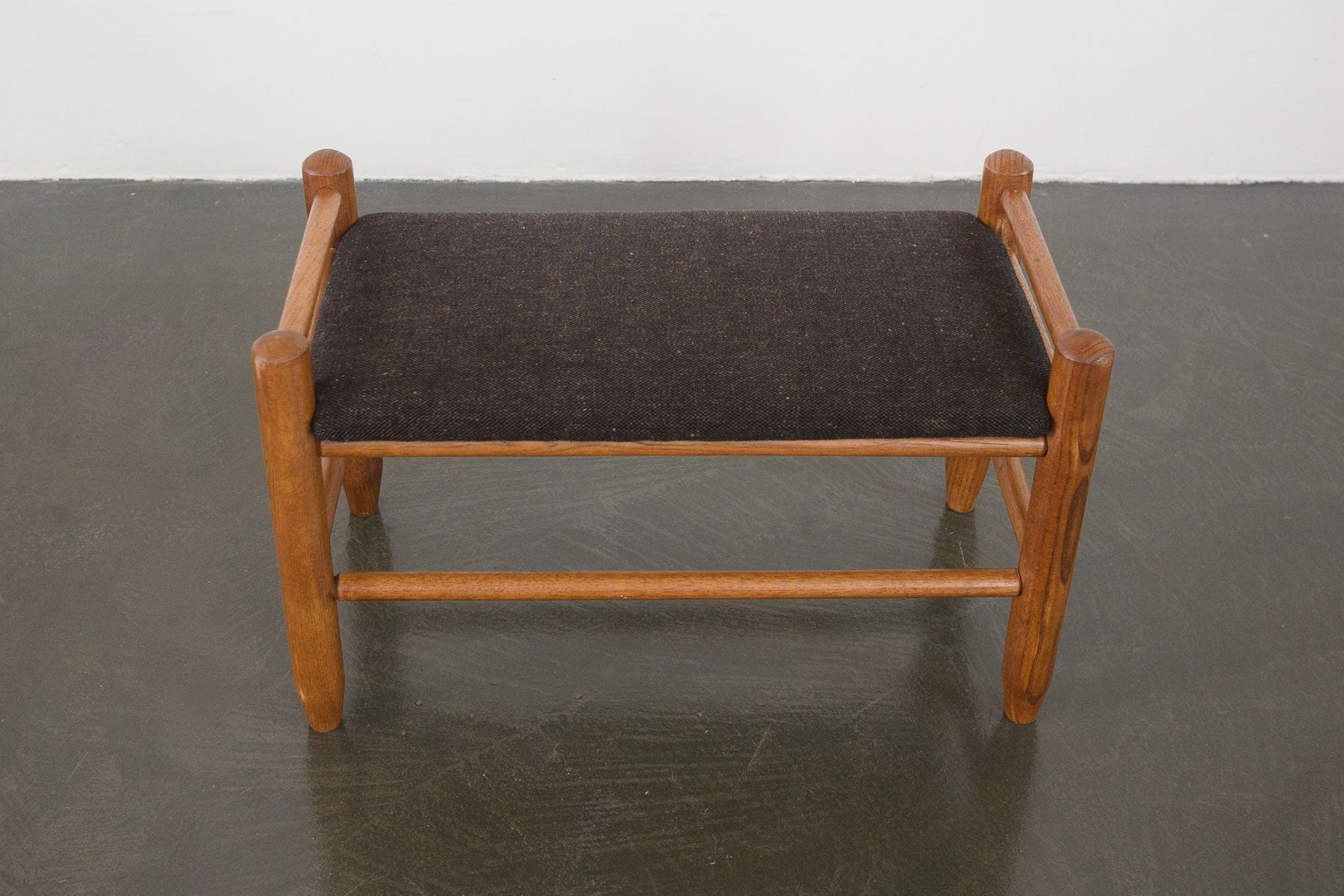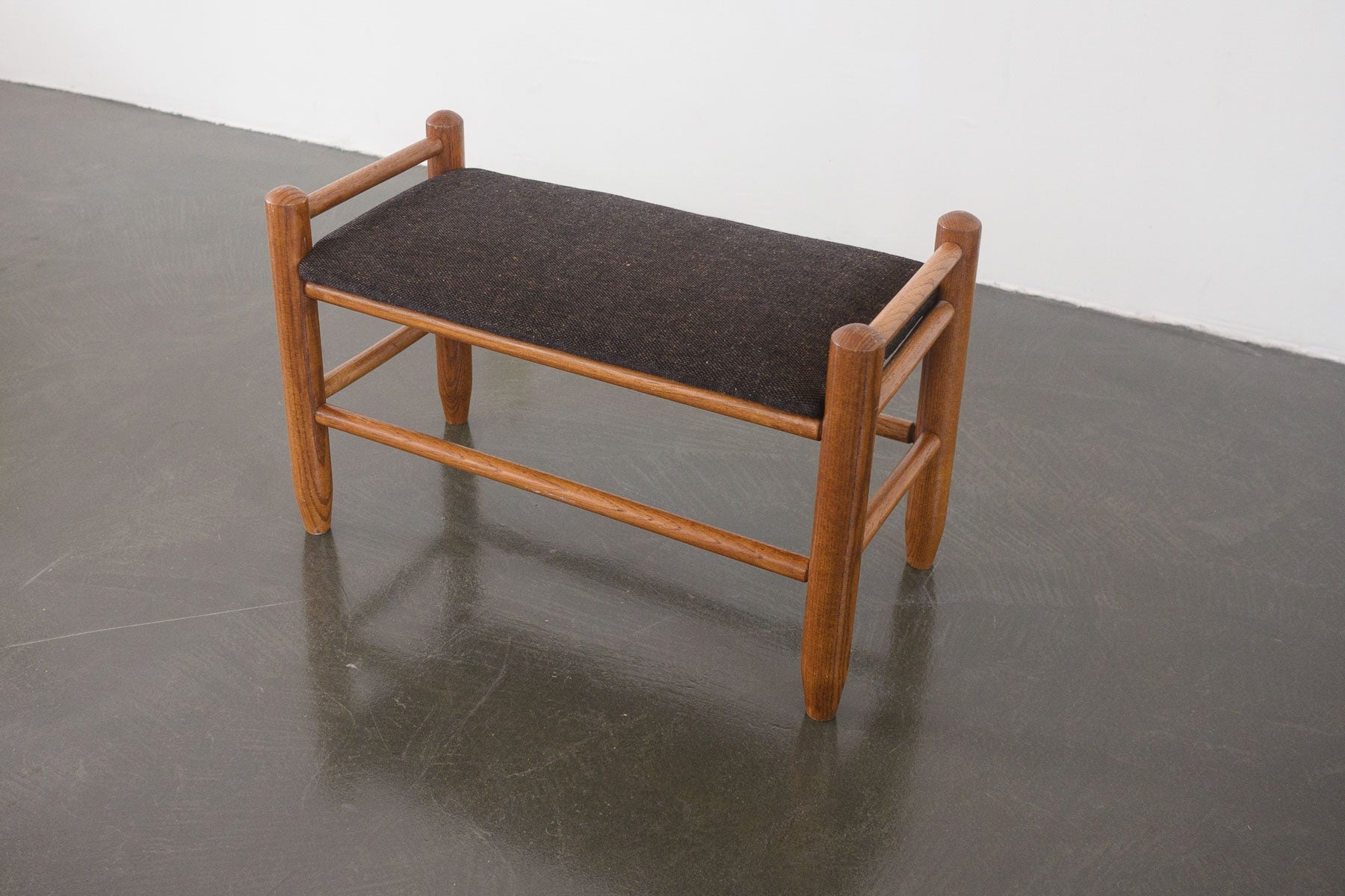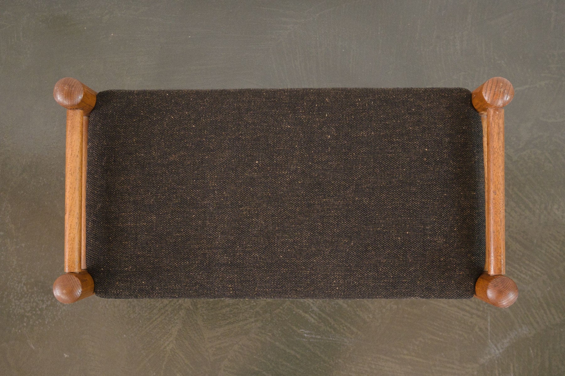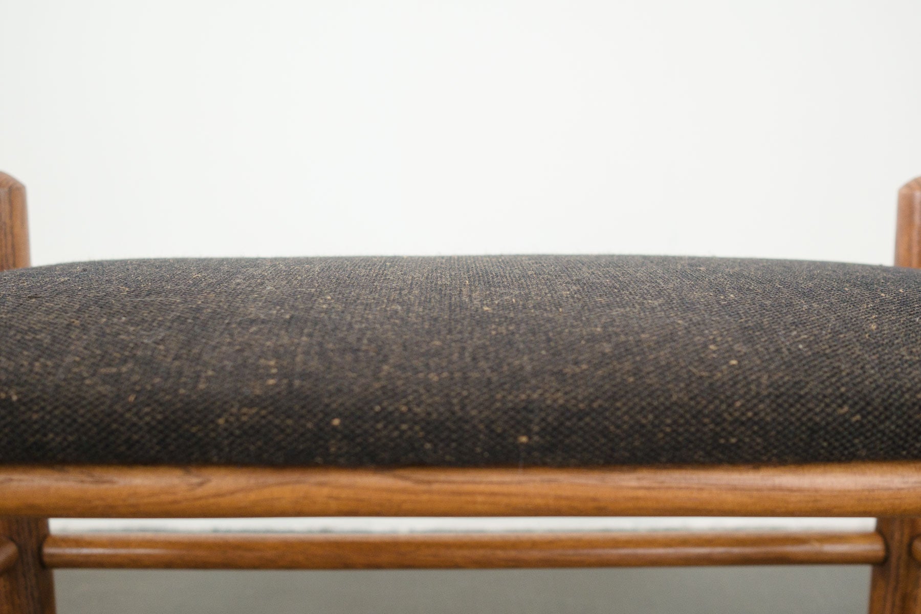 material: wood (walnut), upholstery (gray wool)