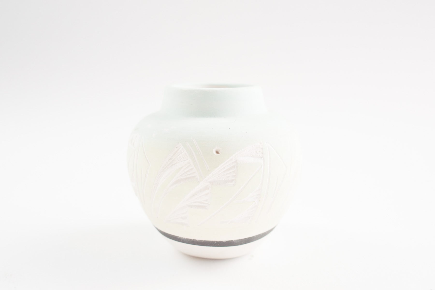 style: etched, hand crafted, pottery, ceramic, flower, bud vase, display