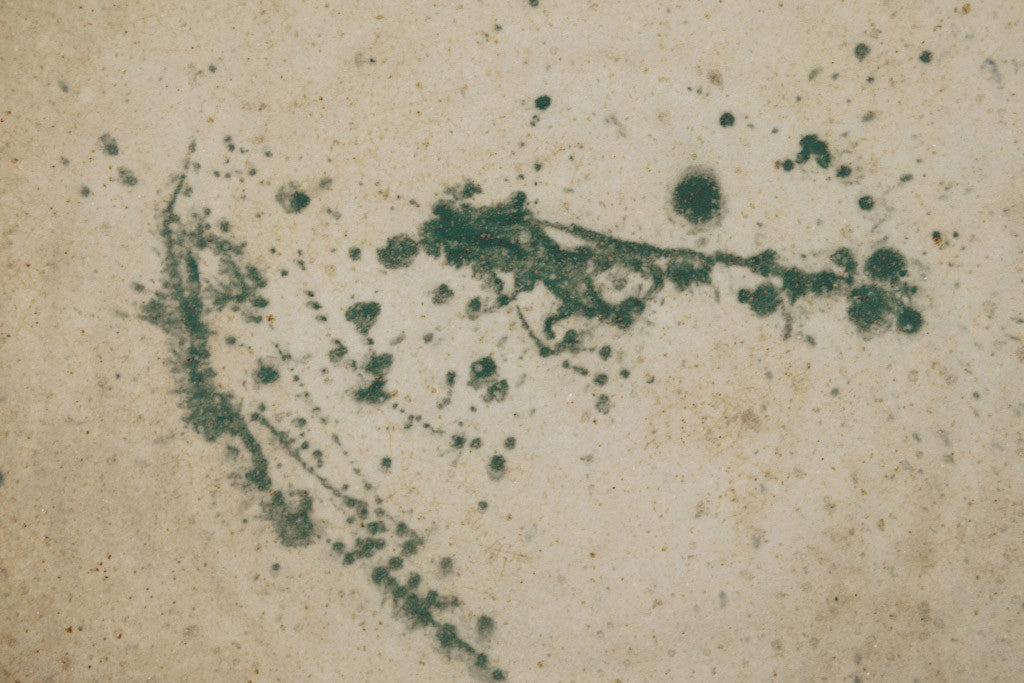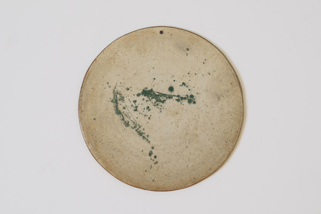 This handcrafted ceramic wall hanging has shades of cream and dark green glaze. It's in great shape with naturally occurring wear. It could also be used as a serving tray or hot plate. See pictures for detailed condition.