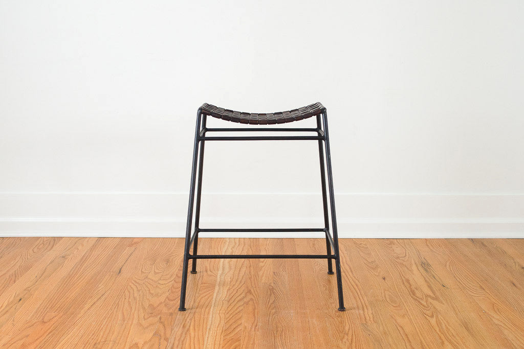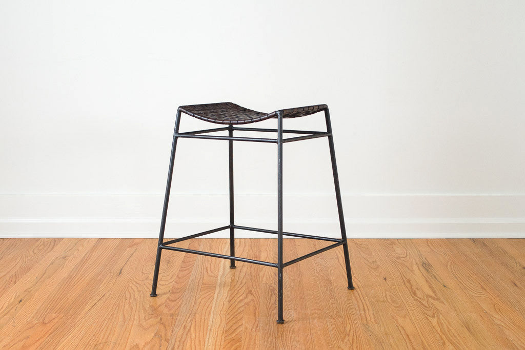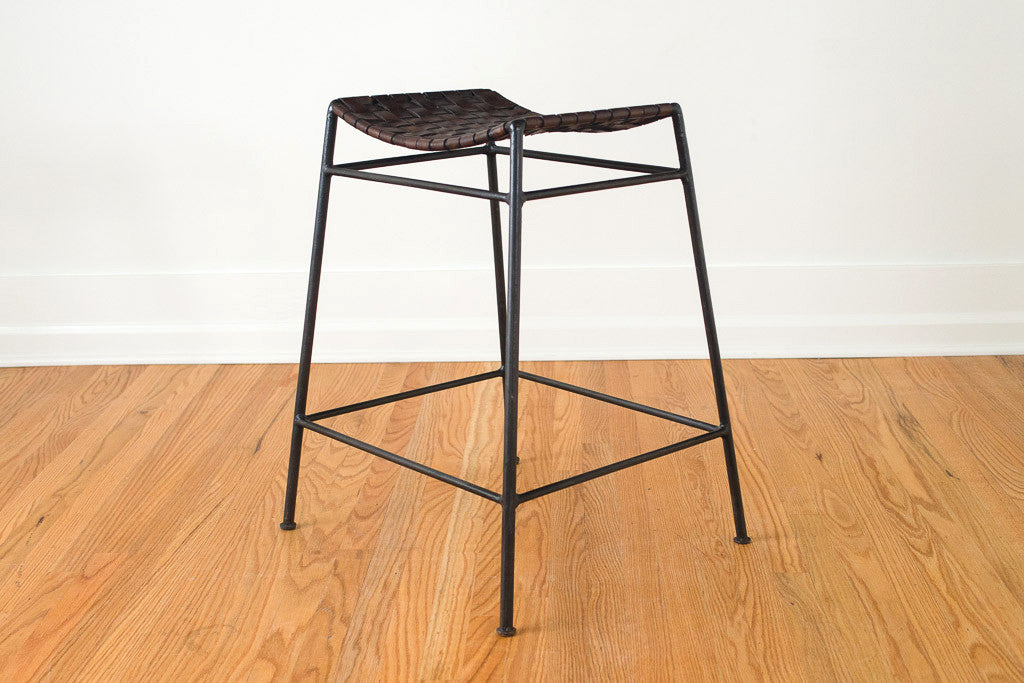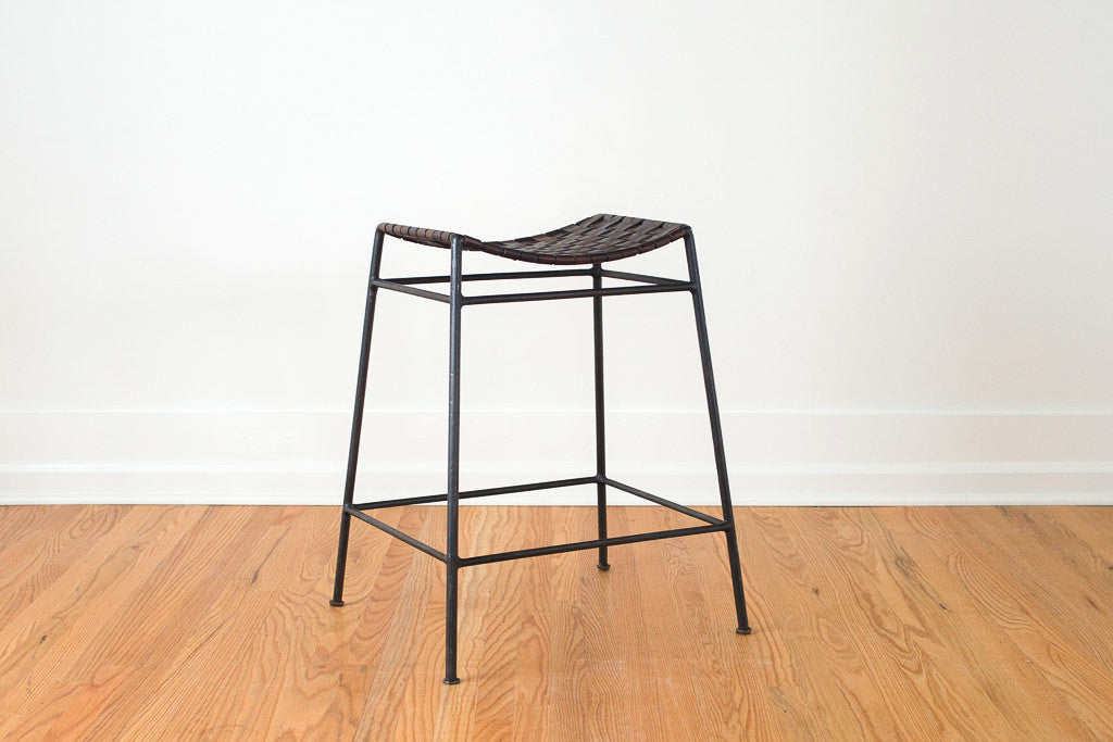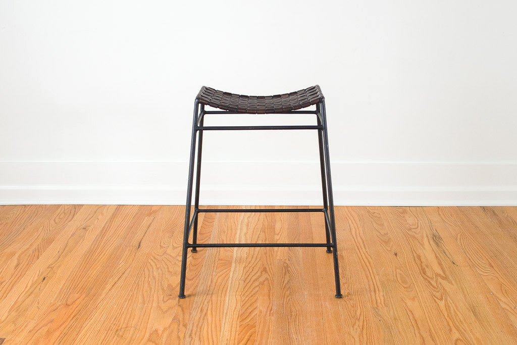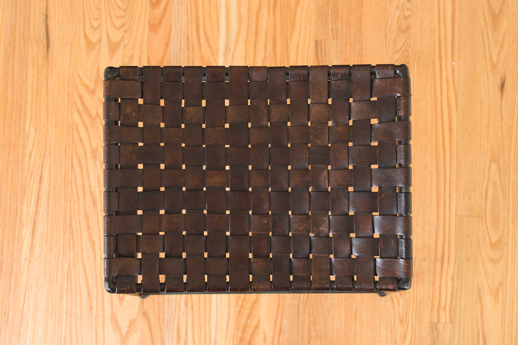 This vintage woven leather and iron stool is in the style of Swift and Monell. We searched for quite sometime for a similar stool online but couldn't find anything exactly like it. We don't know the exact age or manufacturer. The leather is high quality with a nice patina that suggests this is indeed an older piece. The black iron shows light wear.