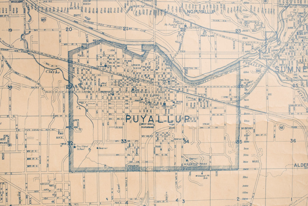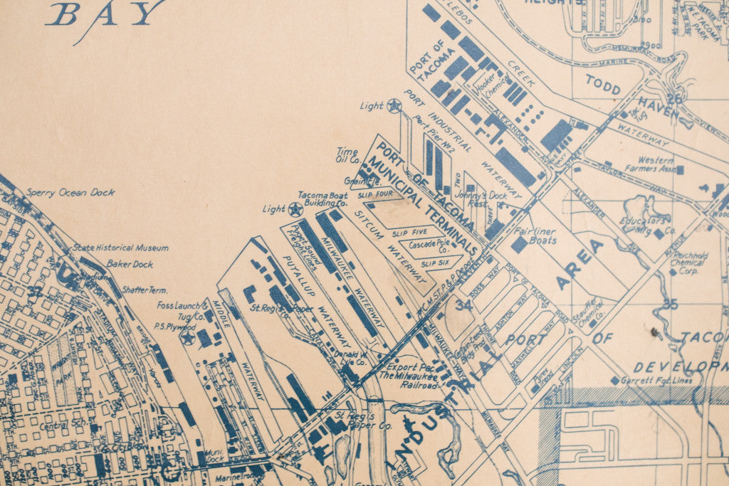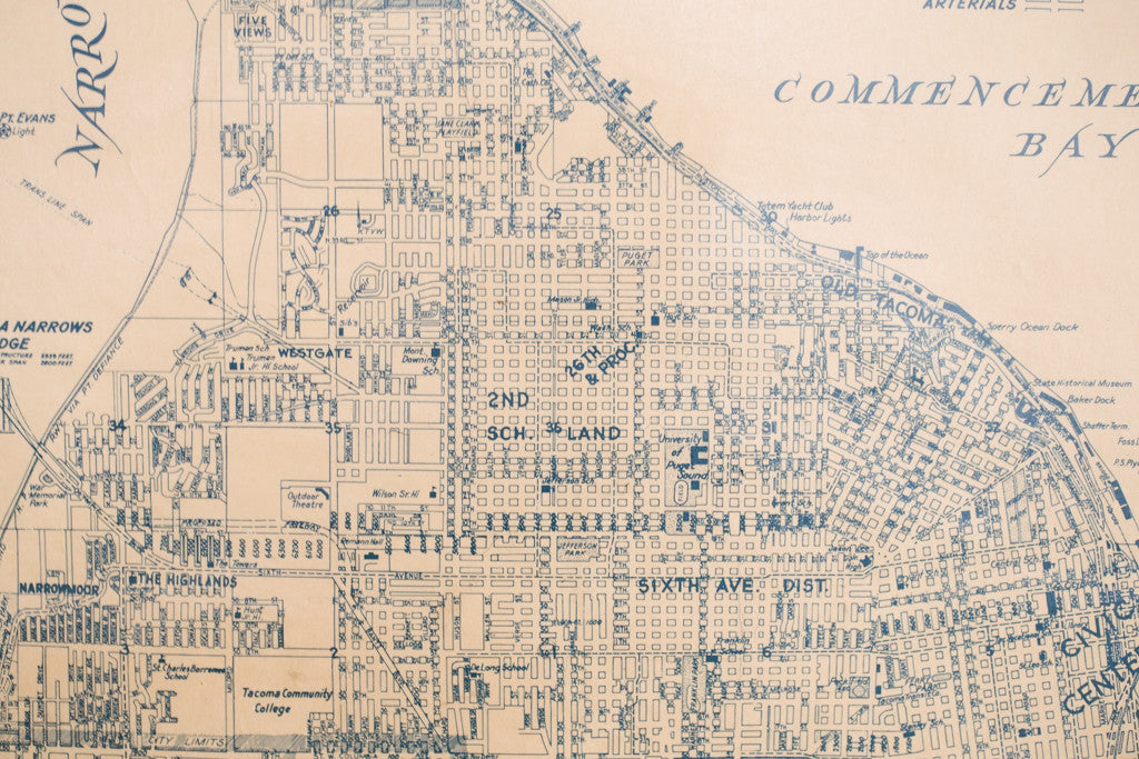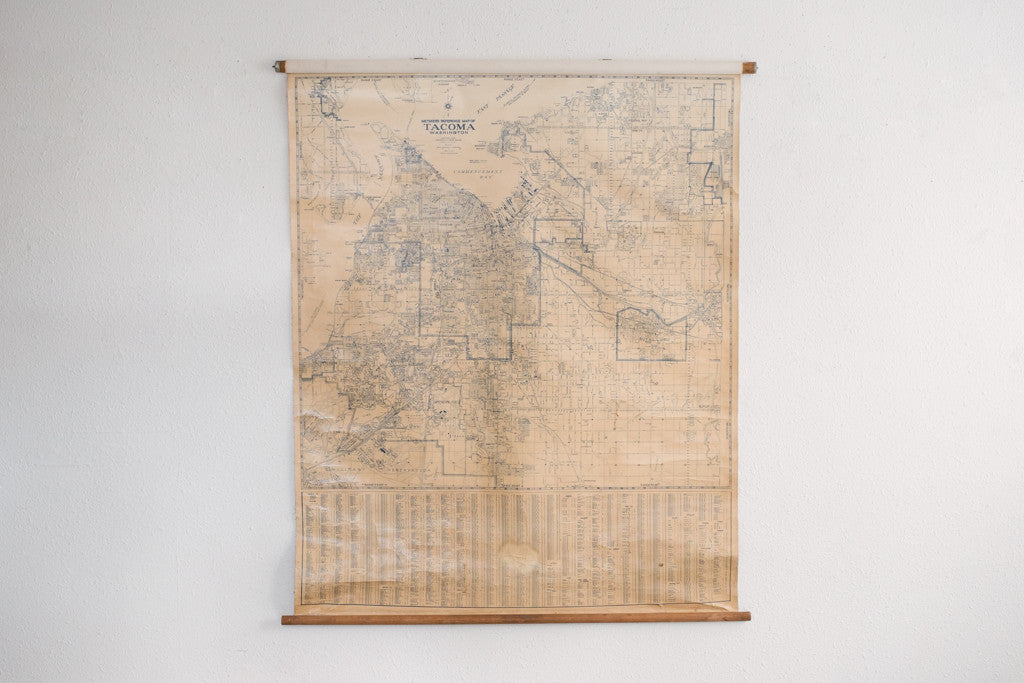 style: Mid Century, schoolhouse, educational, industrial material: coated paper, metal text: Metsker's Refrence Map of Tacoma Washington age: vintage condition: age related wear - see pictures