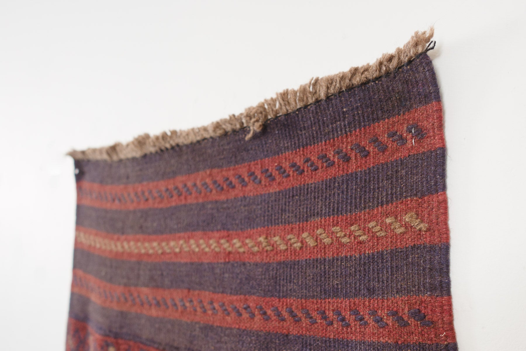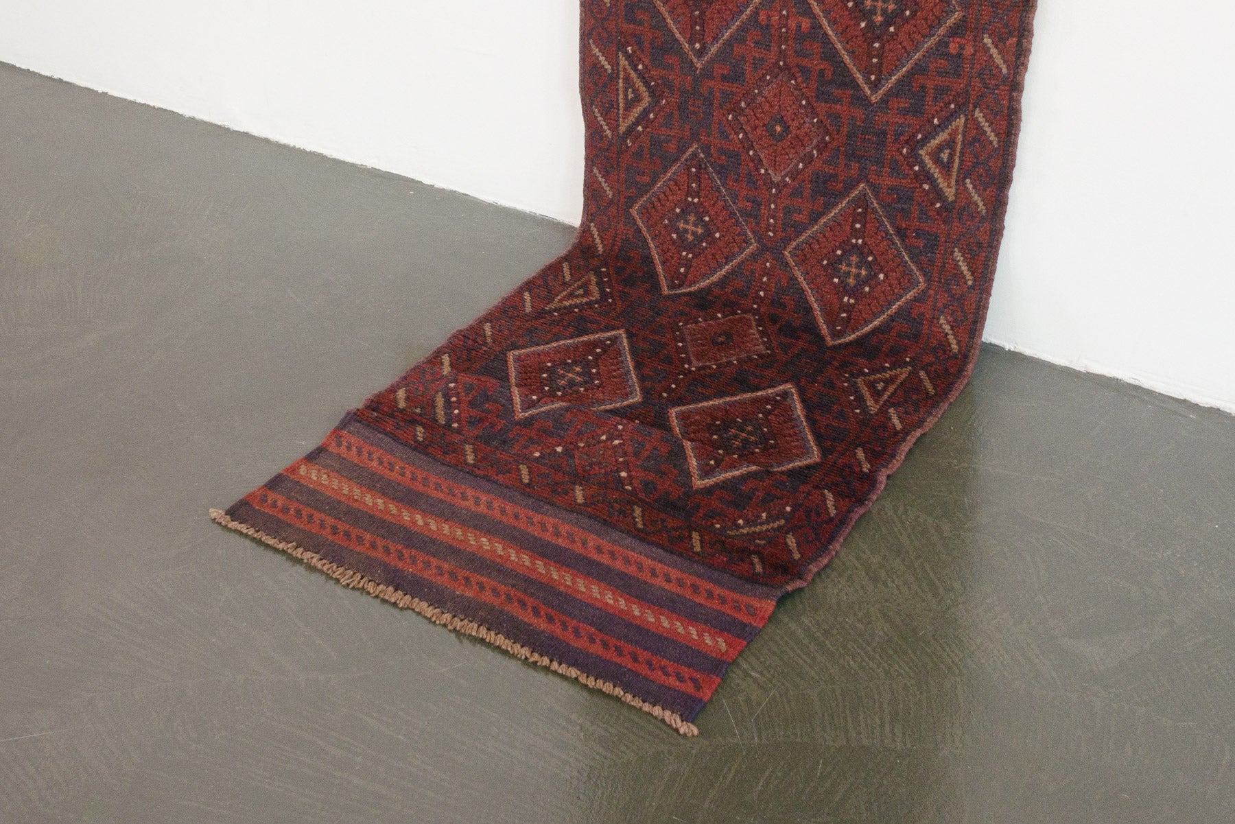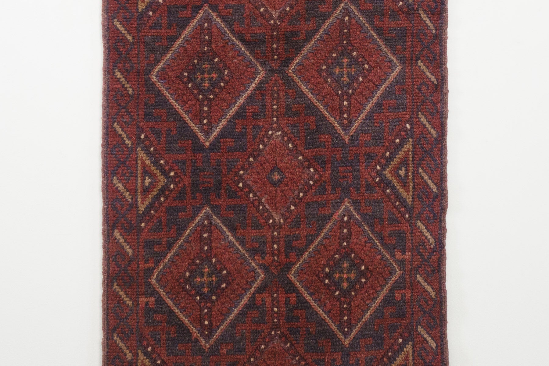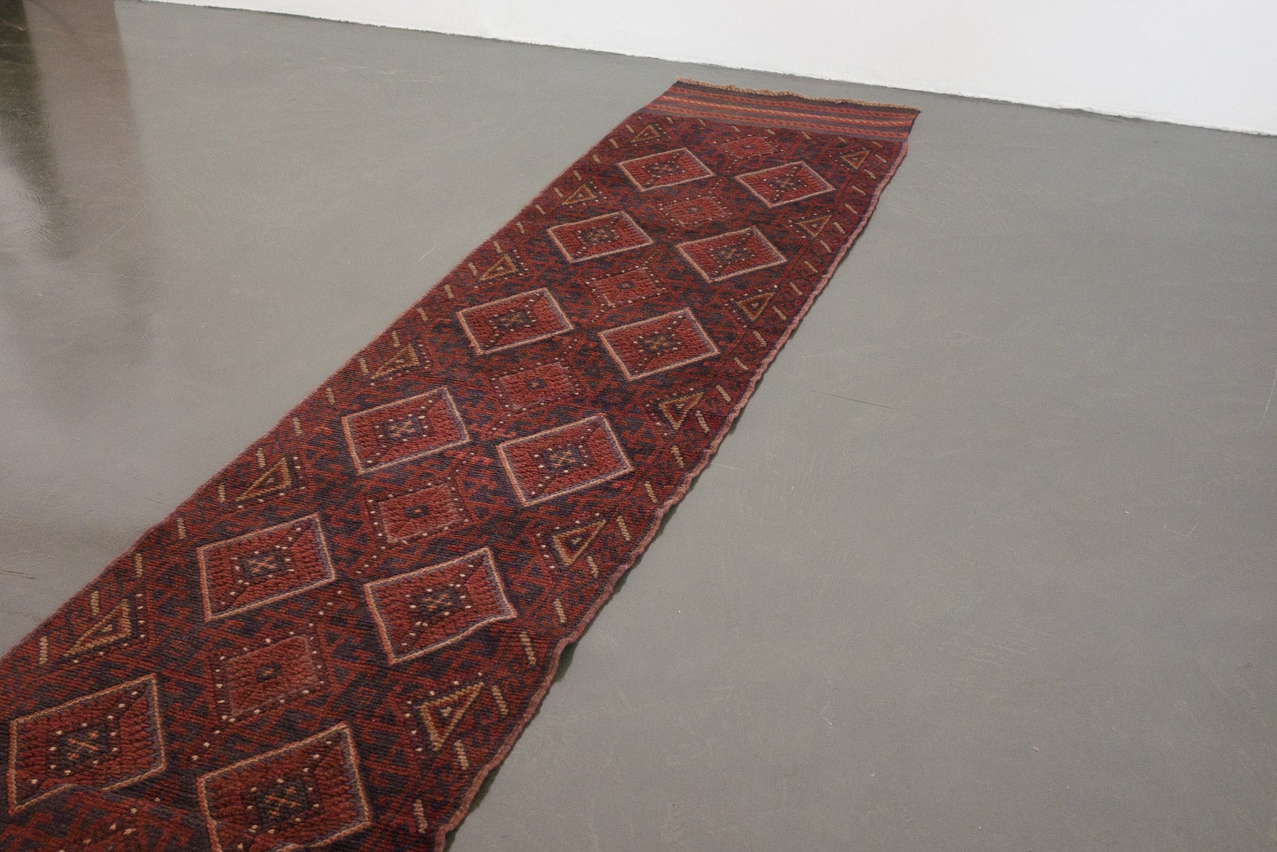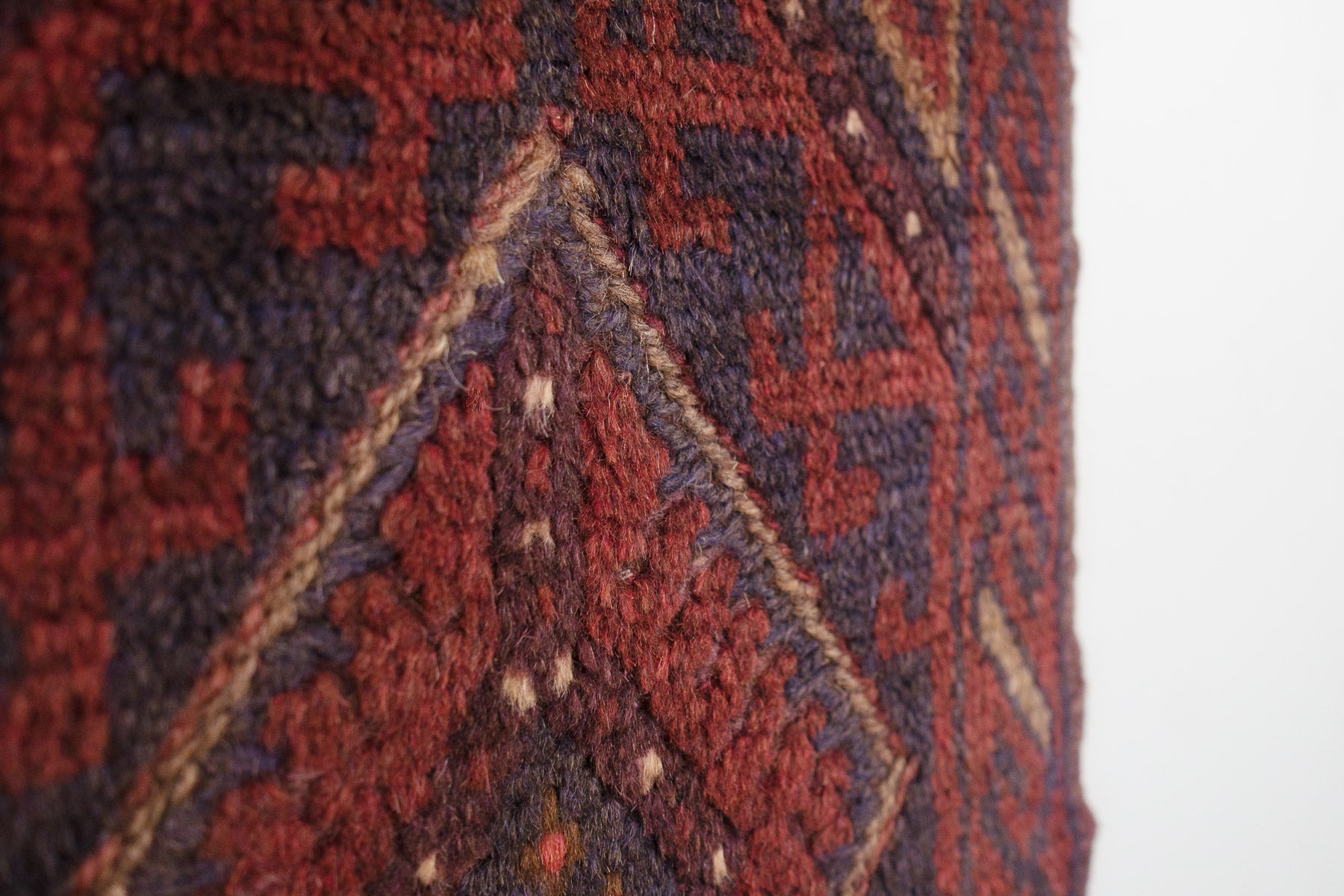 name: Sarbanorigin: Afghanistan, Tajikstyle: rug, runner, carpetmaterial: hand knotted woolcolors: red, navy, camelage: vintagecondition: good, age related wear - see picturesappraised value: $620
