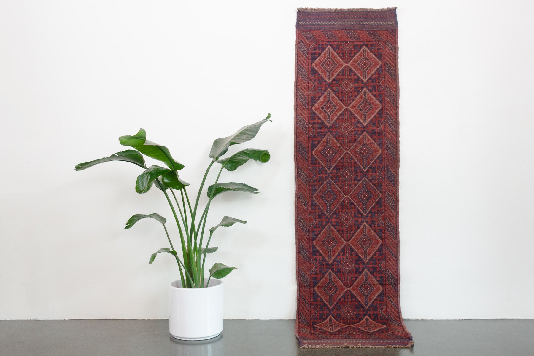 name: Sartororigin: Afghanistan, Tajikstyle: rug, runner, carpetmaterial: hand knotted woolcolors: red, navy, camelage: vintagecondition: good, age related wear - see picturesappraised value: $652