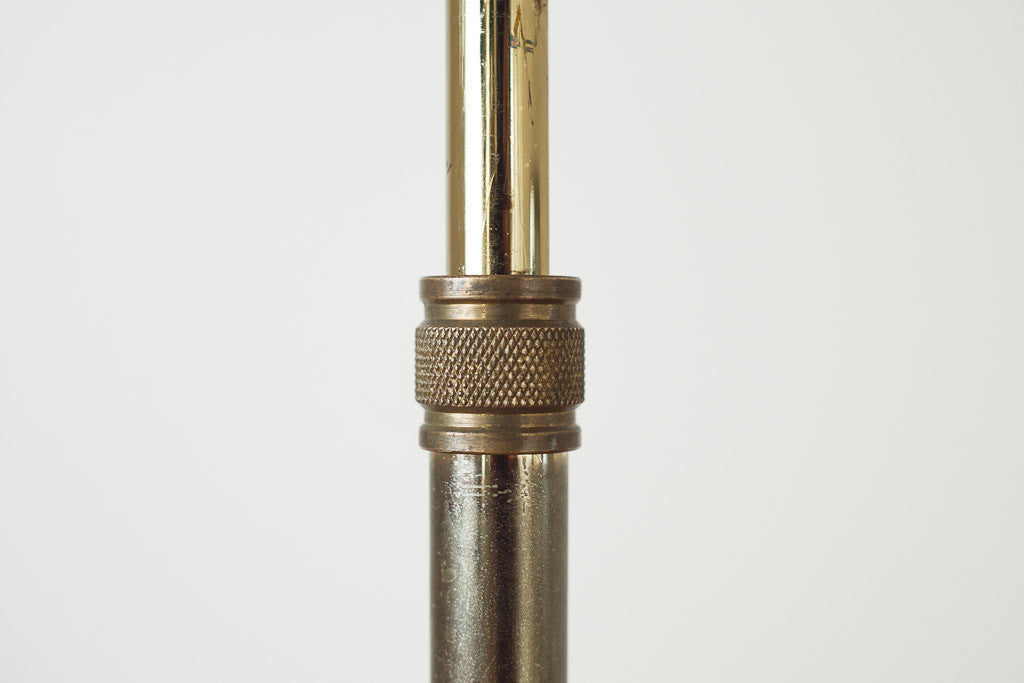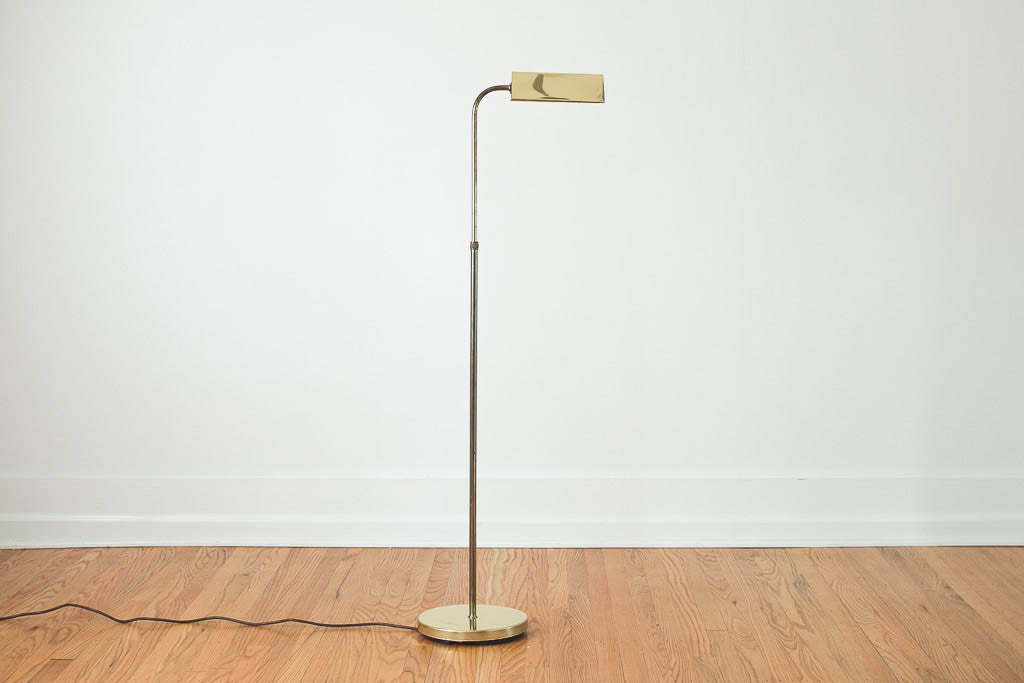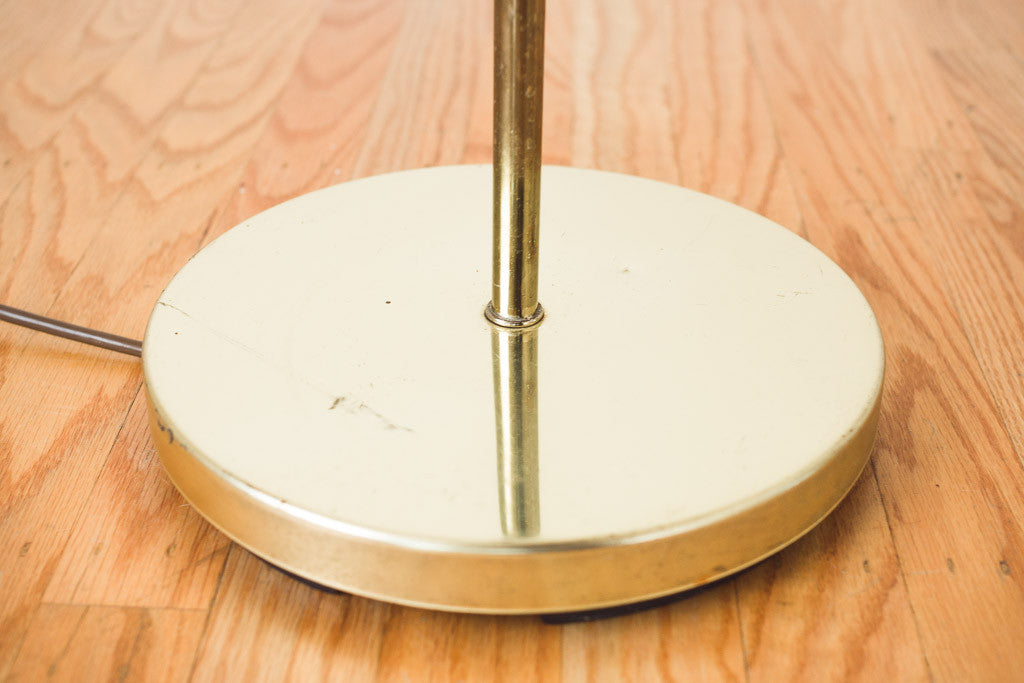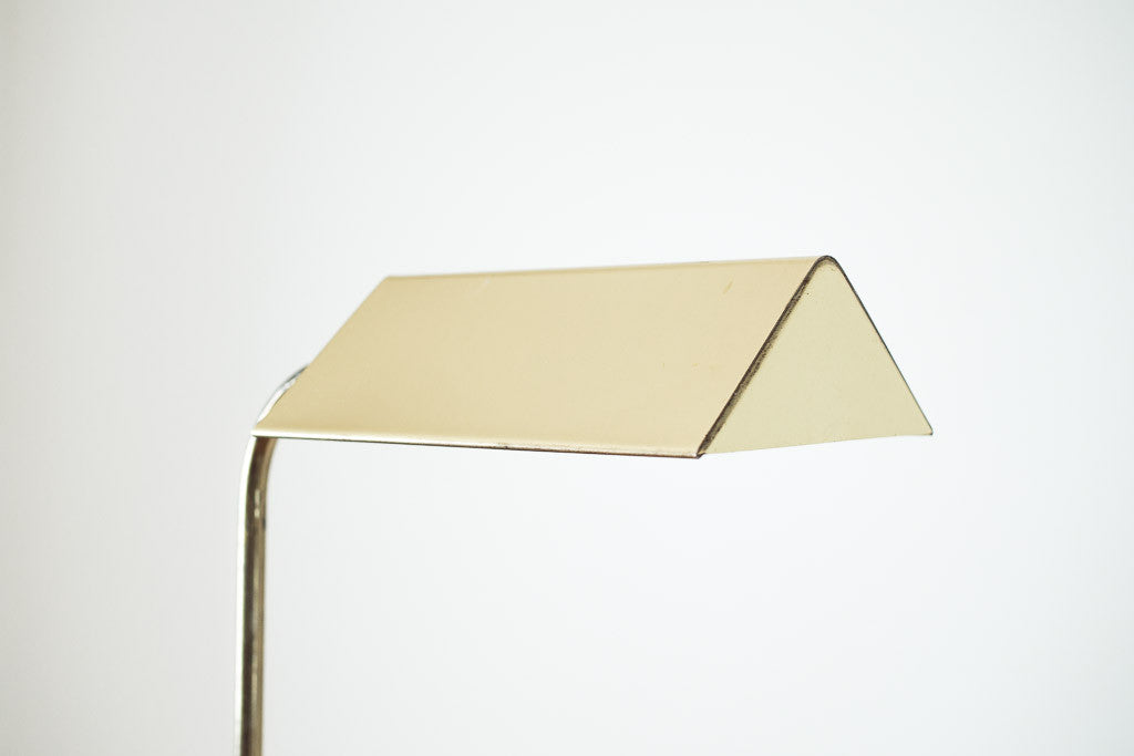 This vintage gold triangle lamp is adjustable in height and direction. It's in good shape with age related distressing and wear. See pictures for detailed condition.