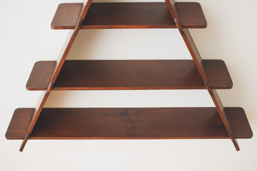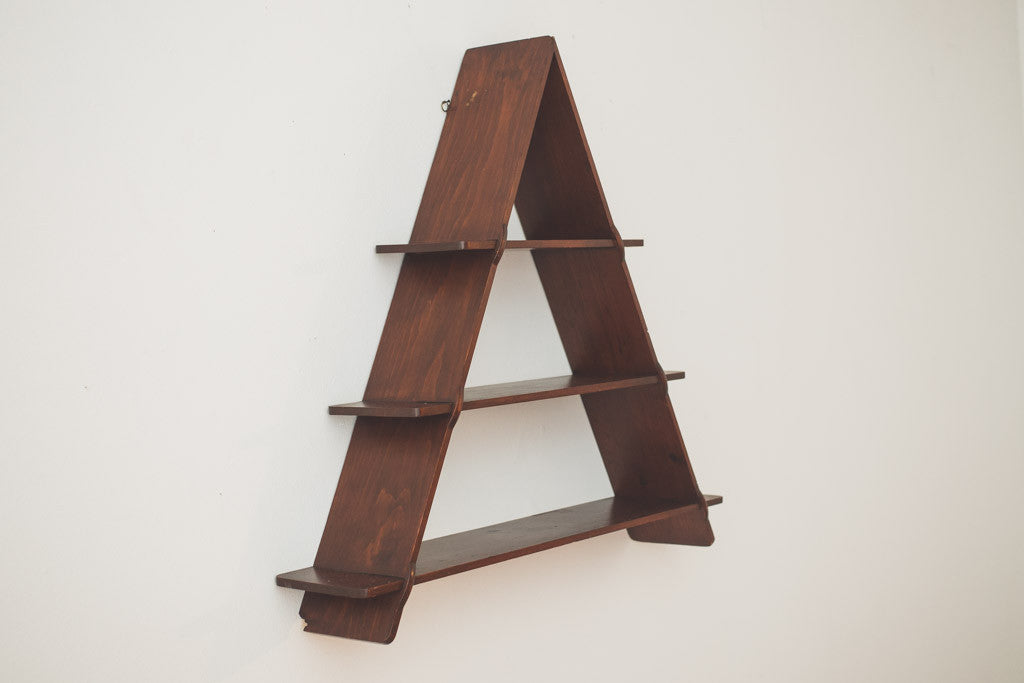This vintage wood wall shelf has three tiers and two hooks for mounting. It's in good overall shape with age related wear. See pictures for detailed condition.