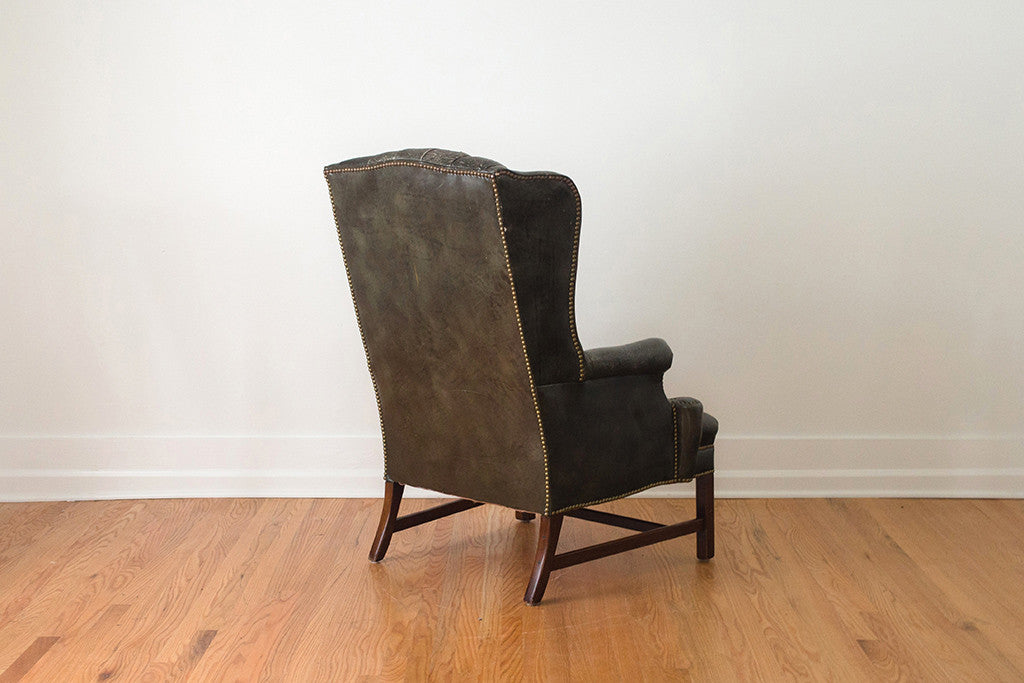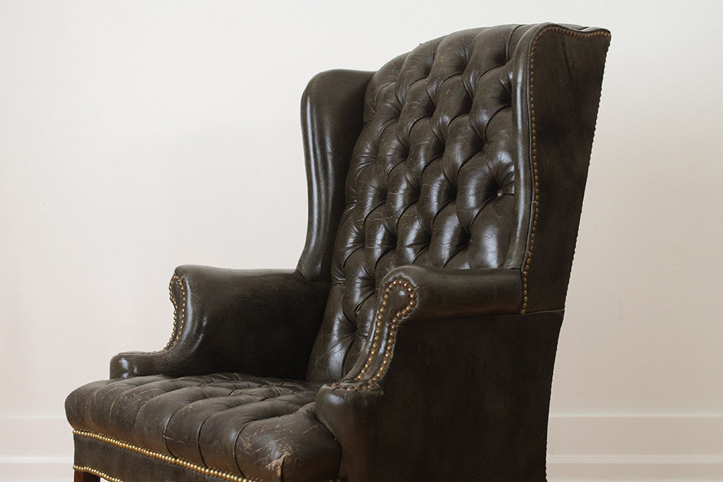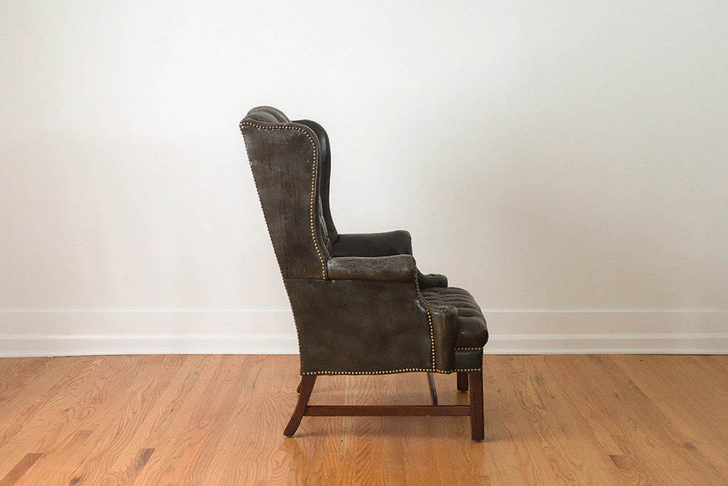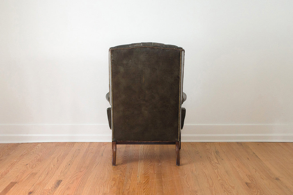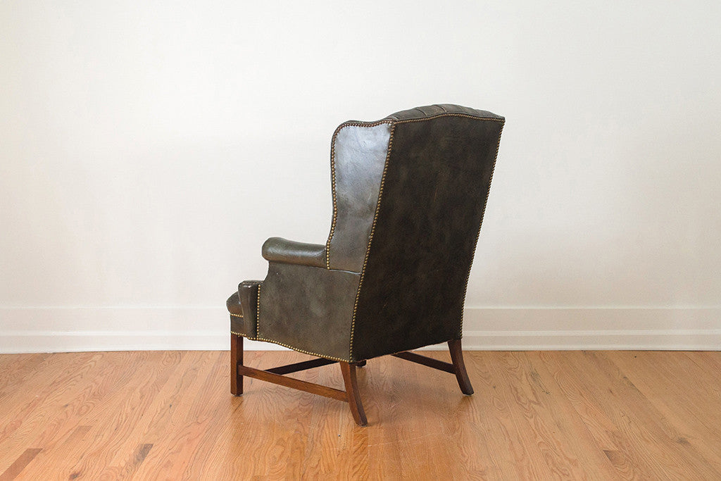 This vintage wingback chair is from our personal collection. It's upholstered in a perfectly distressed green leather. It has brass nailhead accents and dark wood legs.