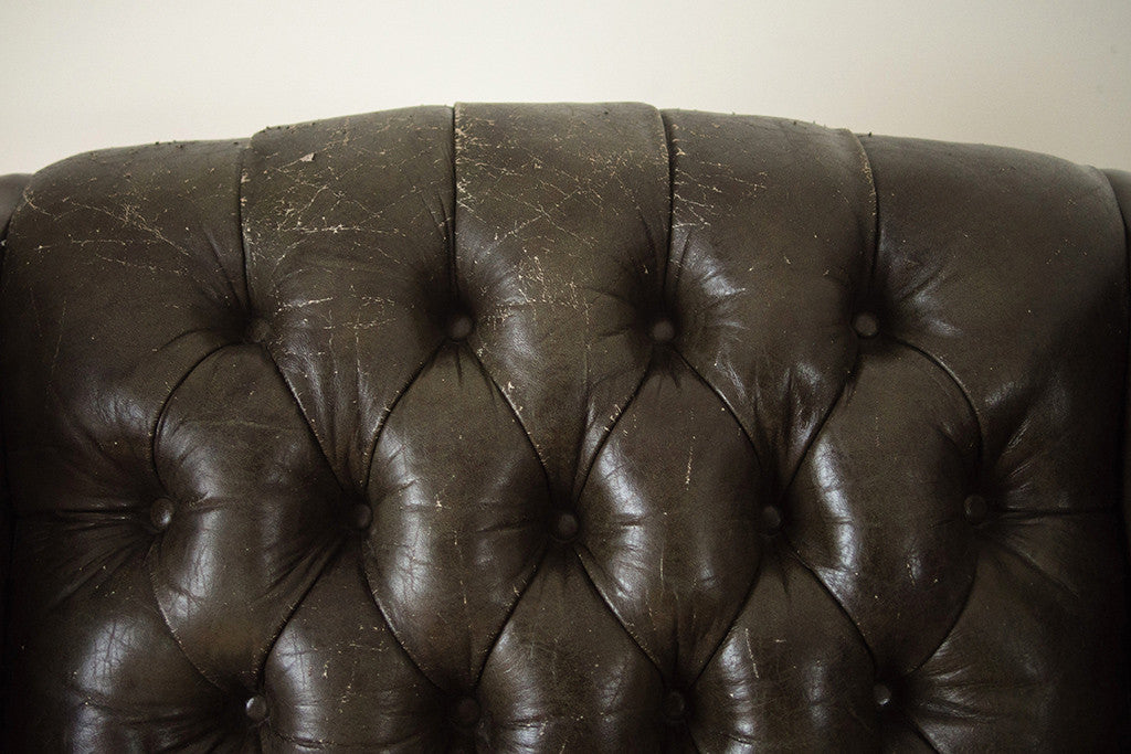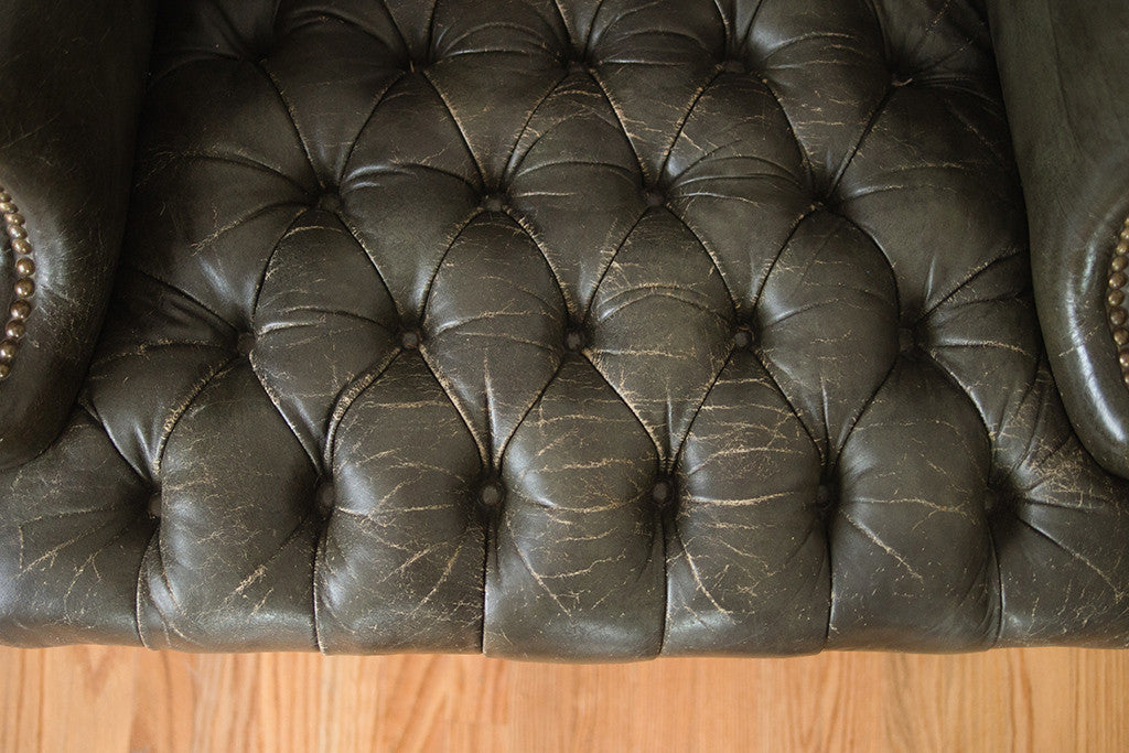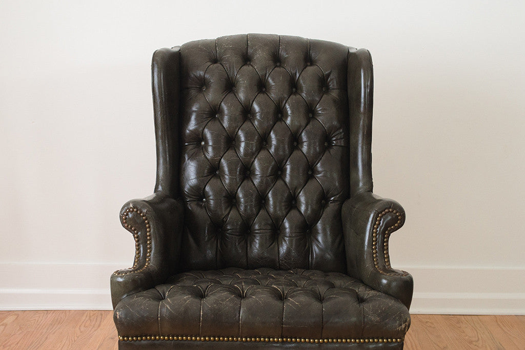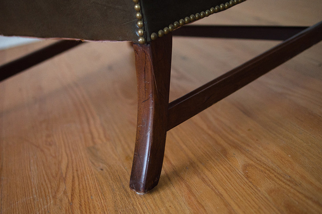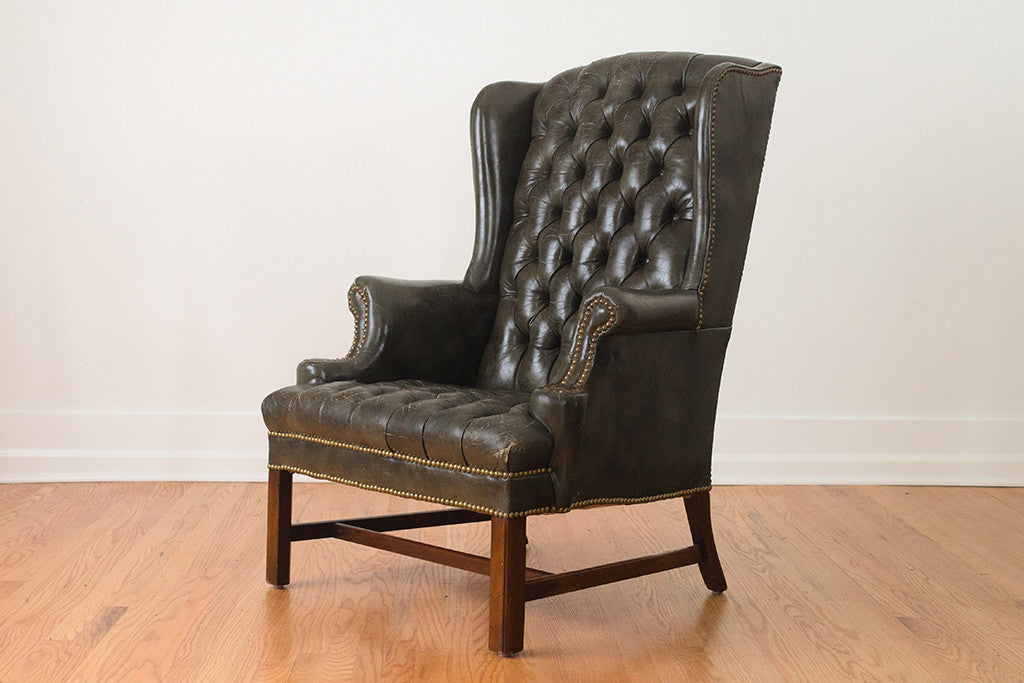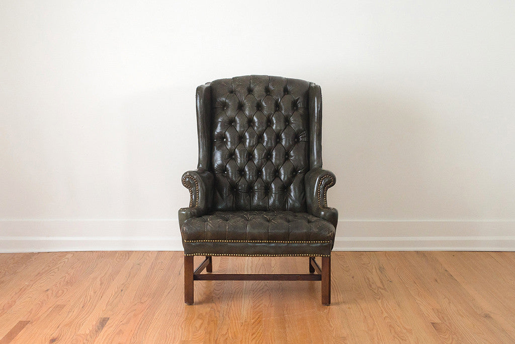 This vintage wingback chair is from our personal collection. It's upholstered in a perfectly distressed green leather. It has brass nailhead accents and dark wood legs.