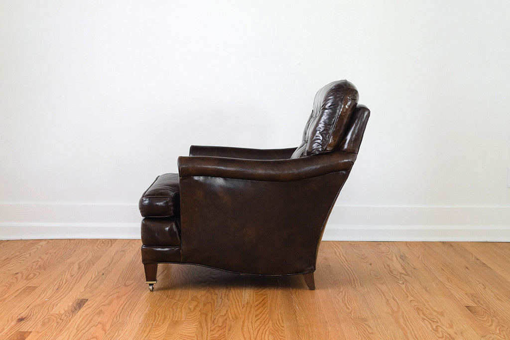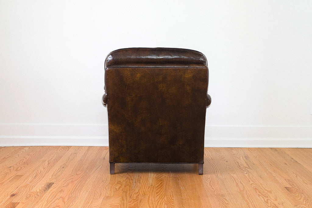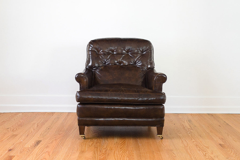 This handsome vintage leather club chair is unmarked but was most likely made by Schafer Bros. or Drexel. It's a dark brown tufted leather roll arm style with brass casters. The leather upholstery is in great shape with a lightly distressed finish from years of natural use and one tiny repair on the right side. It's a very comfortable chair, great for watching tv or reading a book.