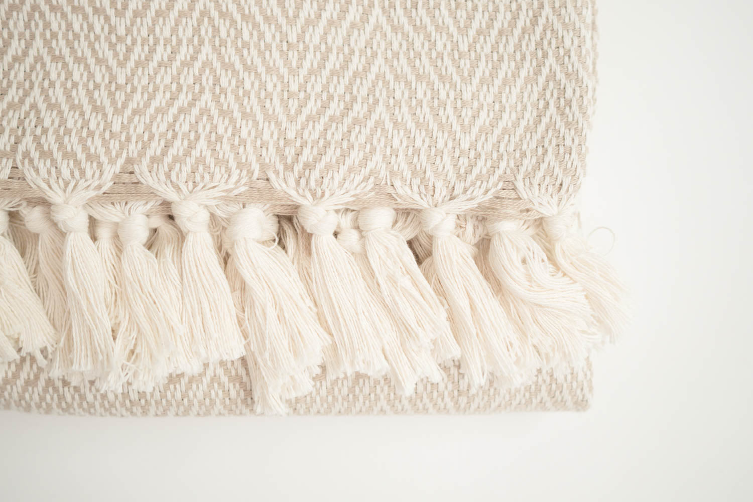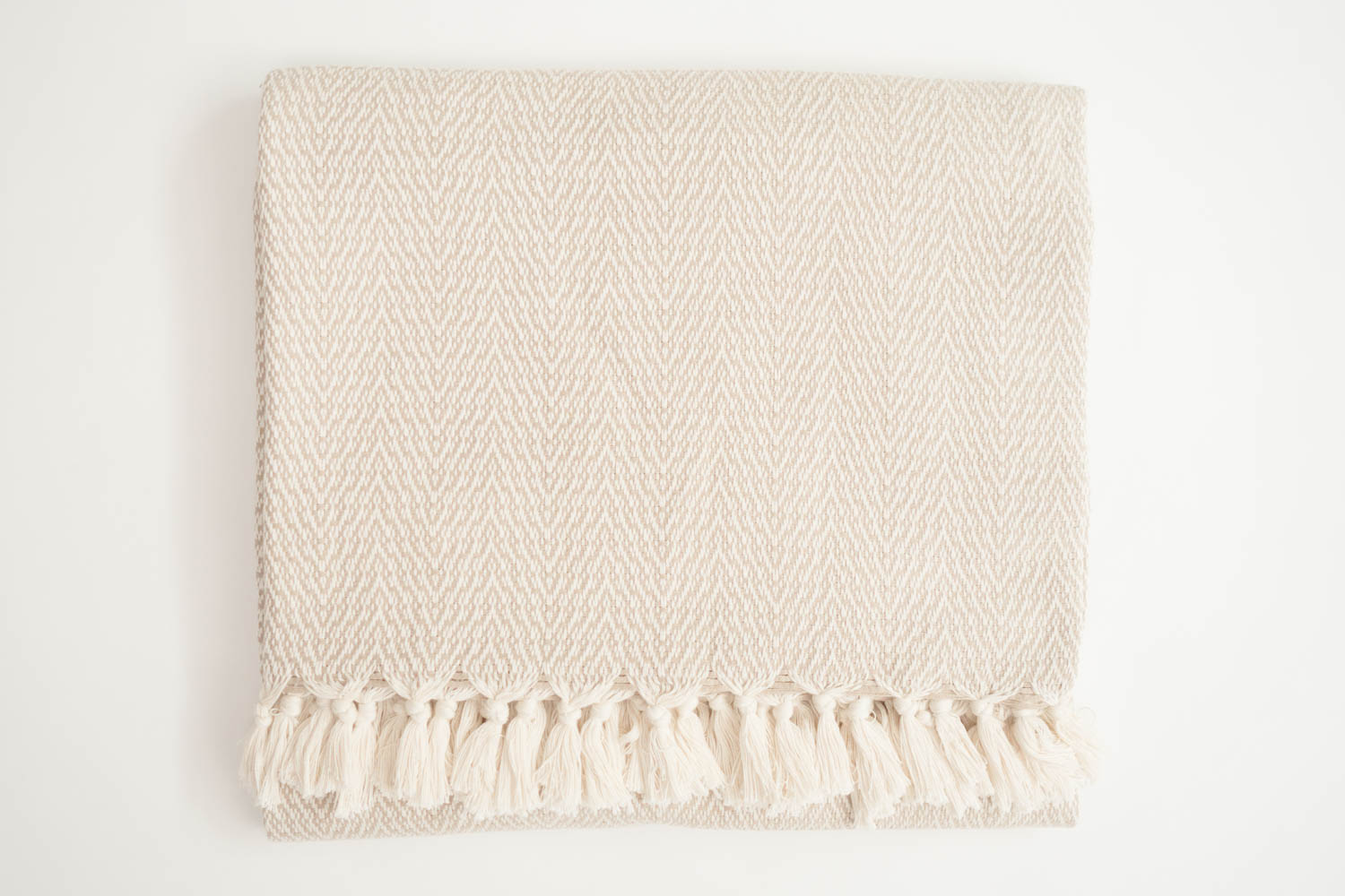 style: Turkish, peshtemal, woven, blanket, throwmaterial: cottoncolors: white, tan - zig zag twillage: newcare: machine wash cold, tumble dry lowsku: tb-11
