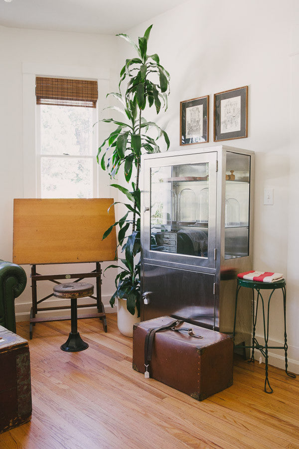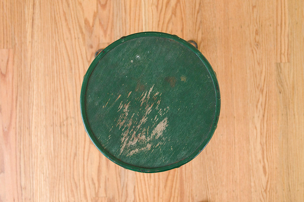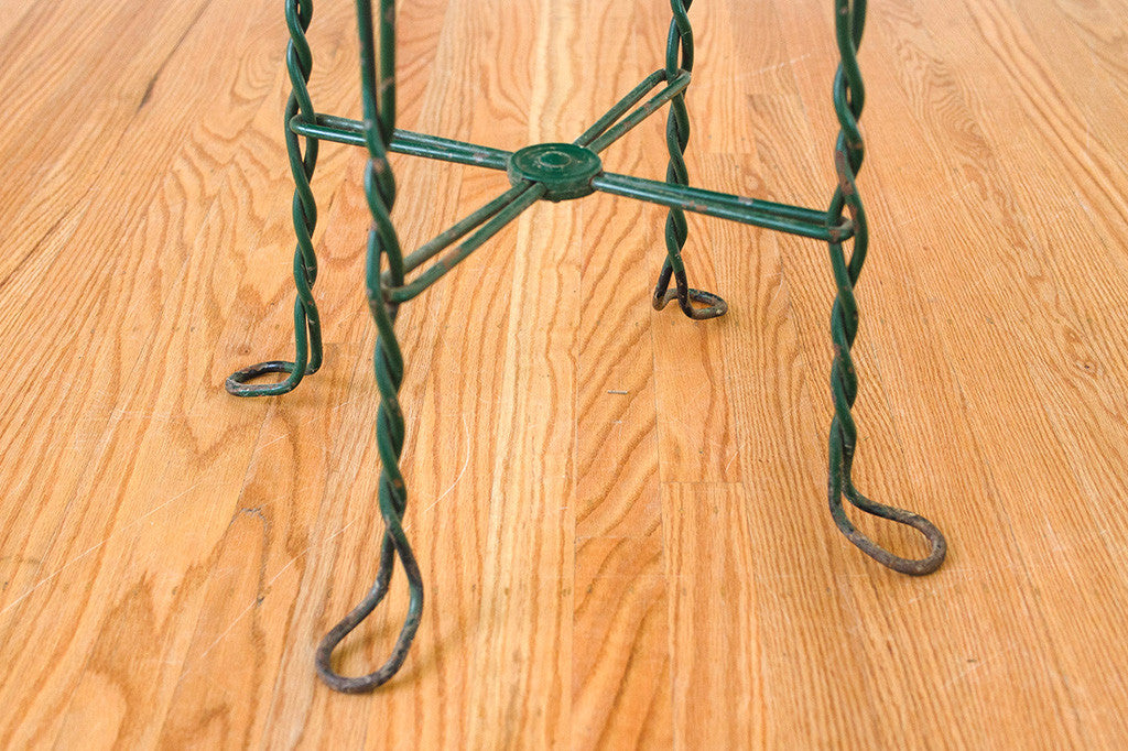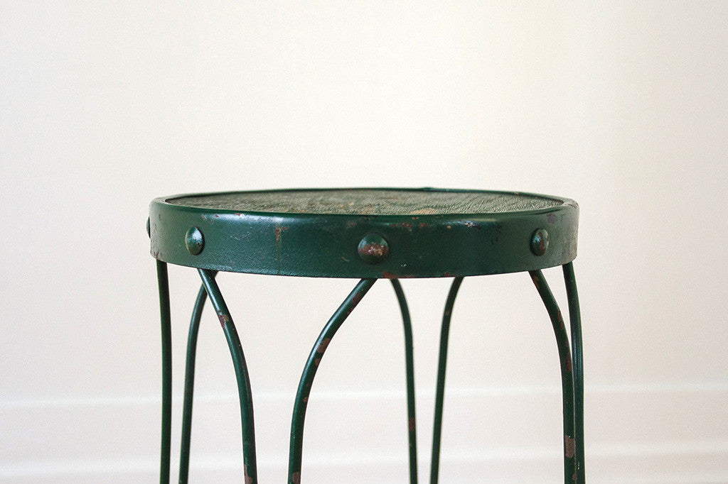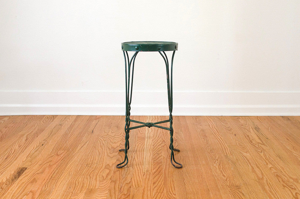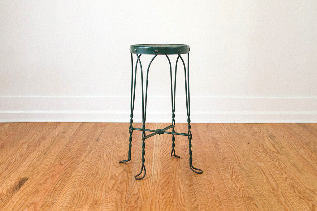 This vintage ice cream/soda shop stool would be perfect with a drafting table or at a kitchen island. It could also be used as a plant stand or side table. It has a distressed green finish with a twisted iron base, comfortable foot rest and wood seat. Please see pictures for detailed condition of this piece.