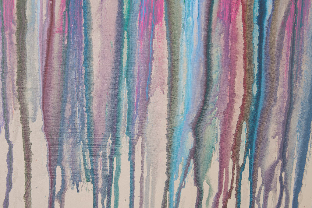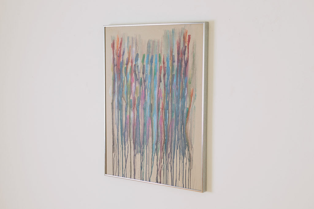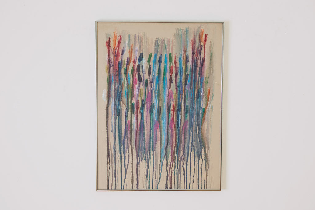 This vintage abstract piece has bright multi-color paint on canvas with a chrome frame. It's in great shape with age related wear. See pictures for detailed condition.